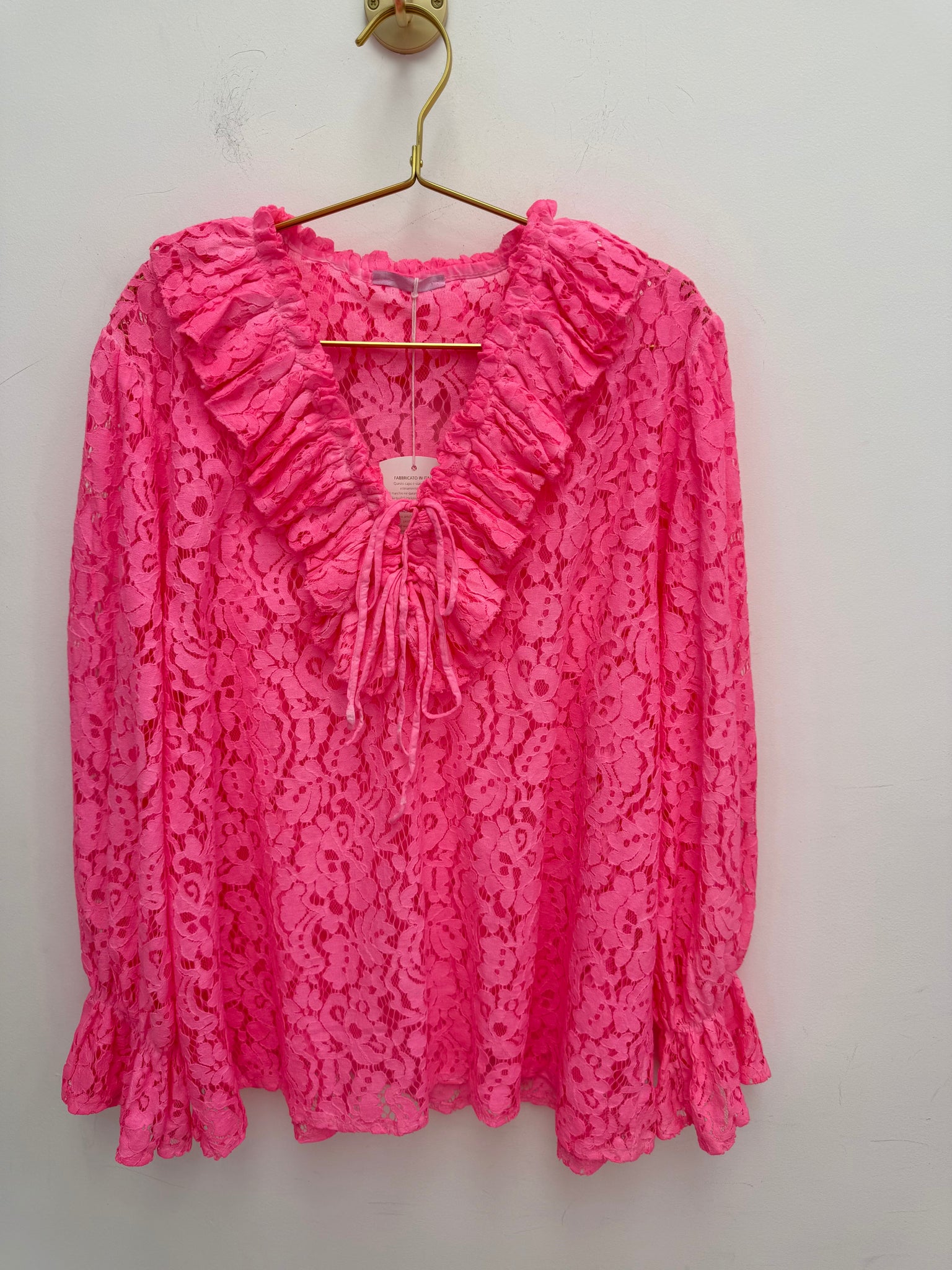 Stunning soft lace ruffle neckline top with adjustable ties and stretch frill cuffs.