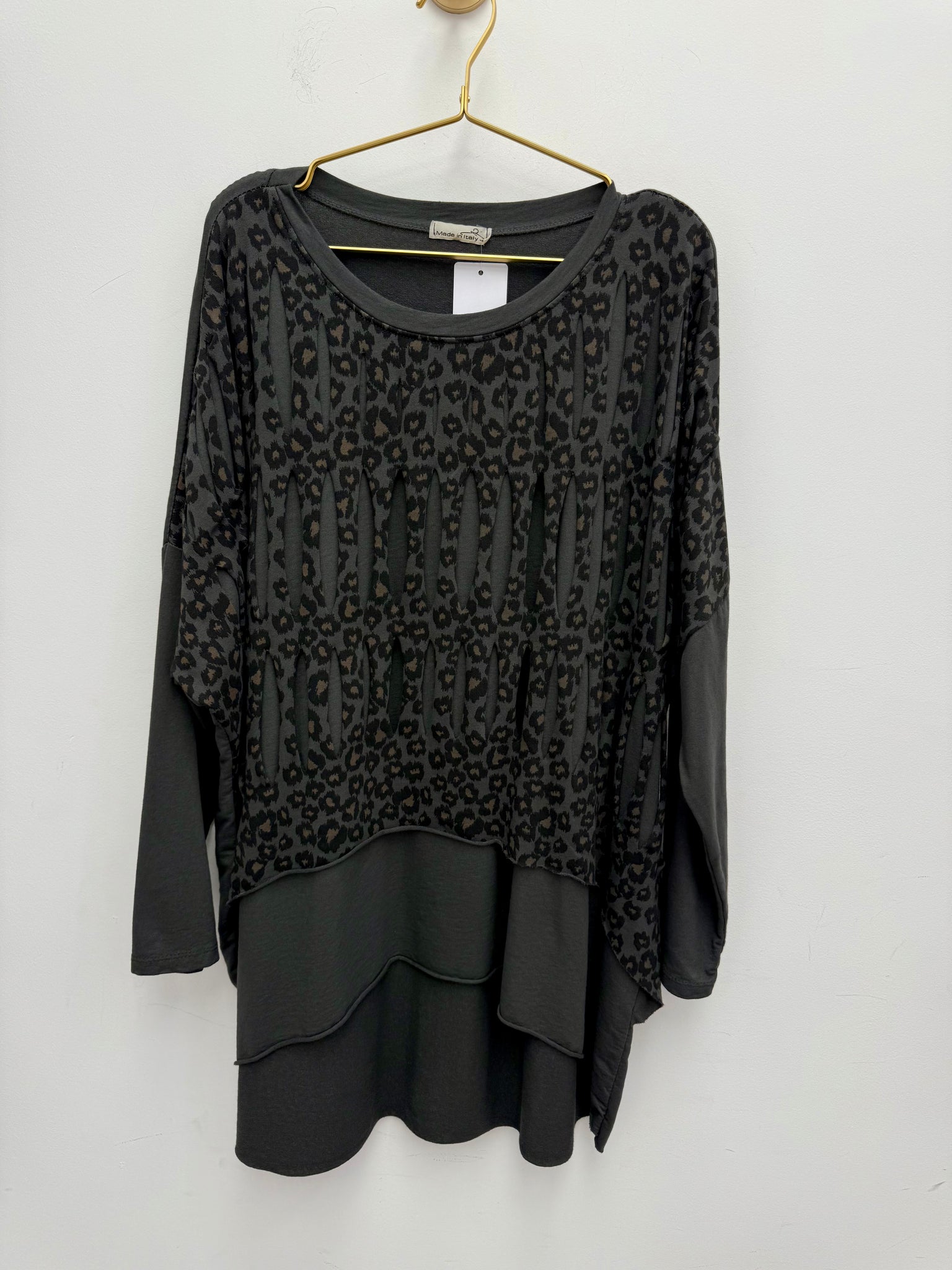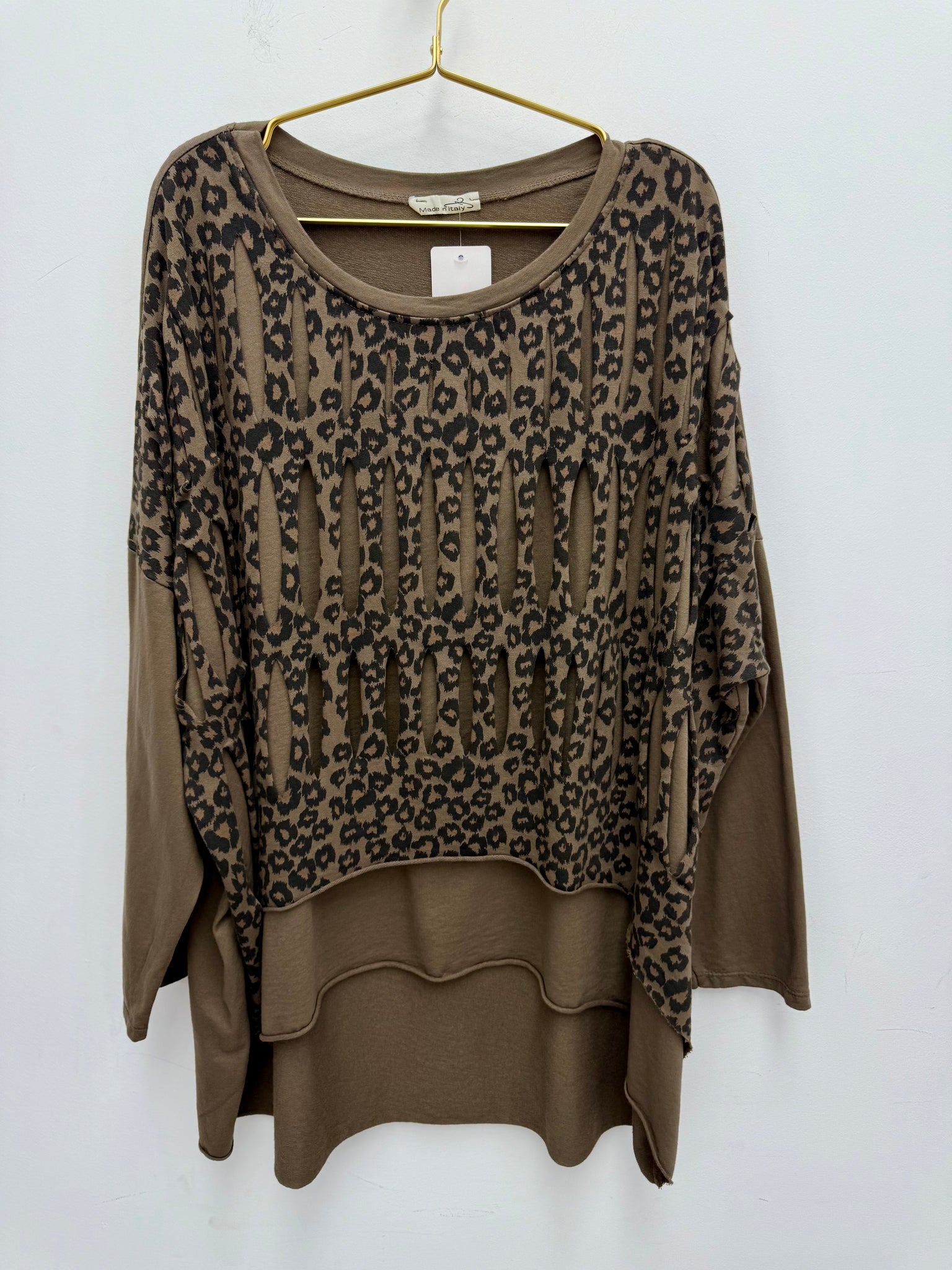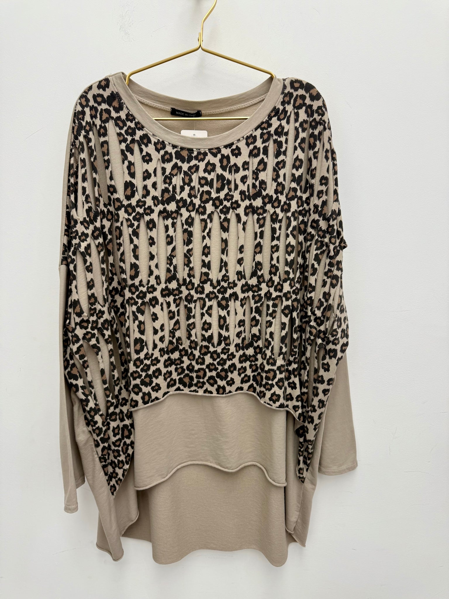 Gorgeous stretch cotton oversized dip back top with slash leopard print layer.