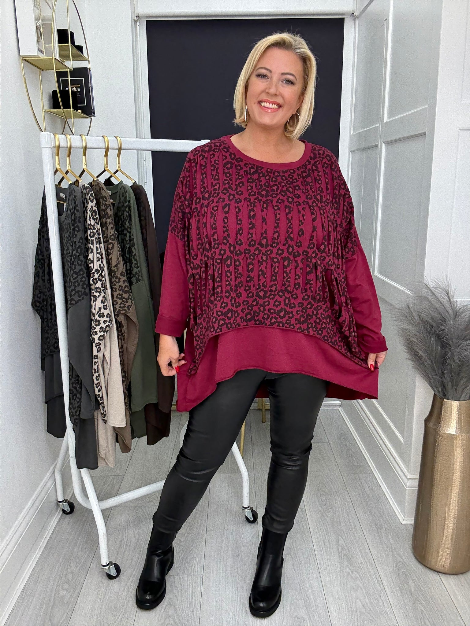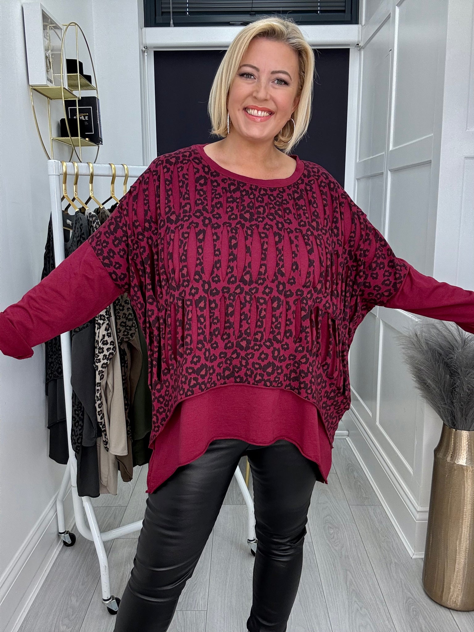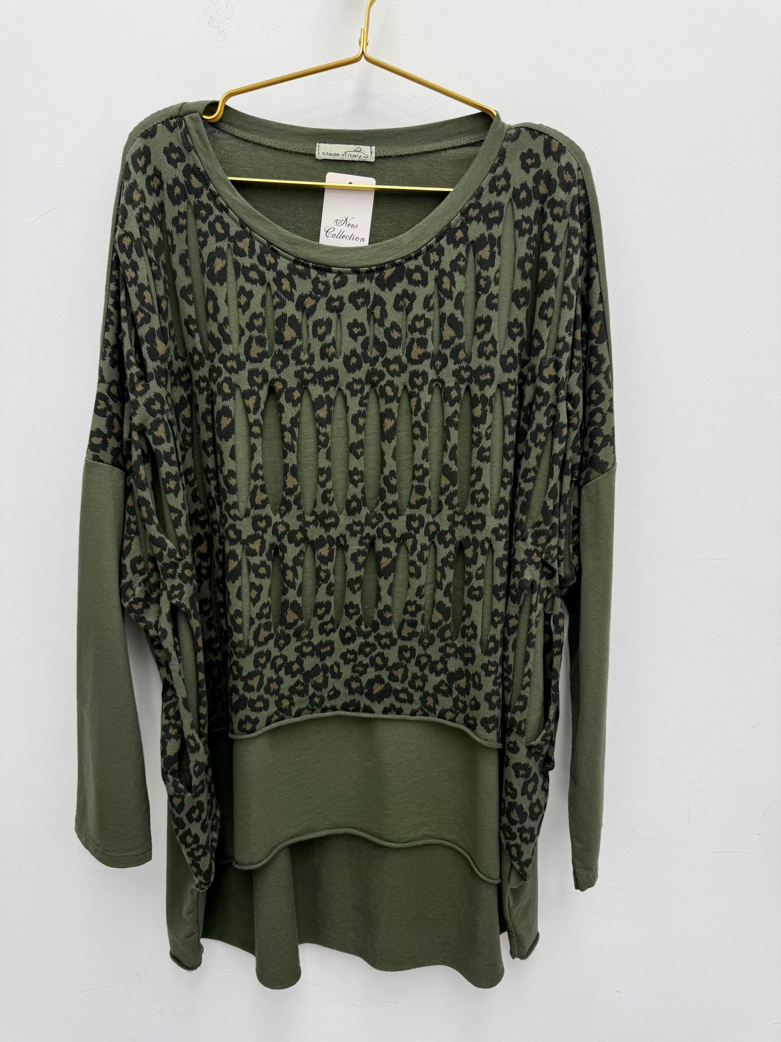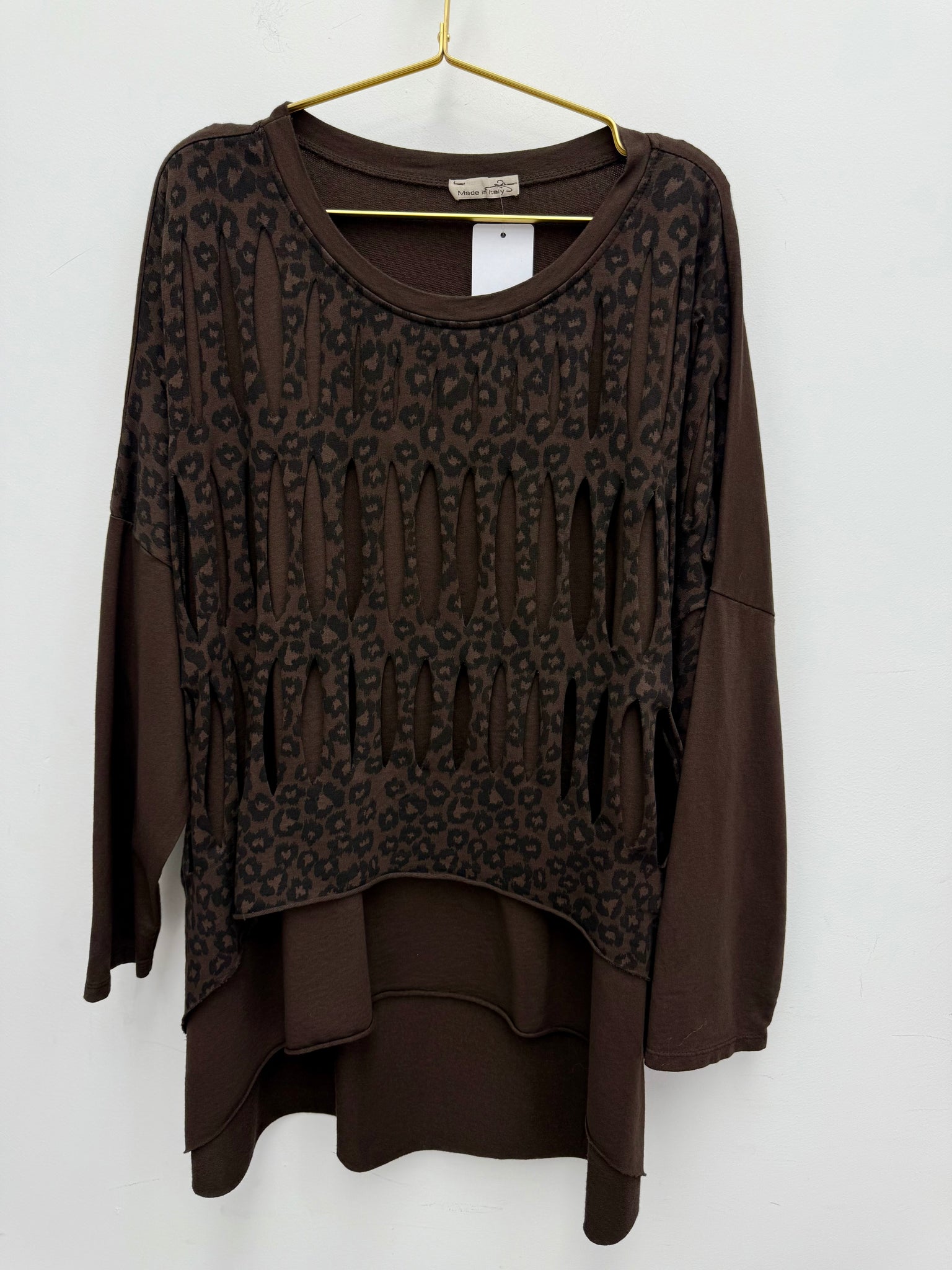 Gorgeous stretch cotton oversized dip back top with slash leopard print layer.