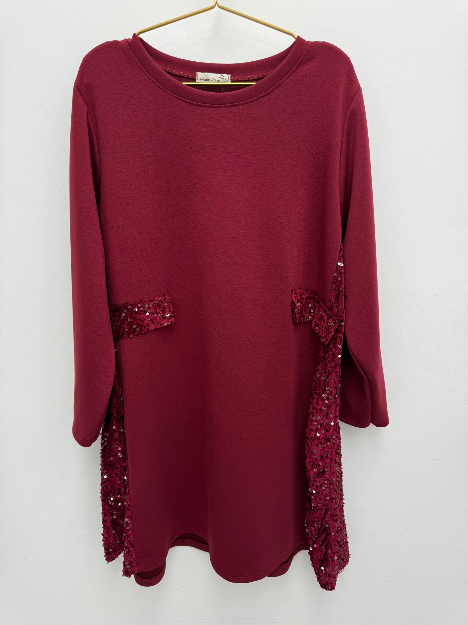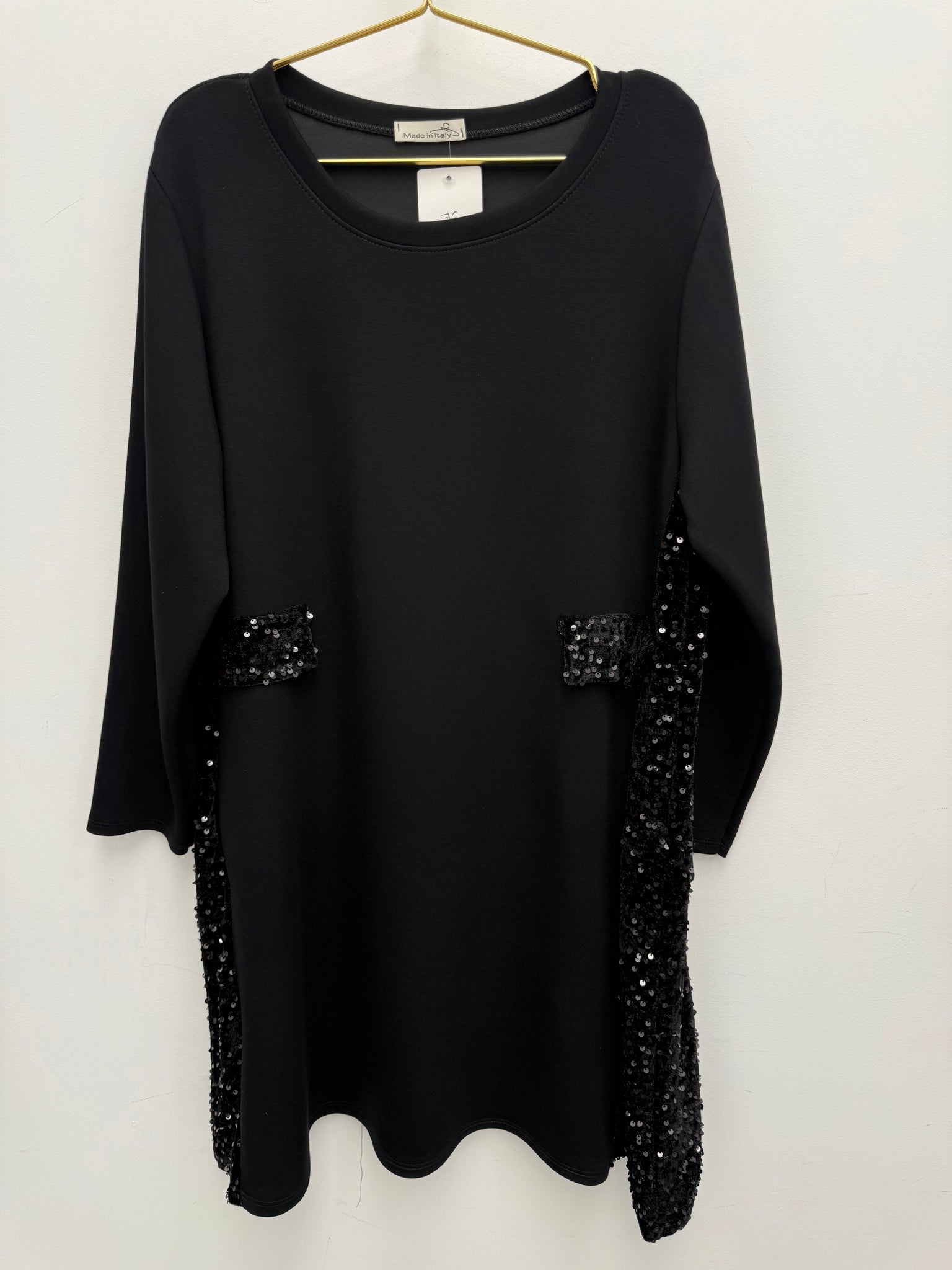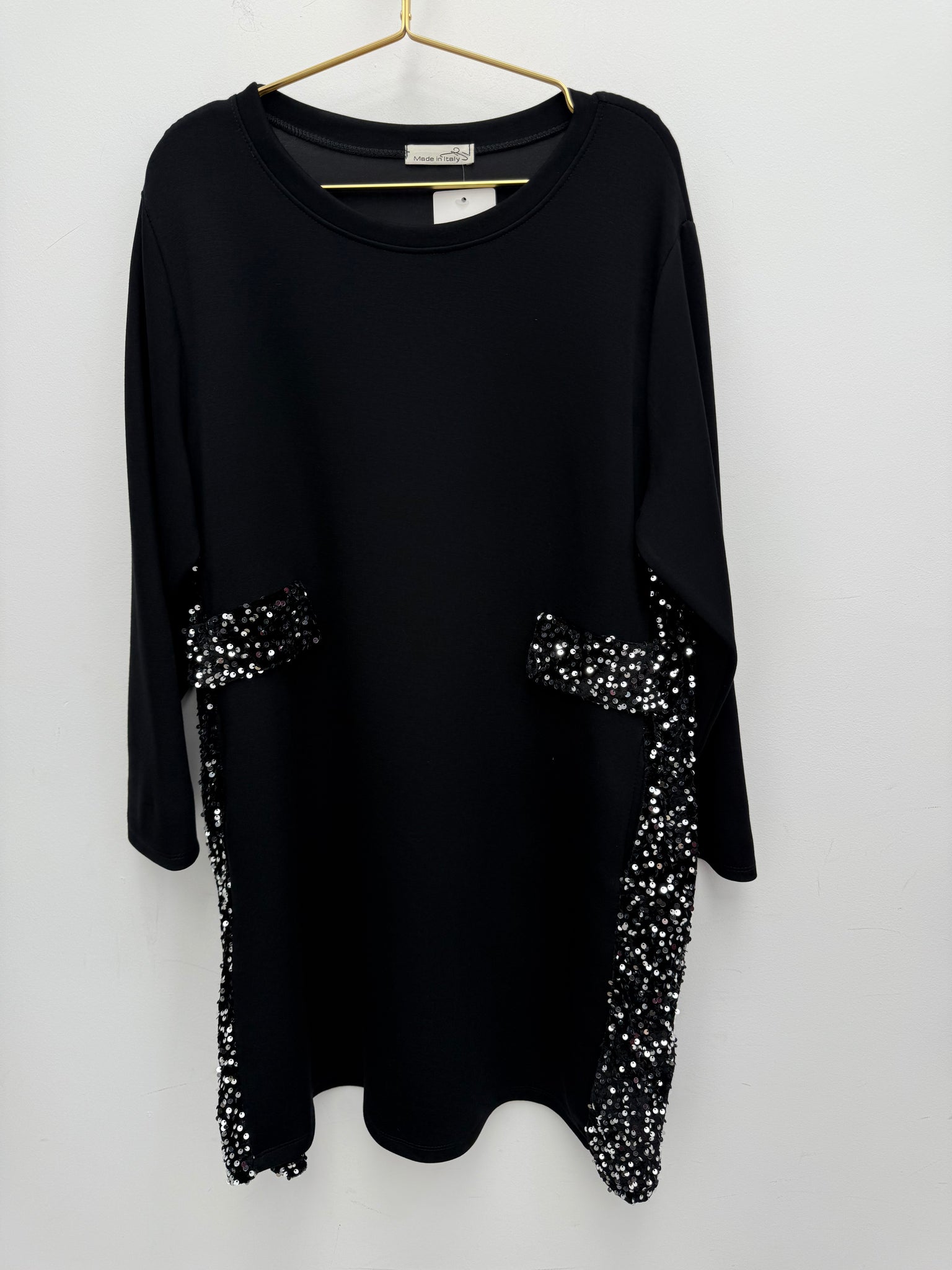 Stunning flattering soft stretch lightweight scuba dress with sequin panels and pockets.