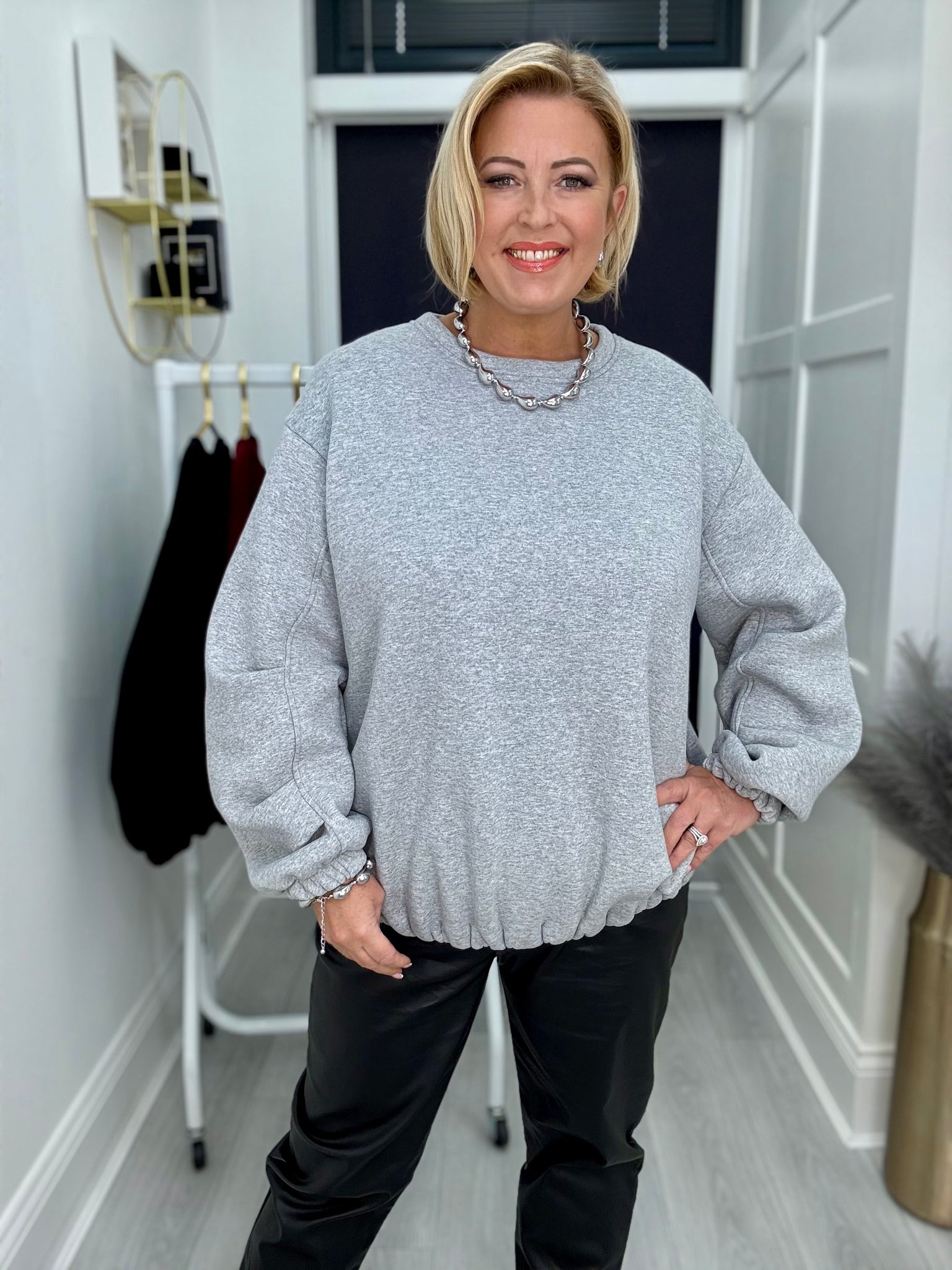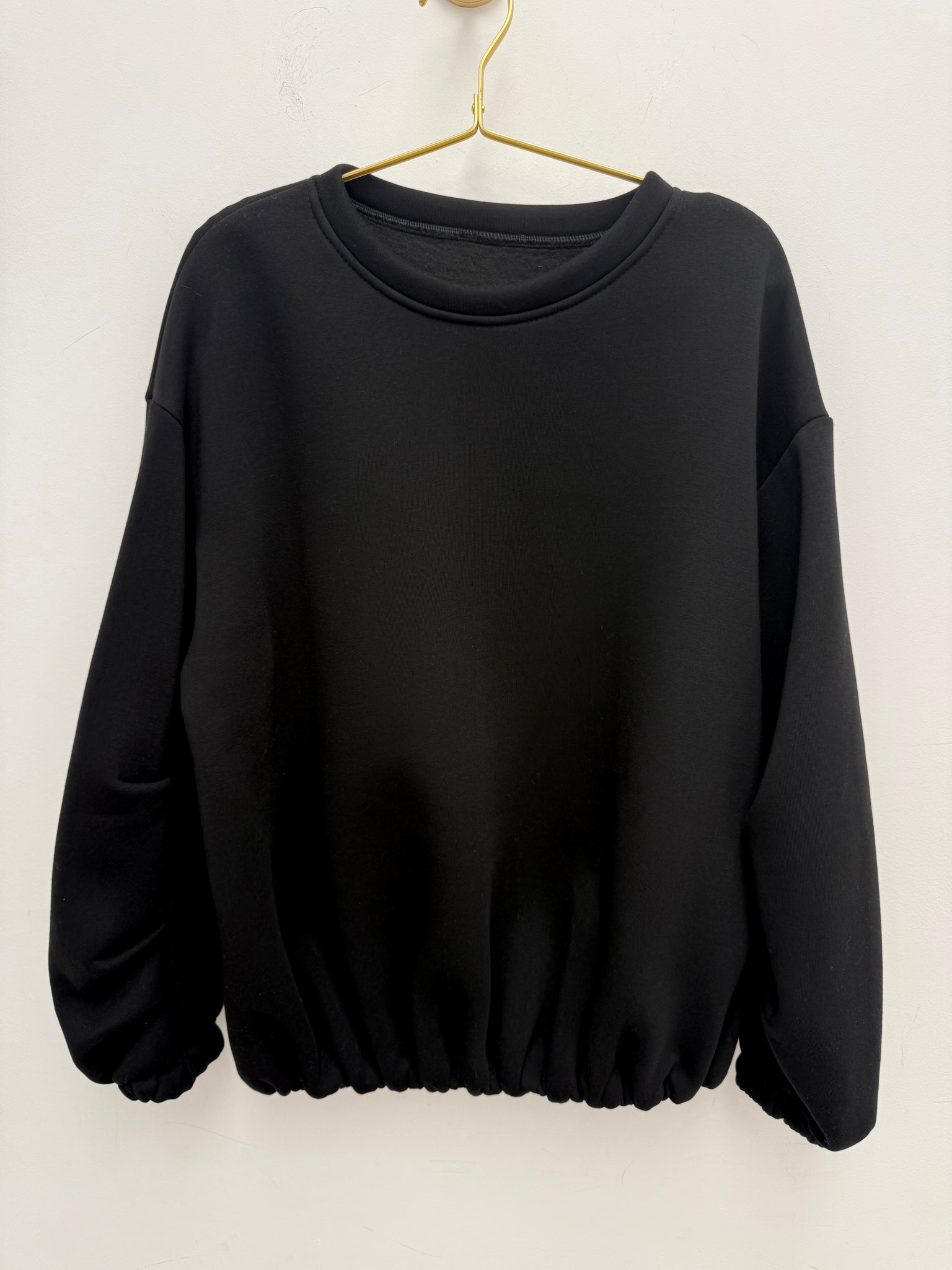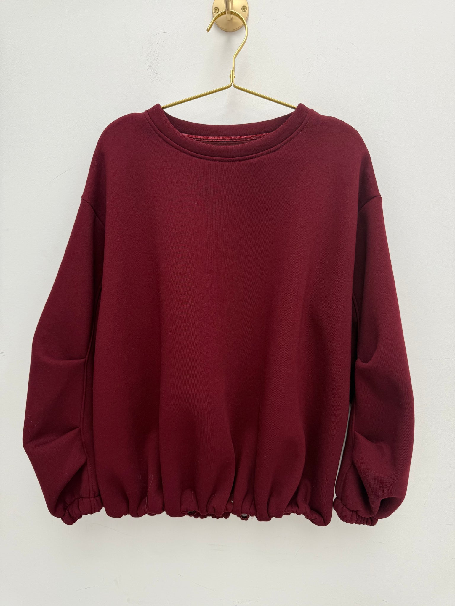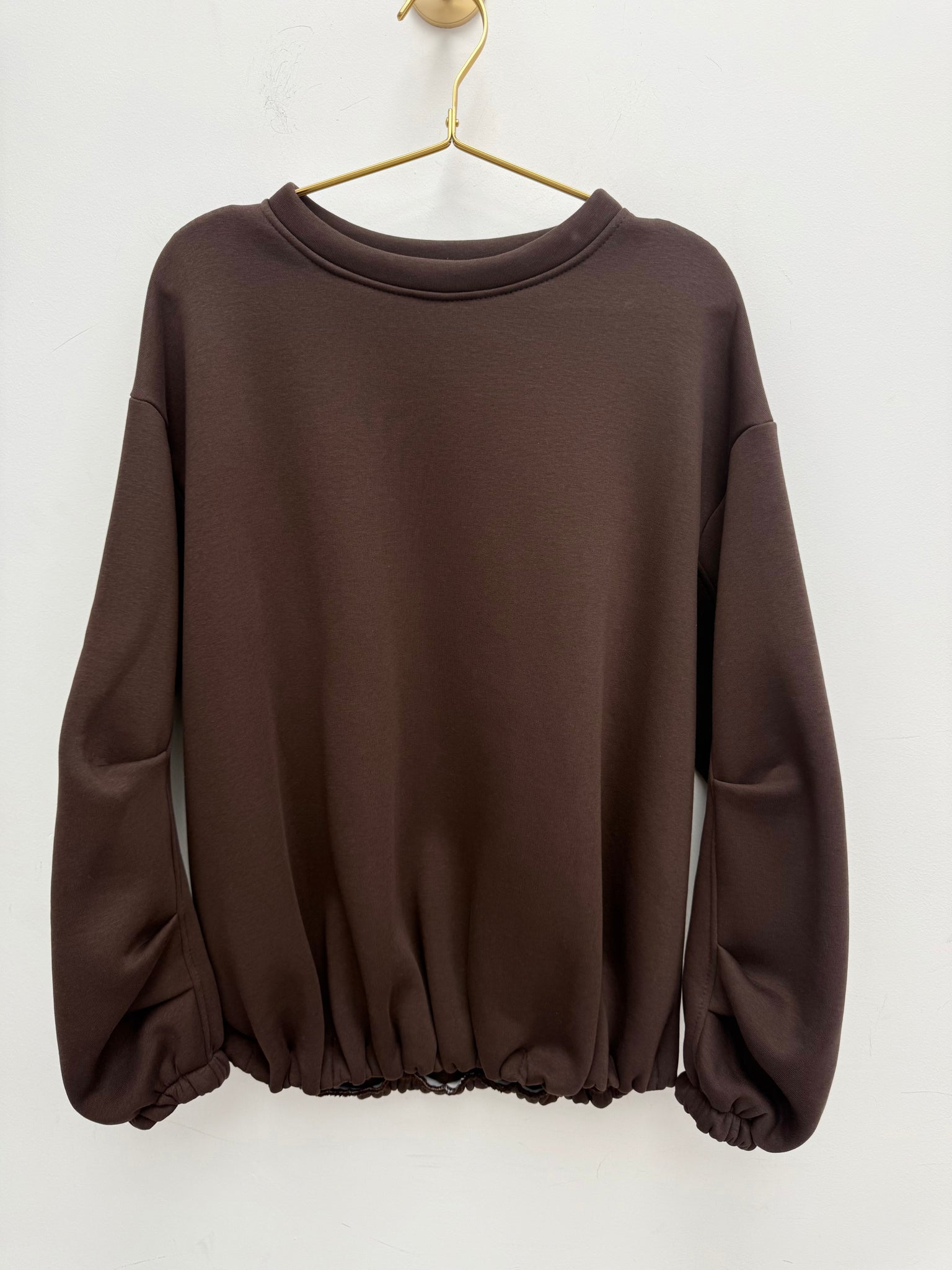Gorgeous soft cotton fleece back sweatshirt with pintuck sleeves and stretch bubble hem.