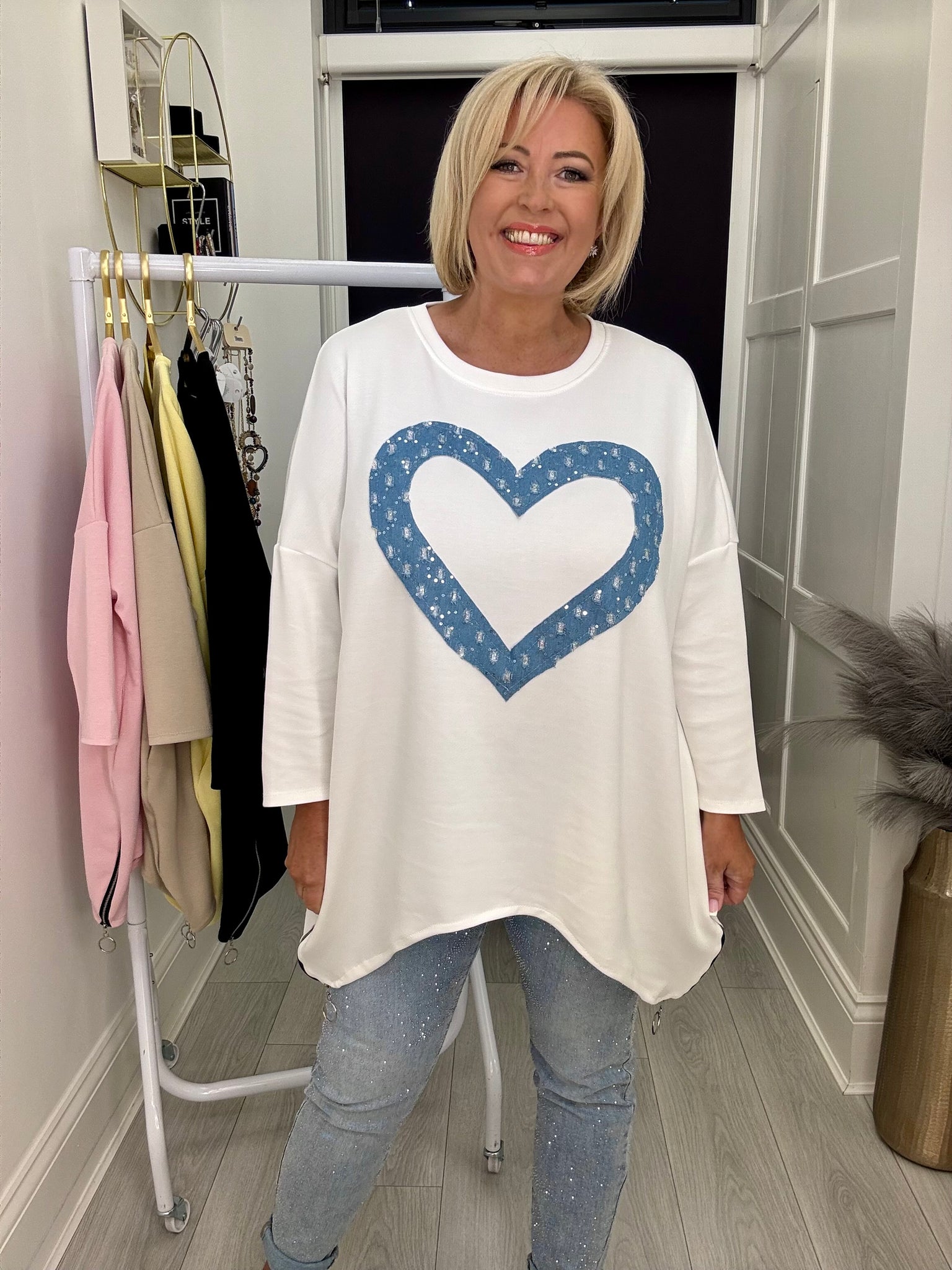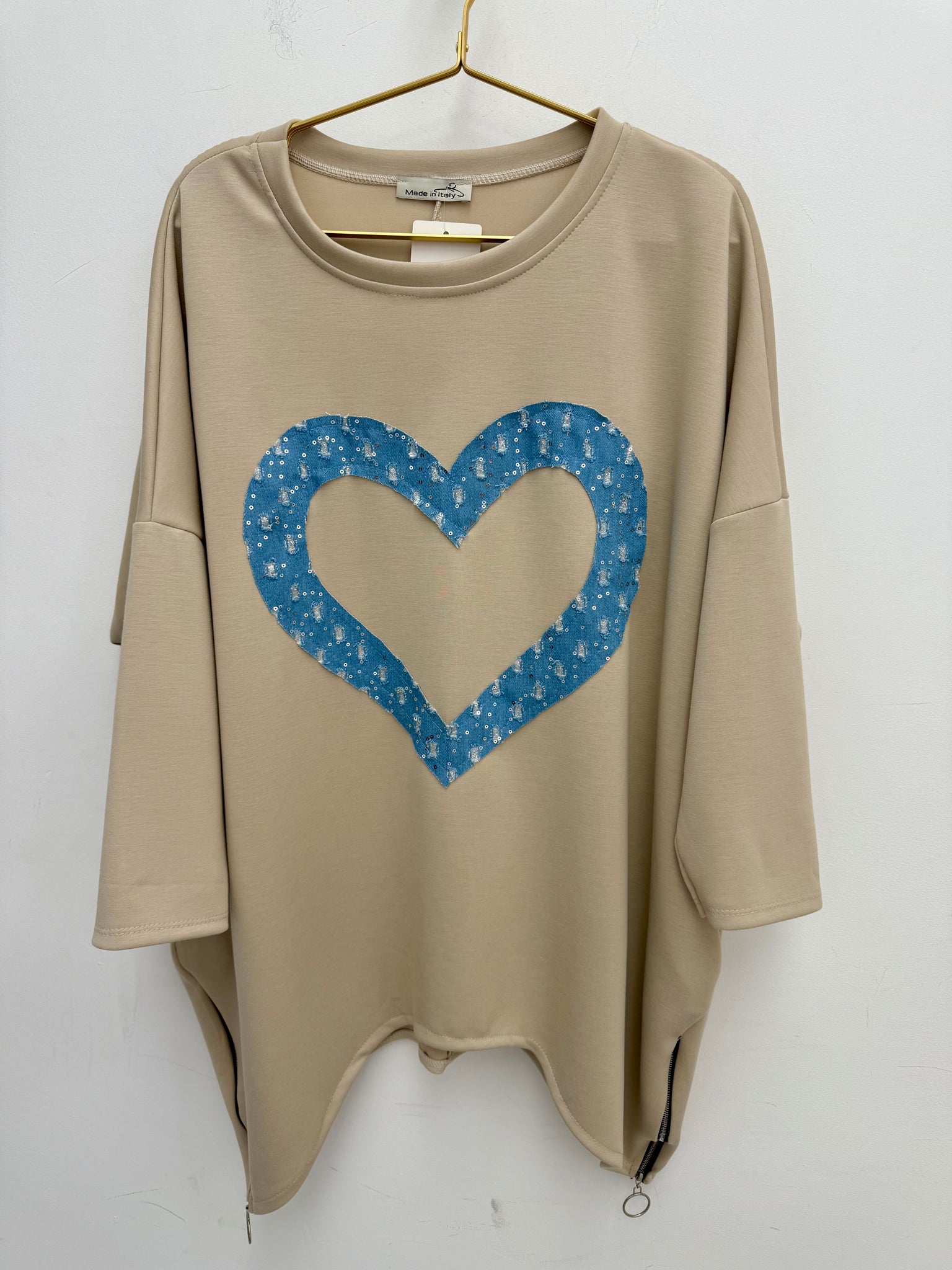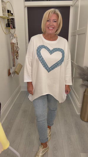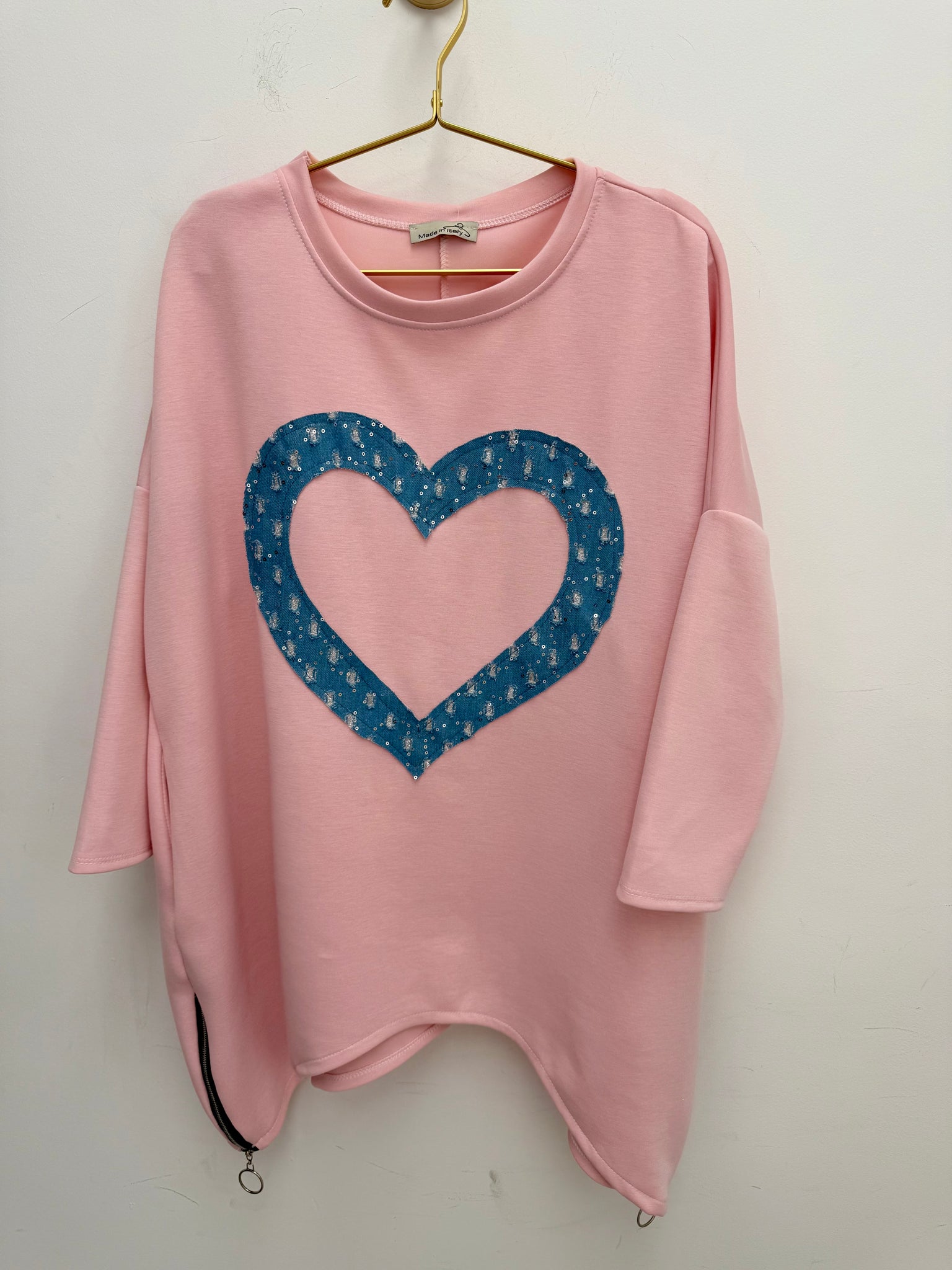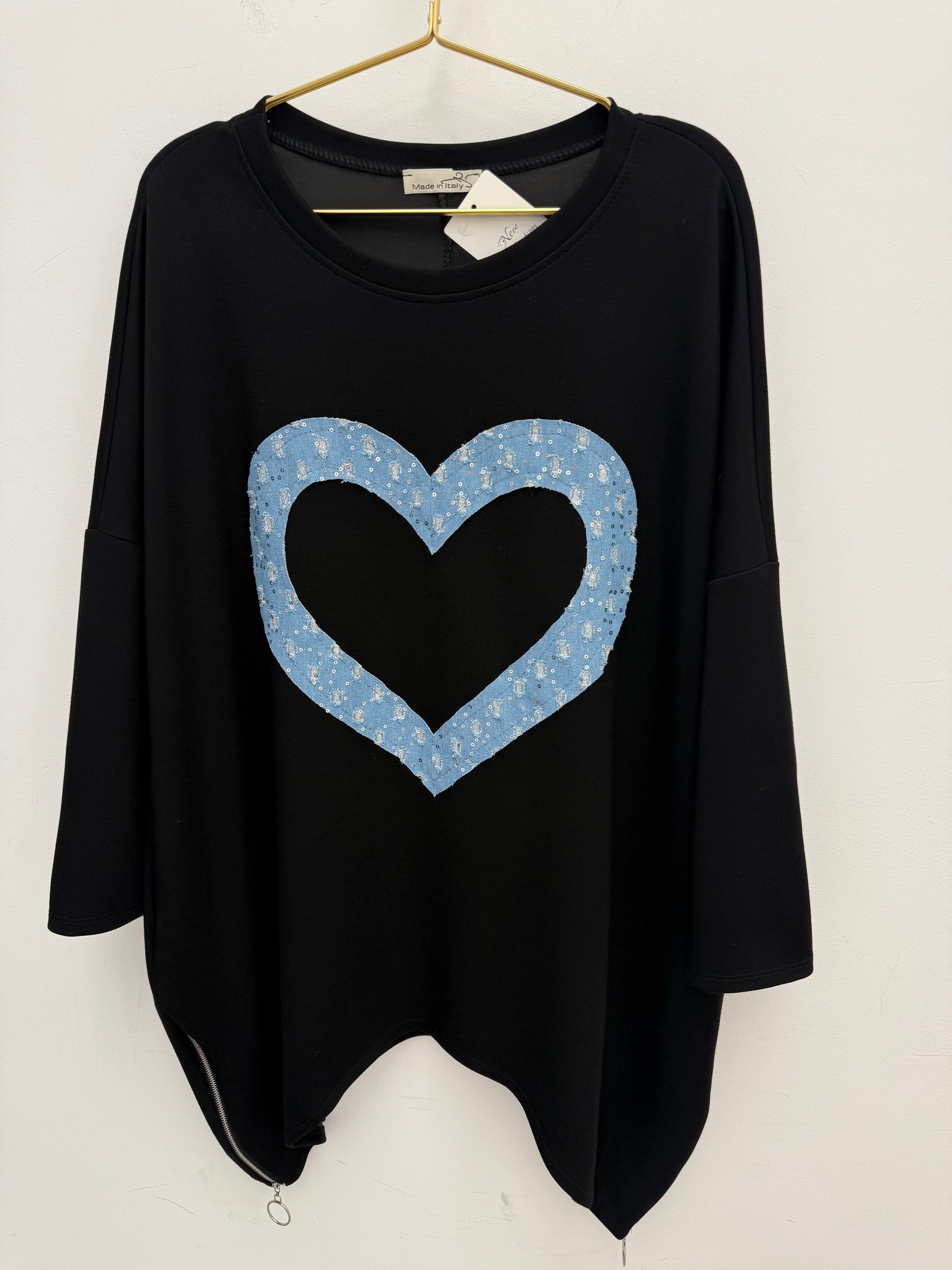 Gorgeous soft silky smooth stretch (light scuba fabric) oversized double zip top with denim heart, silver sequins and pockets.