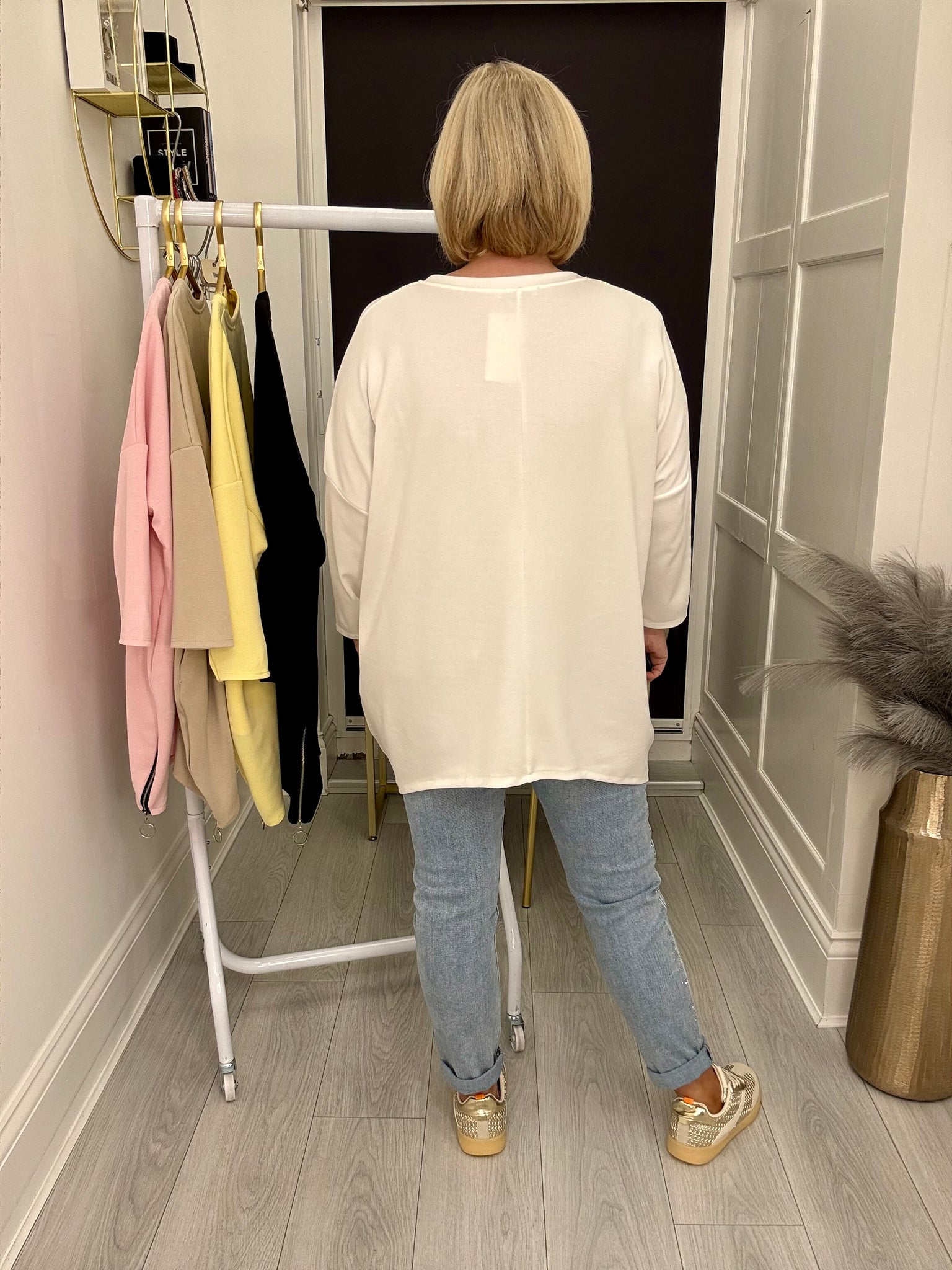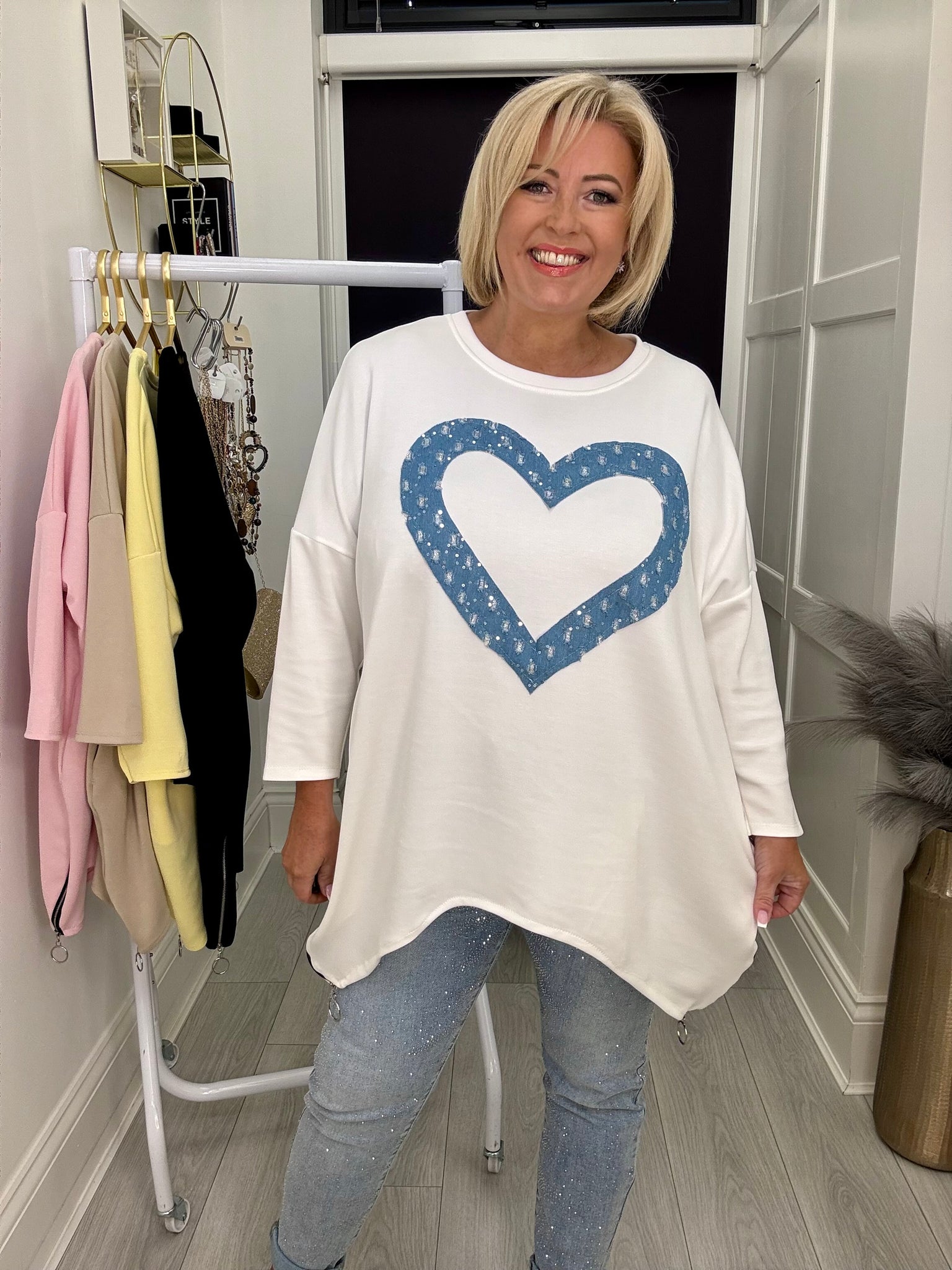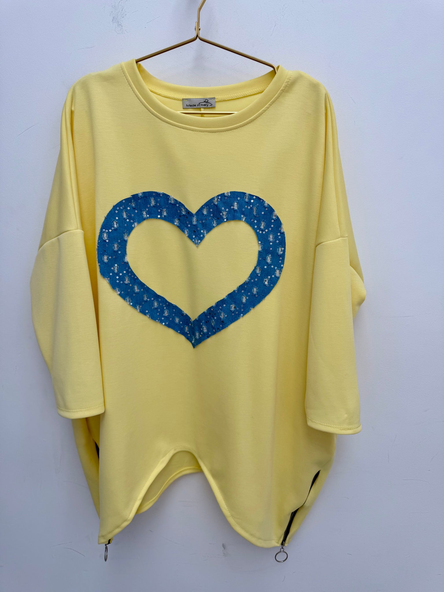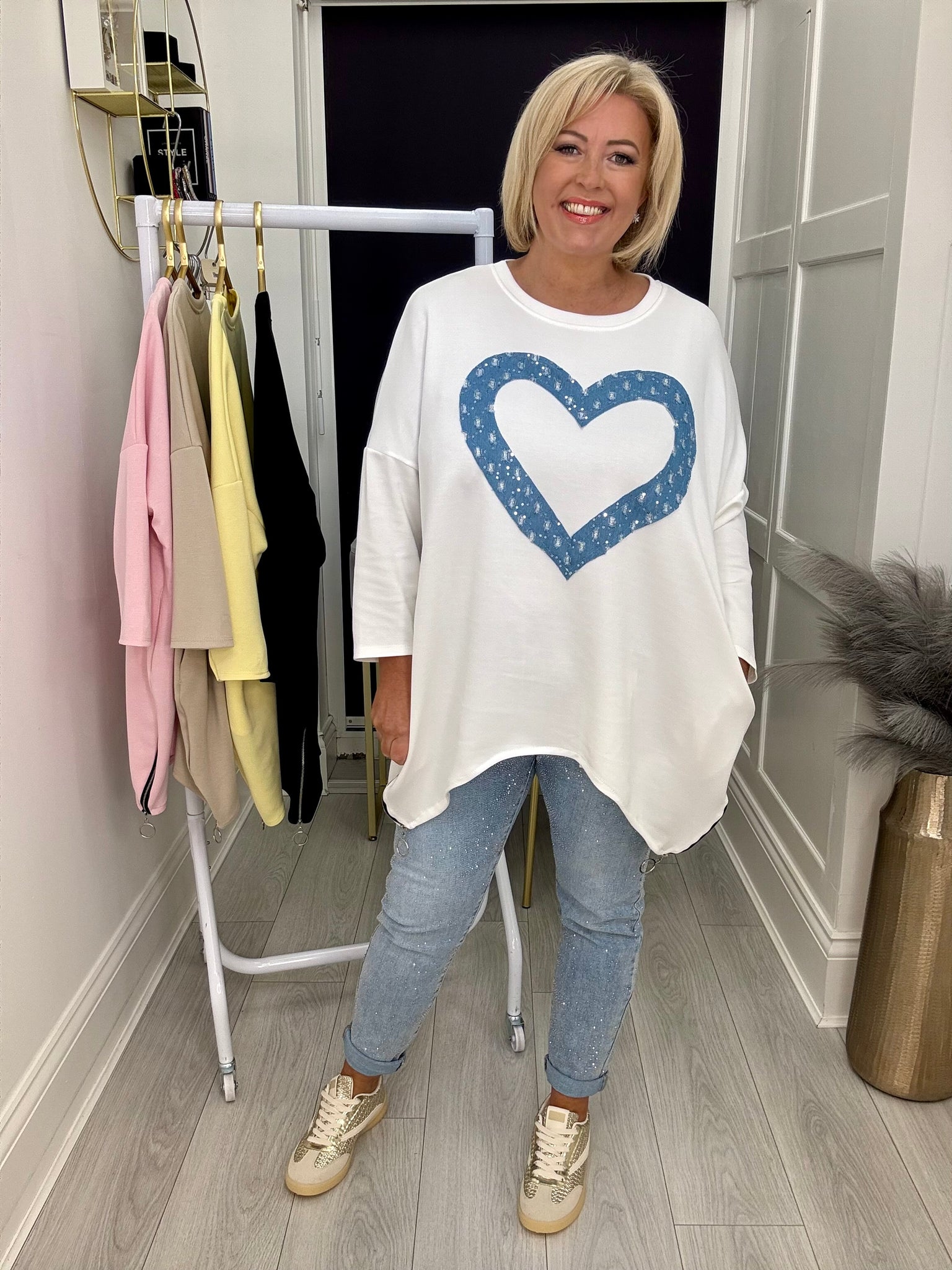 Gorgeous soft silky smooth stretch (light scuba fabric) oversized double zip top with denim heart, silver sequins and pockets.
