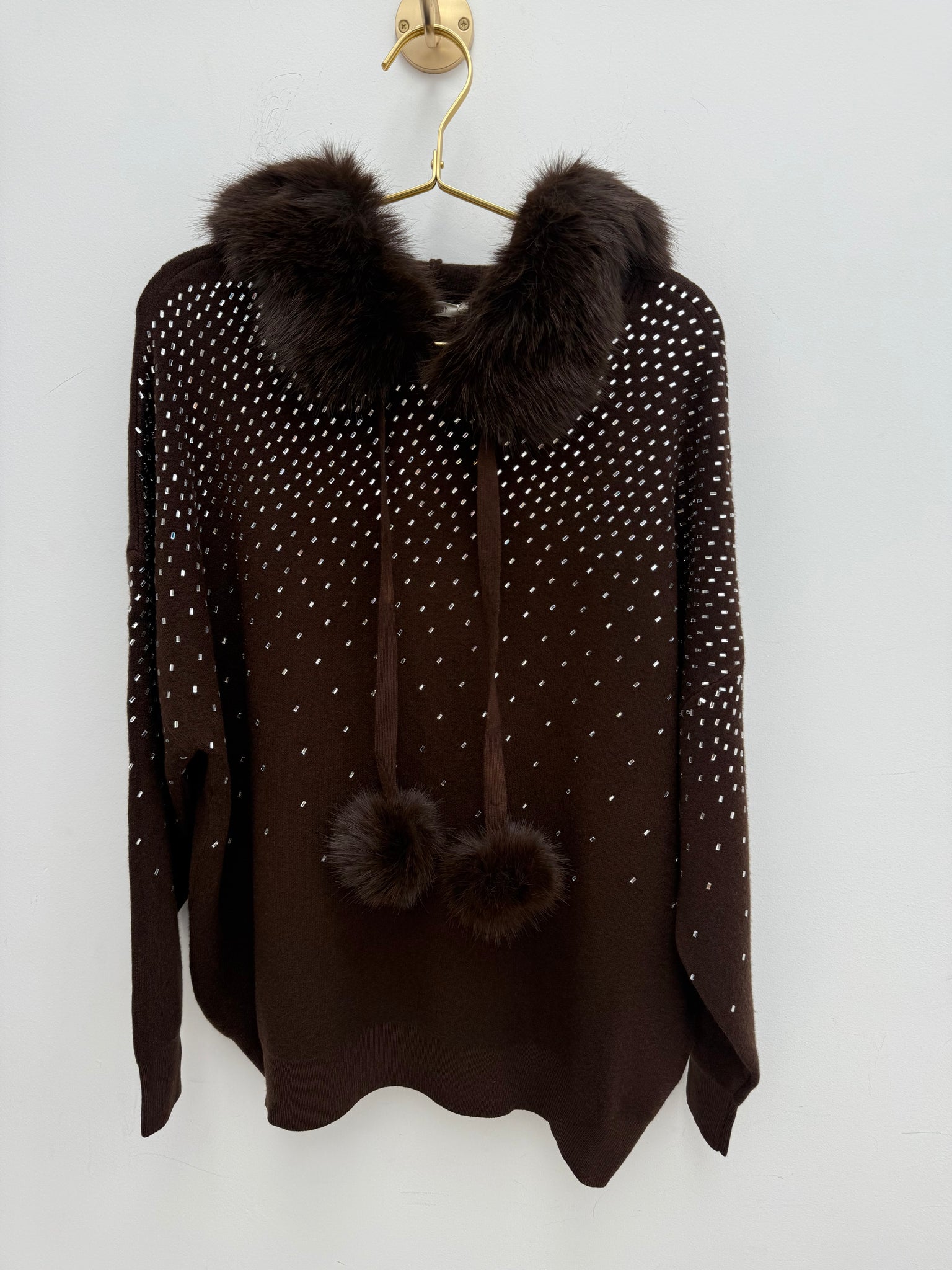 Stunning super soft jumper with crystals, plush faux fur pom poms and detachable faux fur trim hood.
