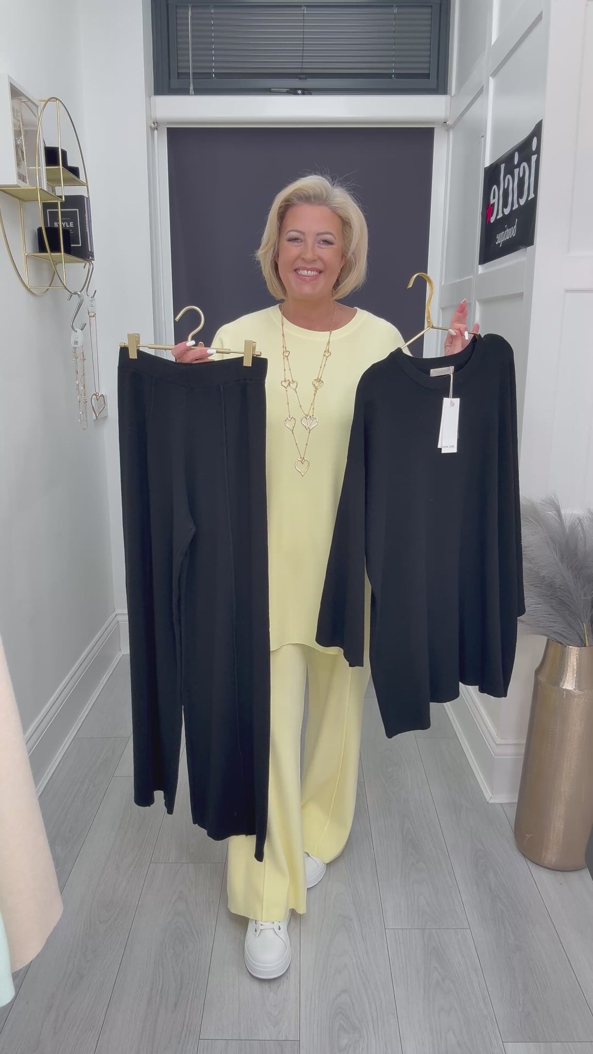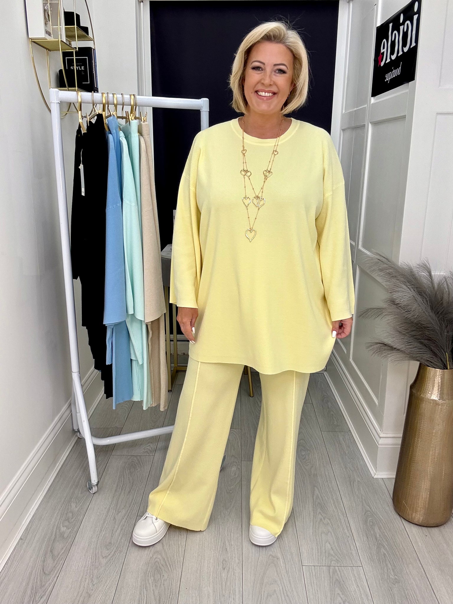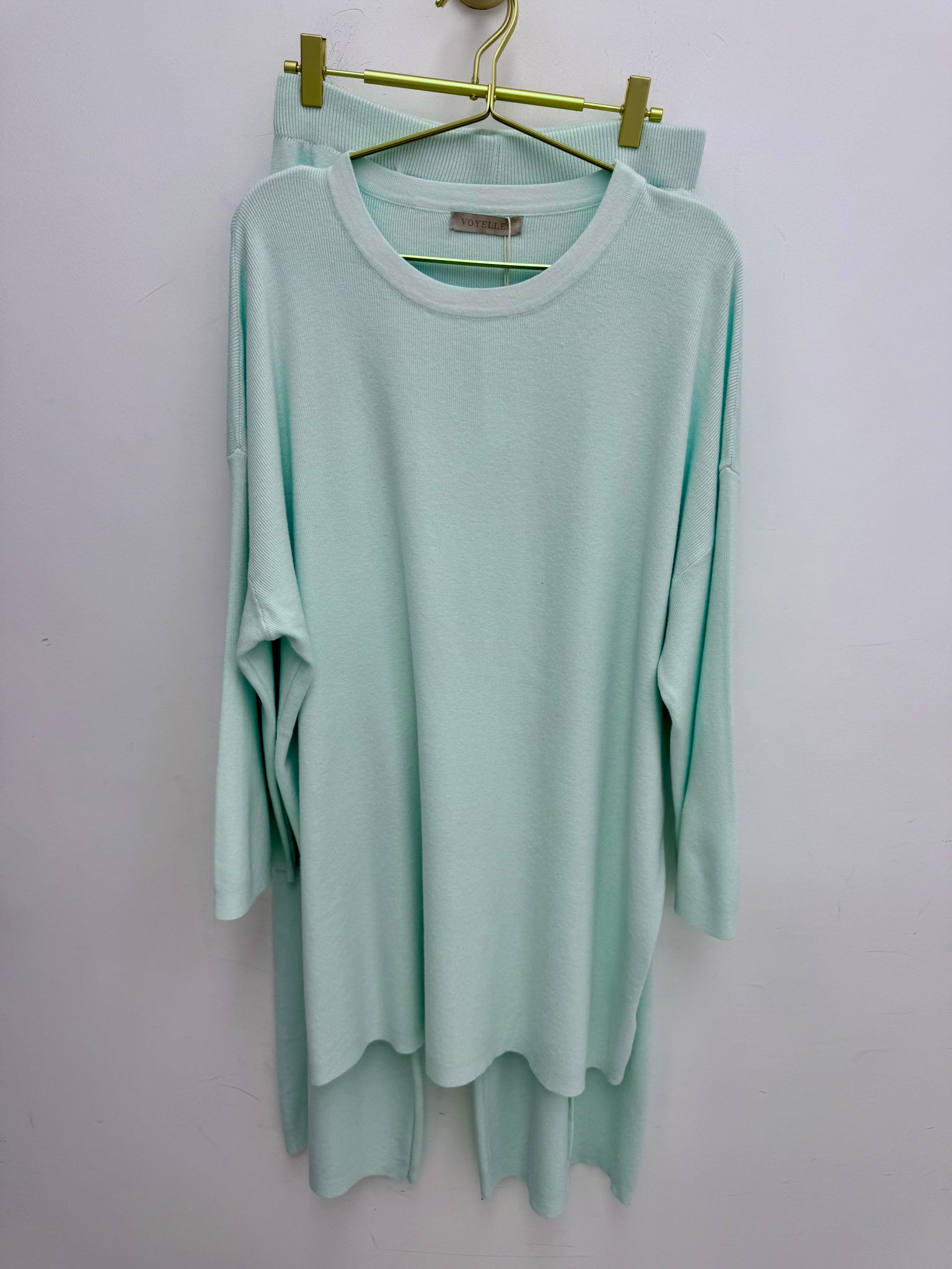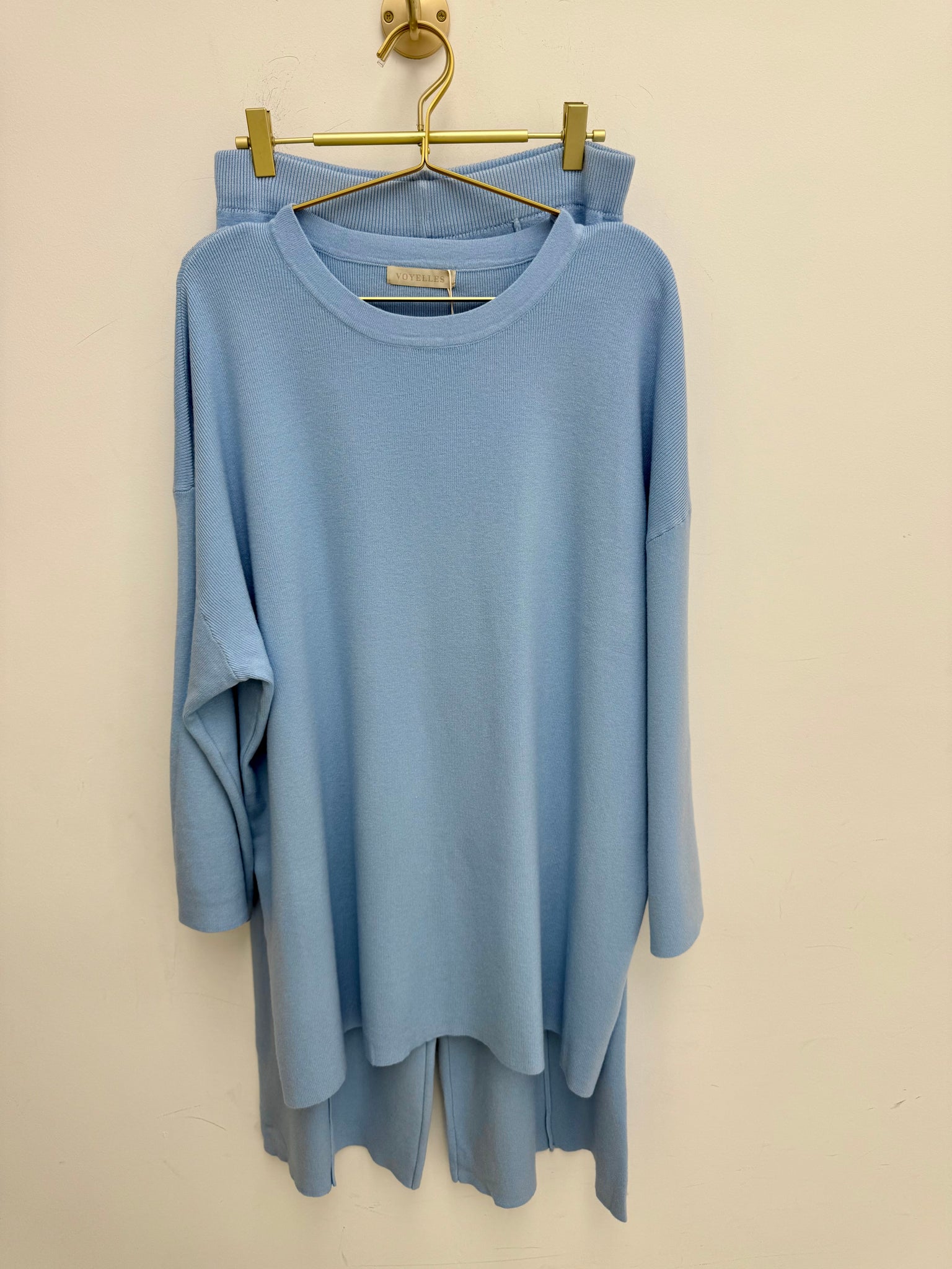 Gorgeous soft knitted high waist seam detail trousers with matching long jumper .