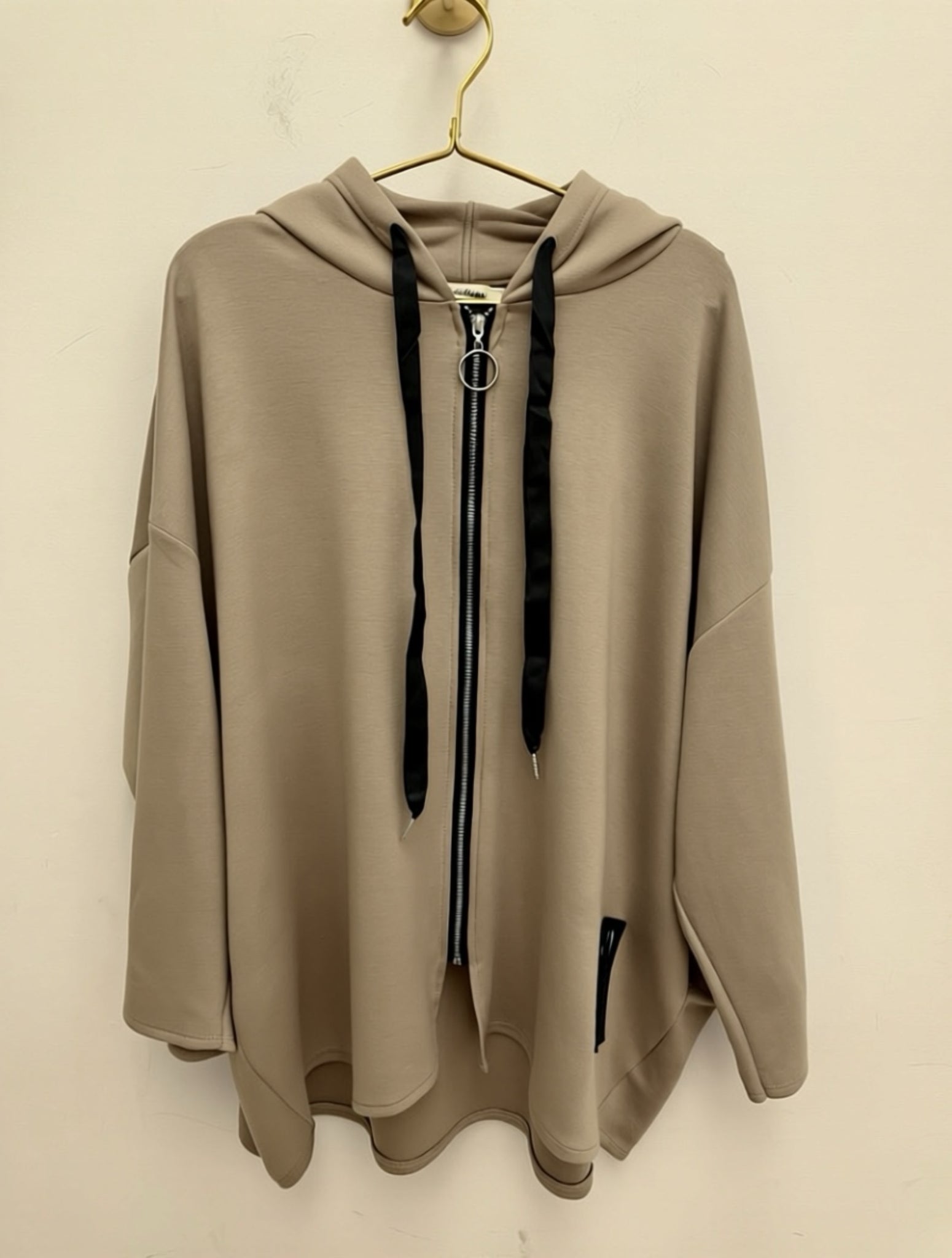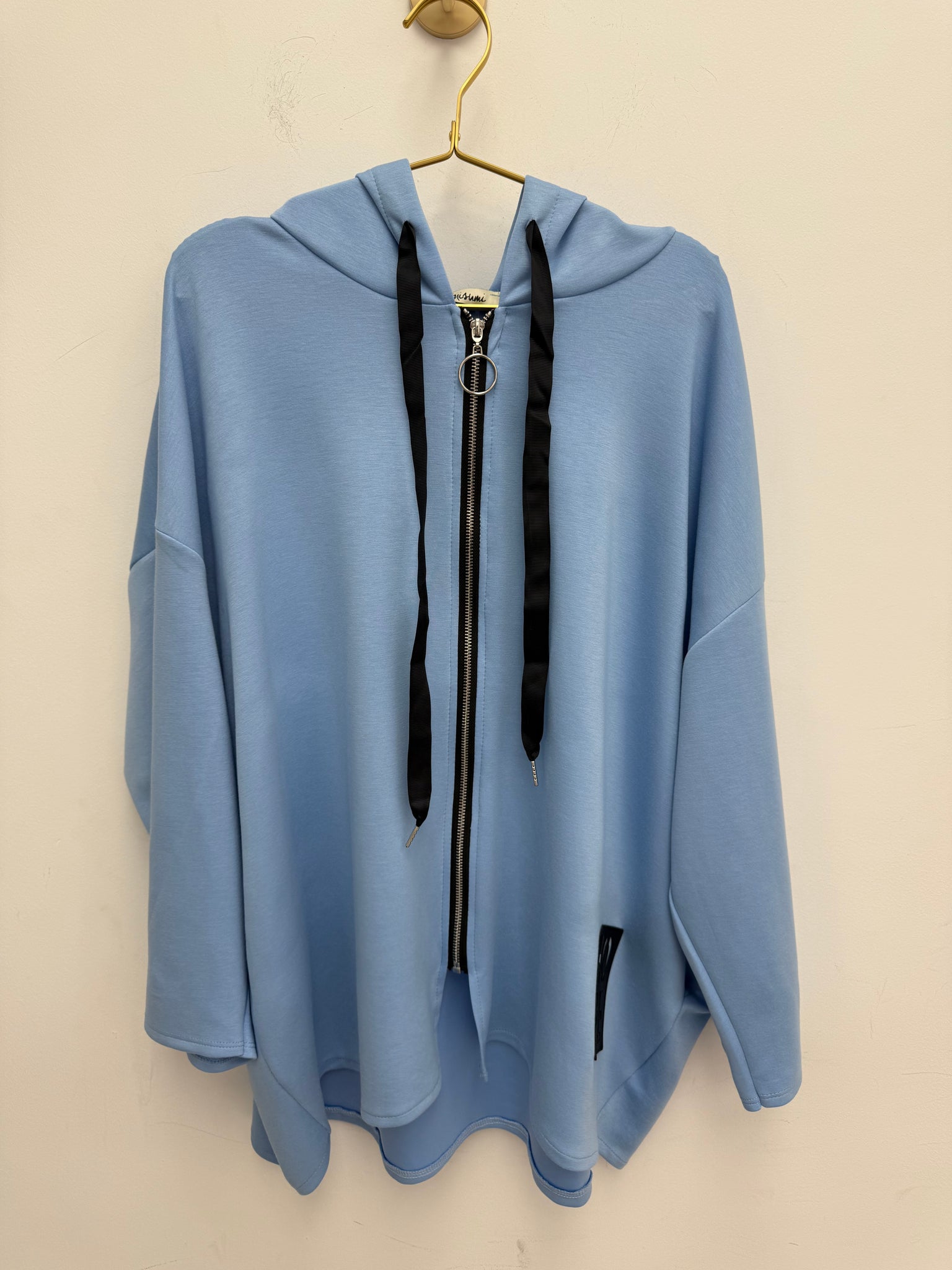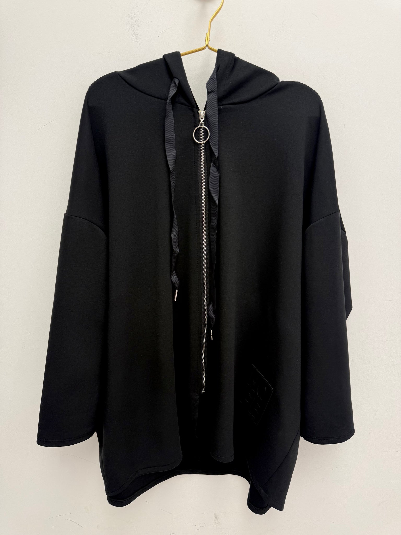 Gorgeous soft stretch easywear light scuba fabric hooded jacket with pockets.