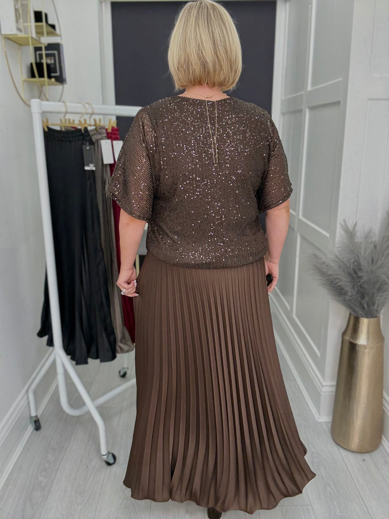Beautiful pleated satin fluted hem skirt with stretch waistband.