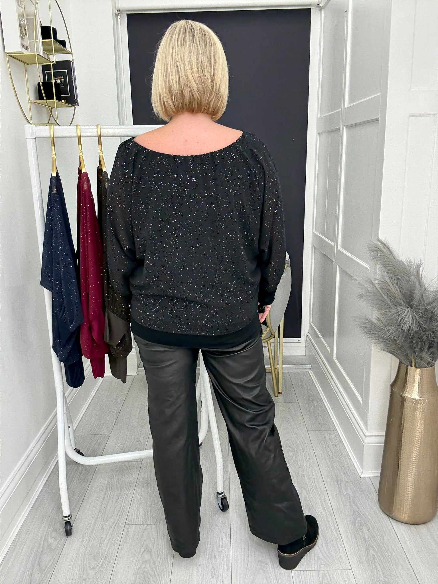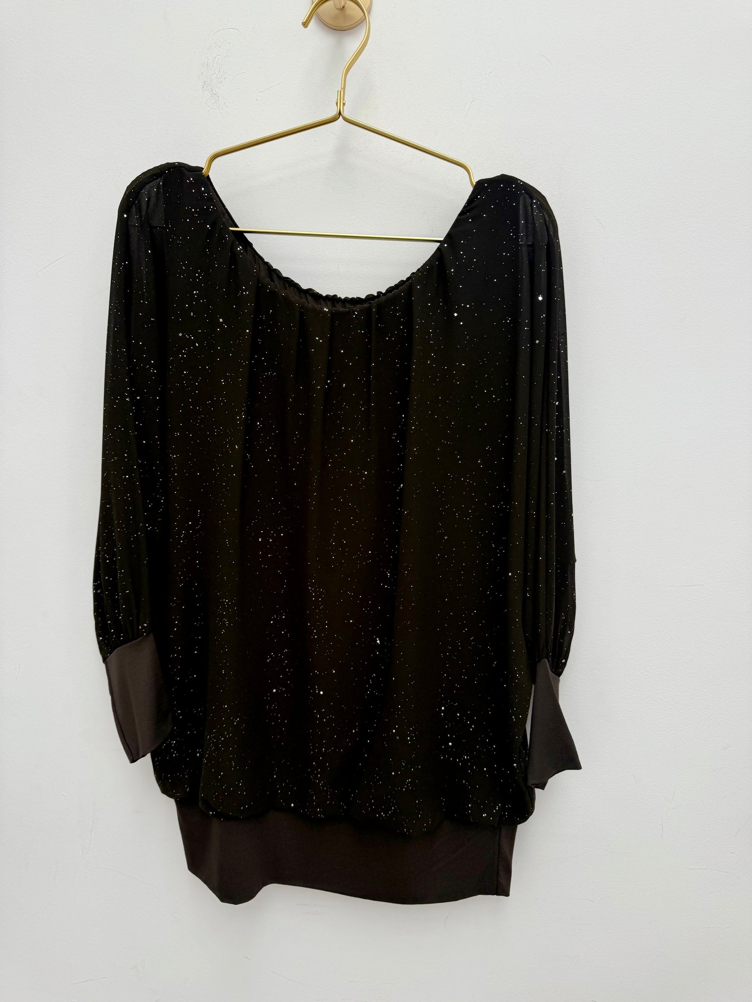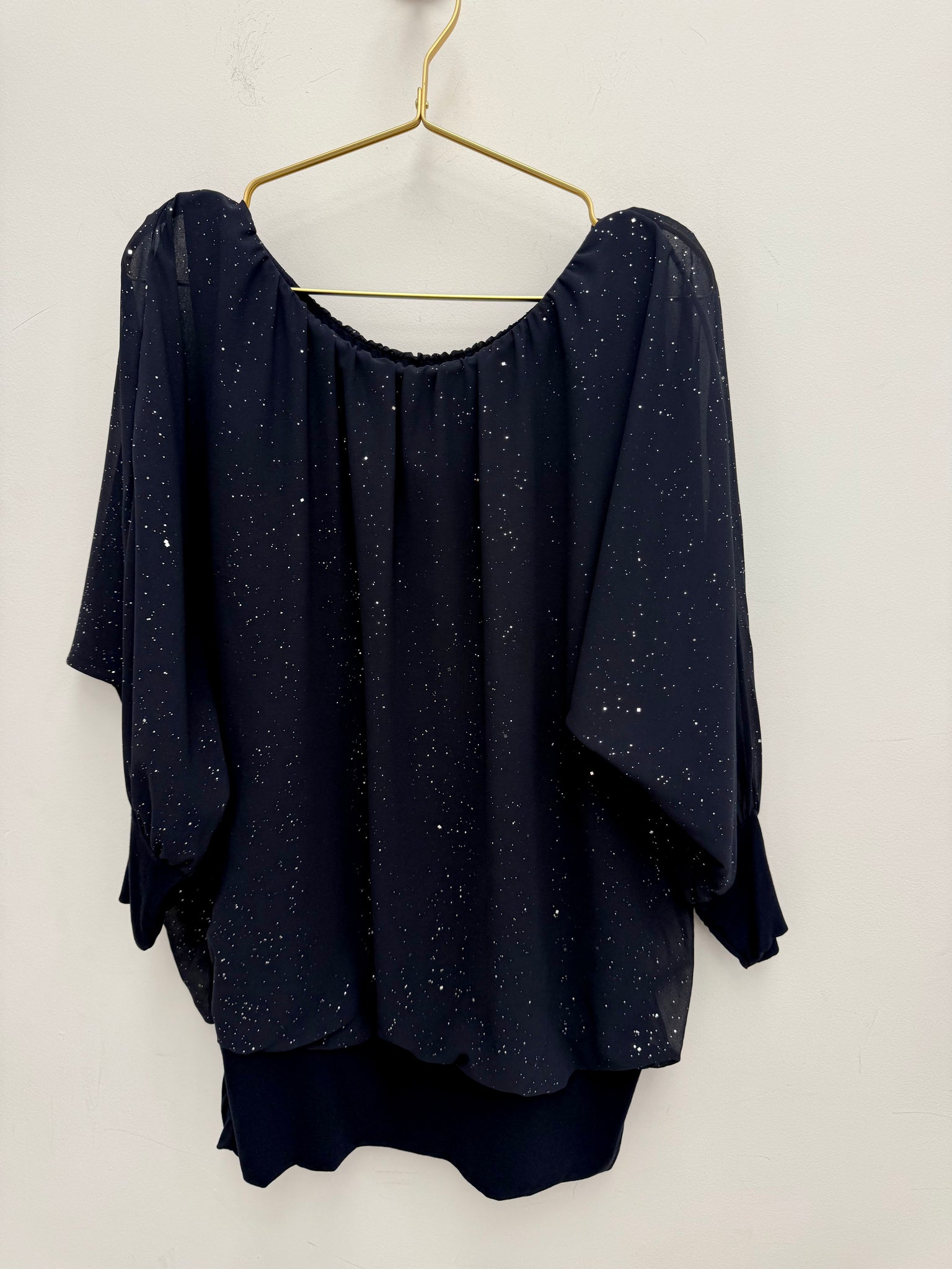 Stunning flattering silver sequin chiffon top with attached stretch lining. Elasticated neckline, can be worn on or off shoulder.