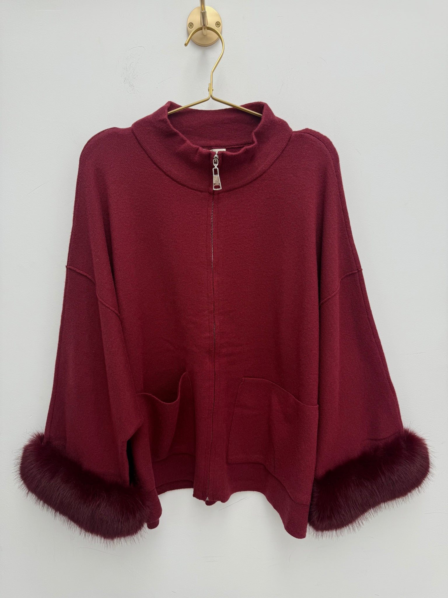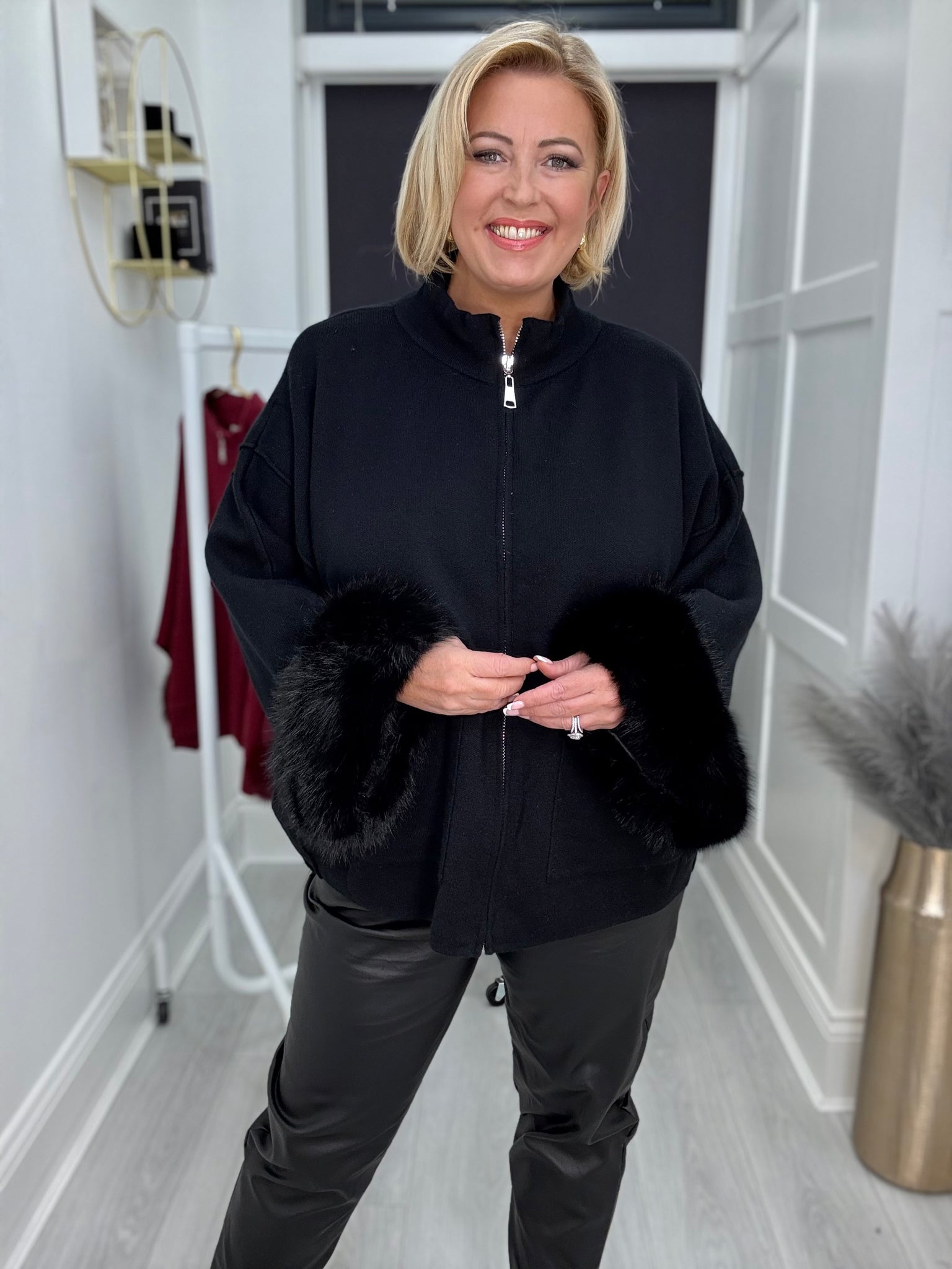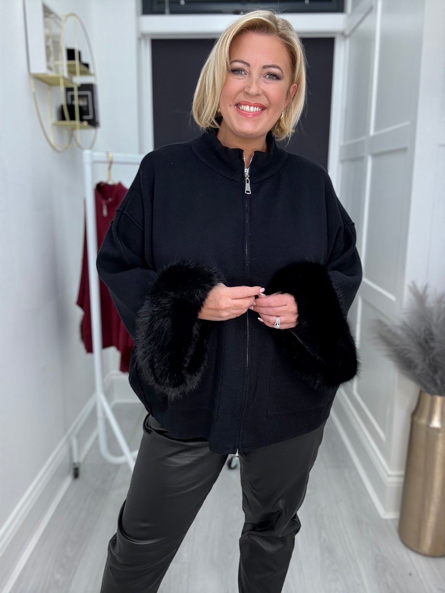 Stunning lux super soft batwing cardigan with pockets, silver zip and plush faux fur cuffs.