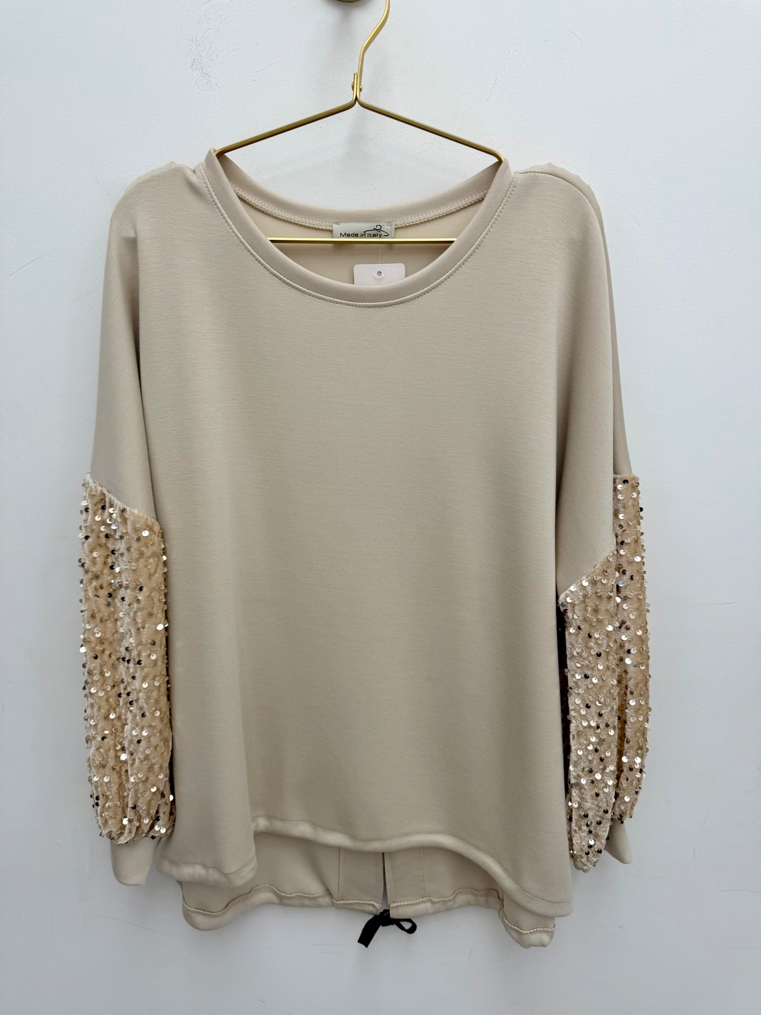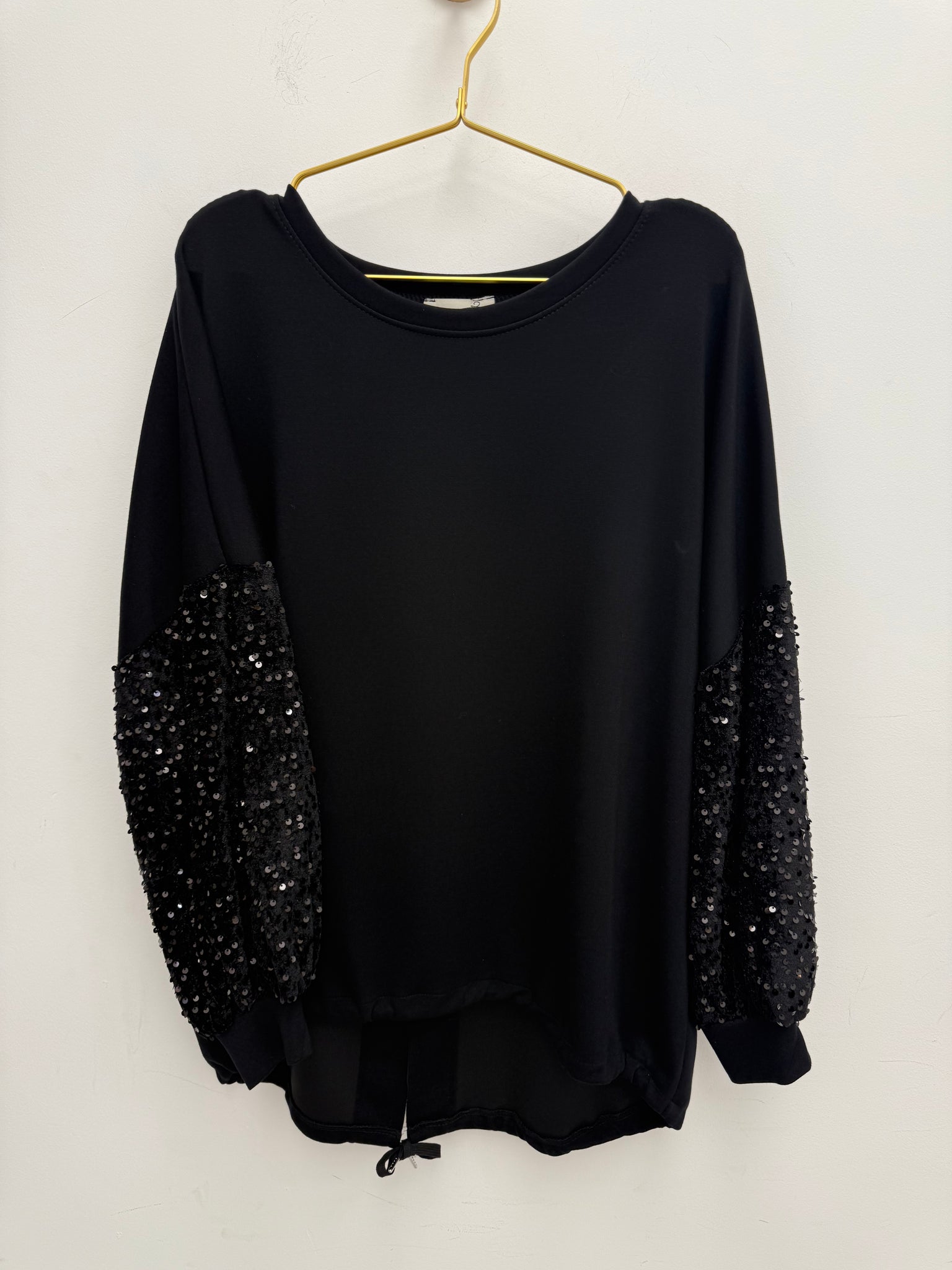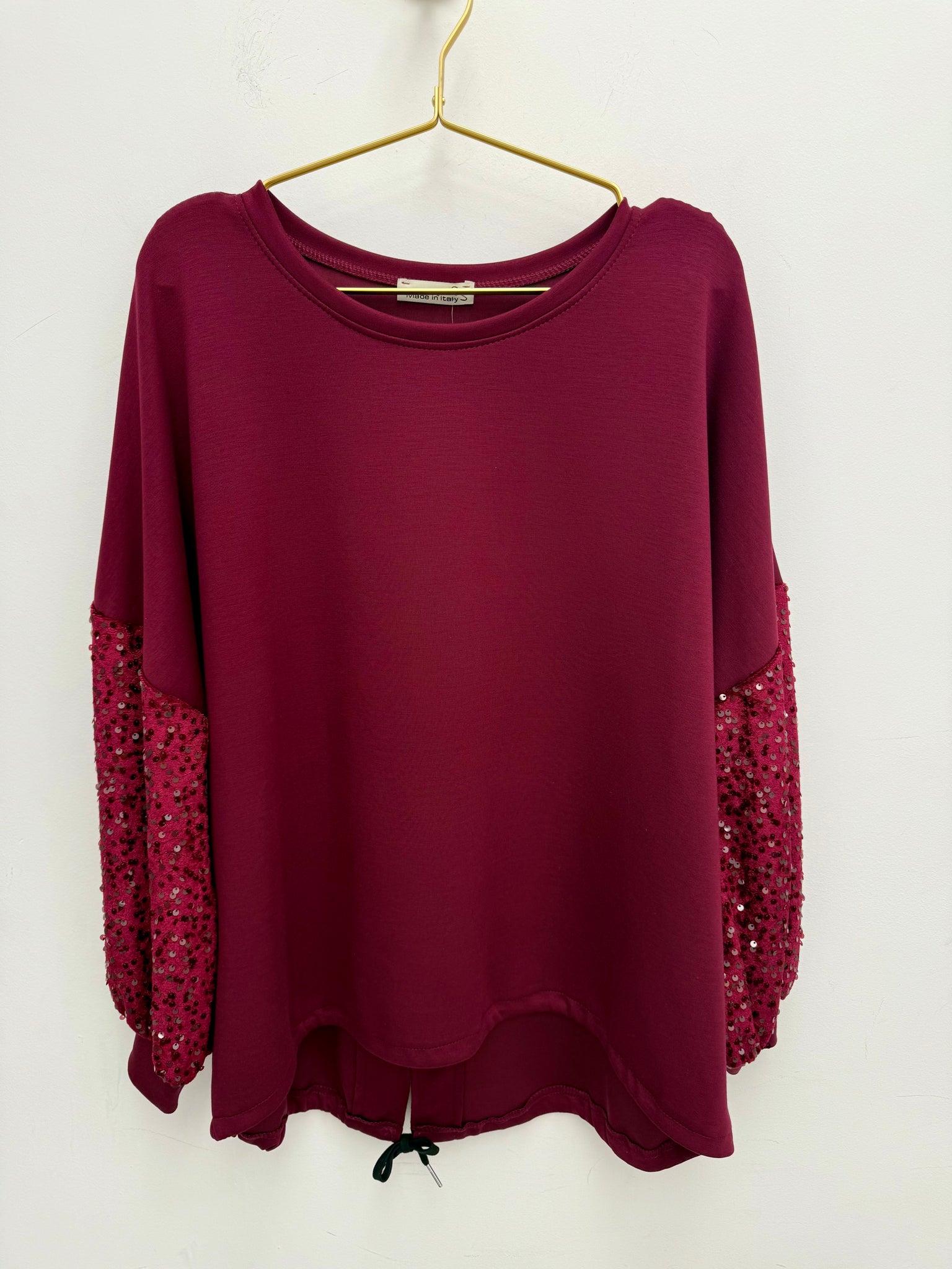 Gorgeous soft silky smooth stretch (light scuba fabric) dip back top with sequin balloon sleeves and adjustable drawcord.