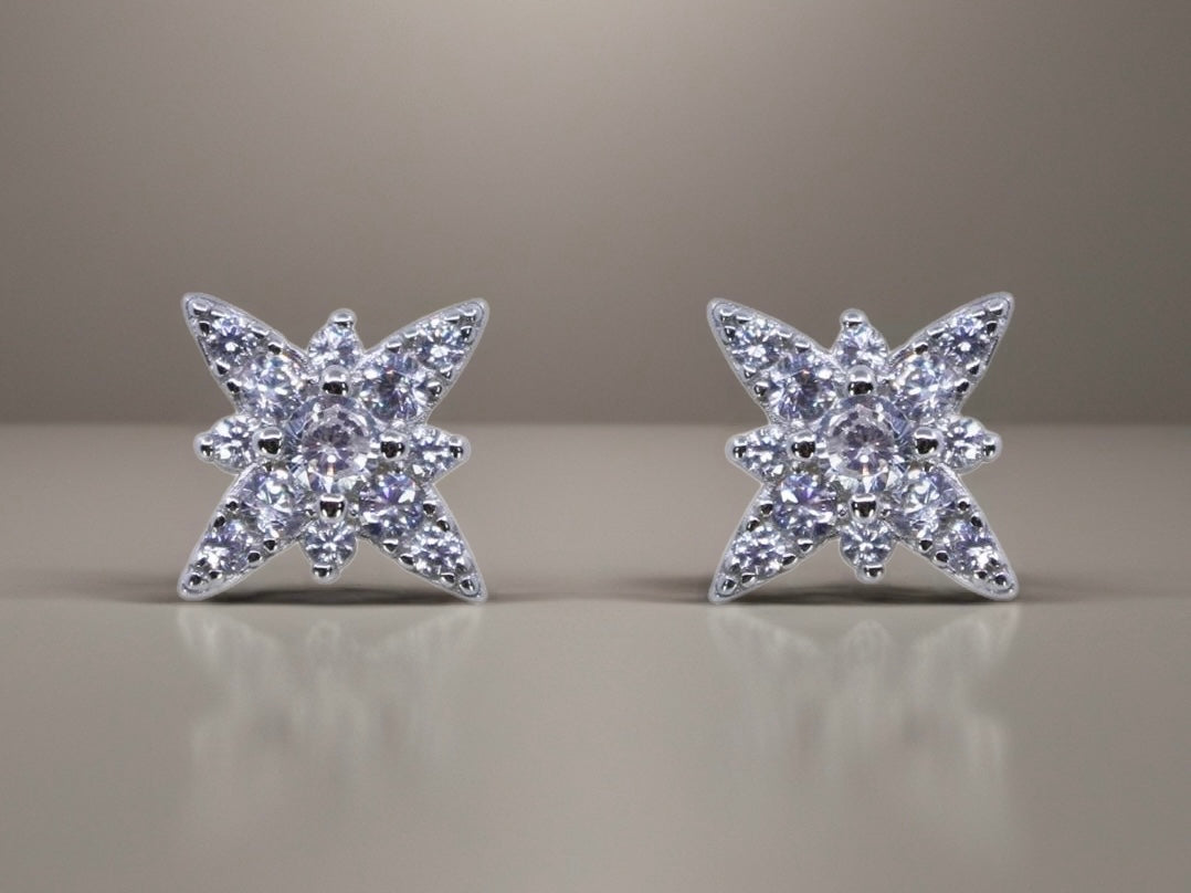 Stunning rhodium plated real sterling silver stud earrings with clear cubic zirconia stones.
