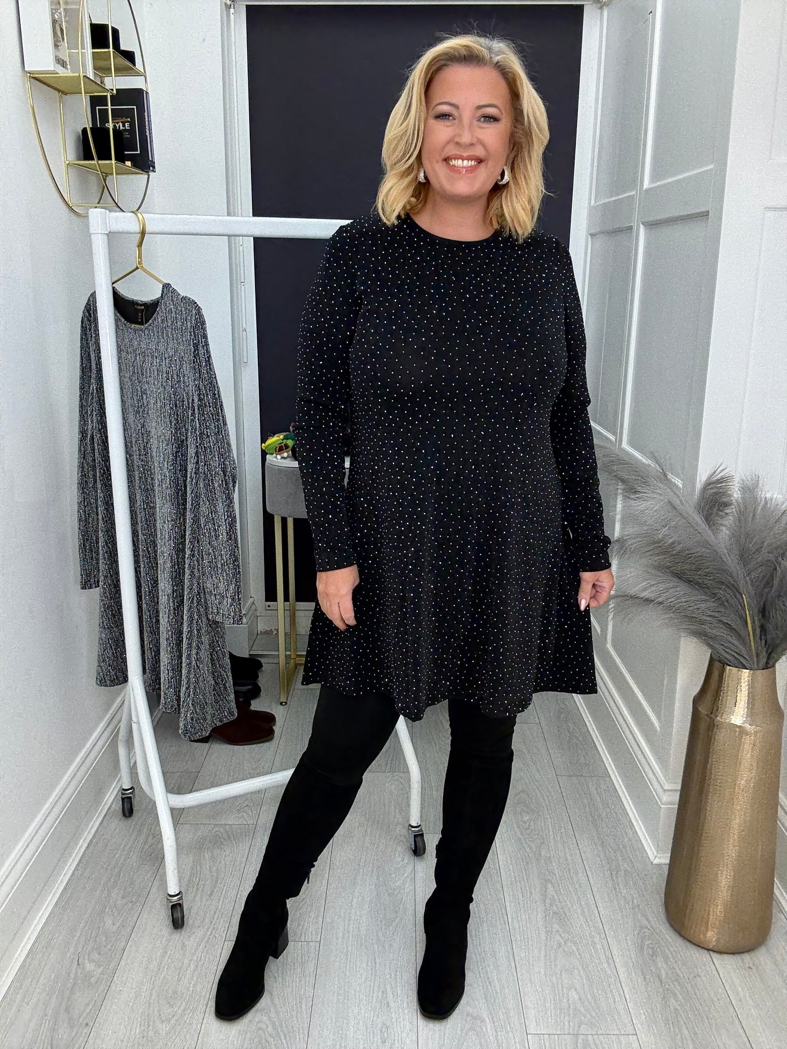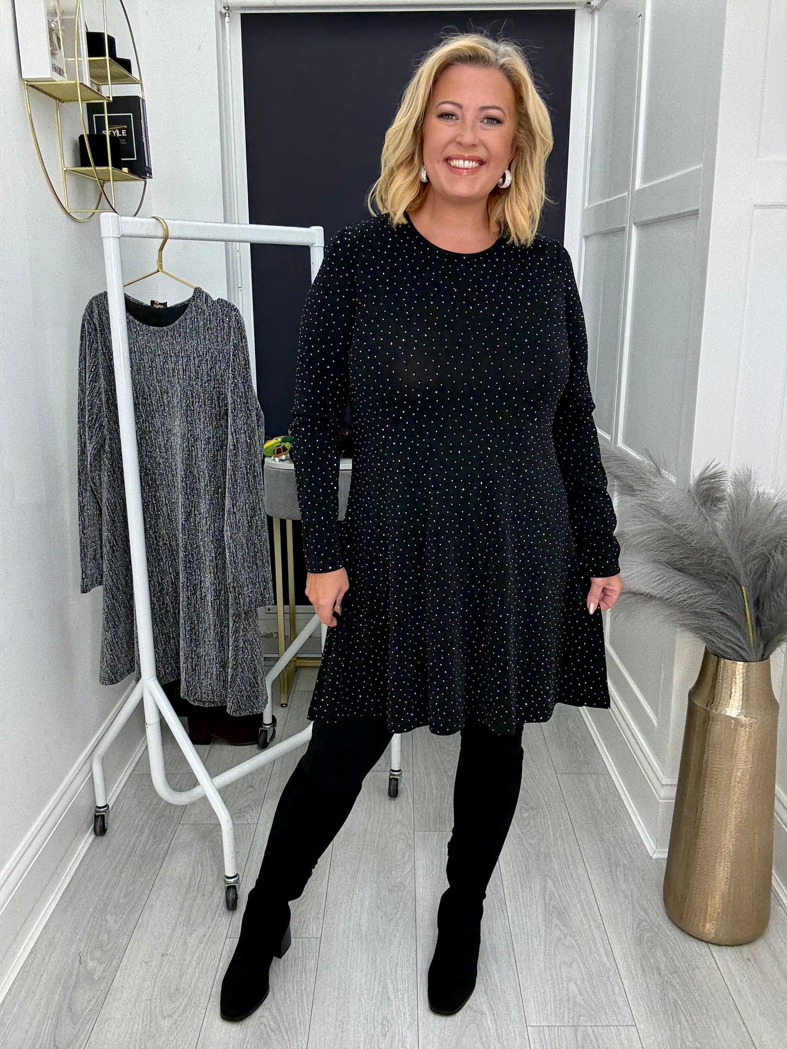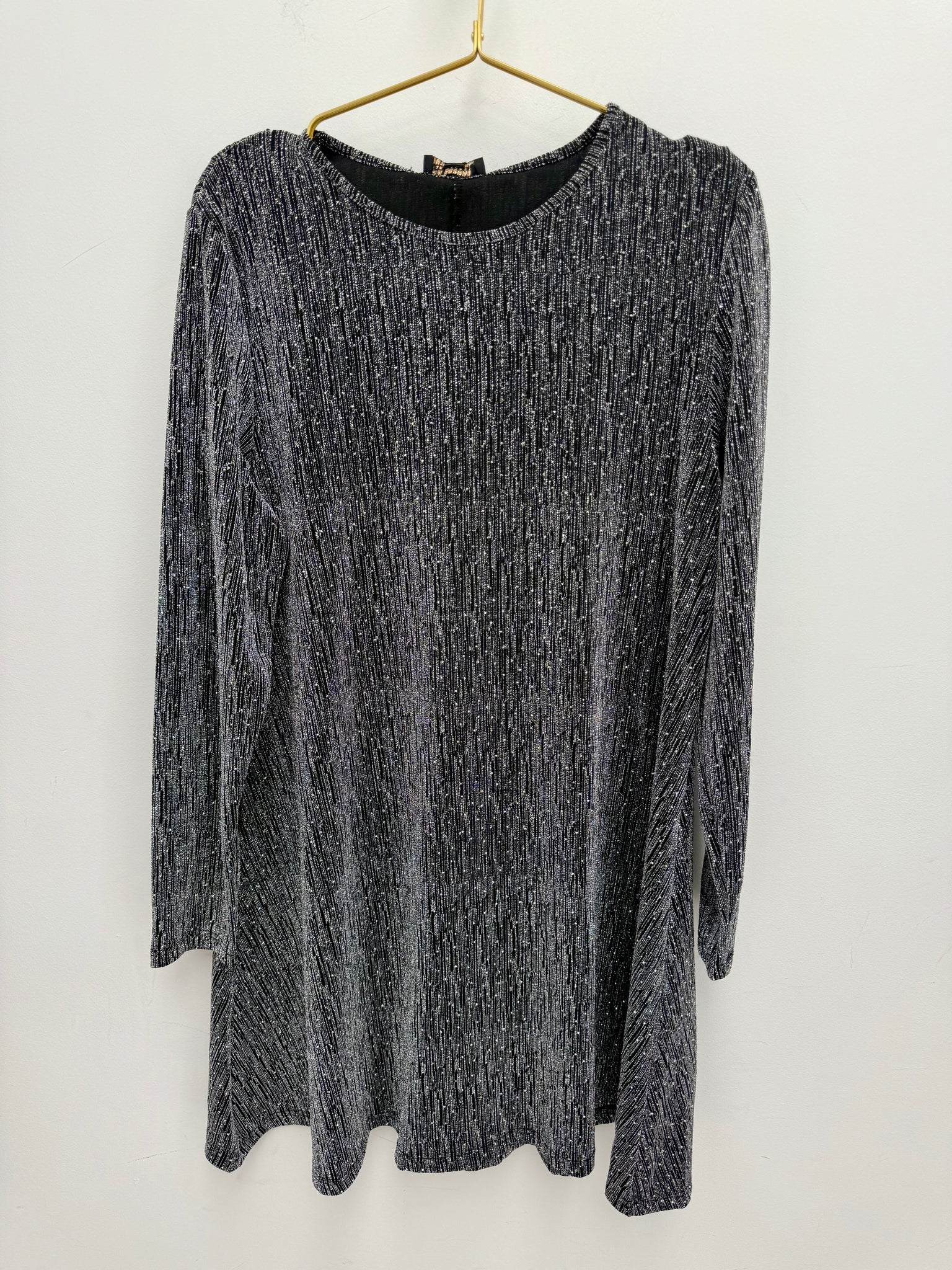 Stunning stretch lurex swing dress with scattered crystals.