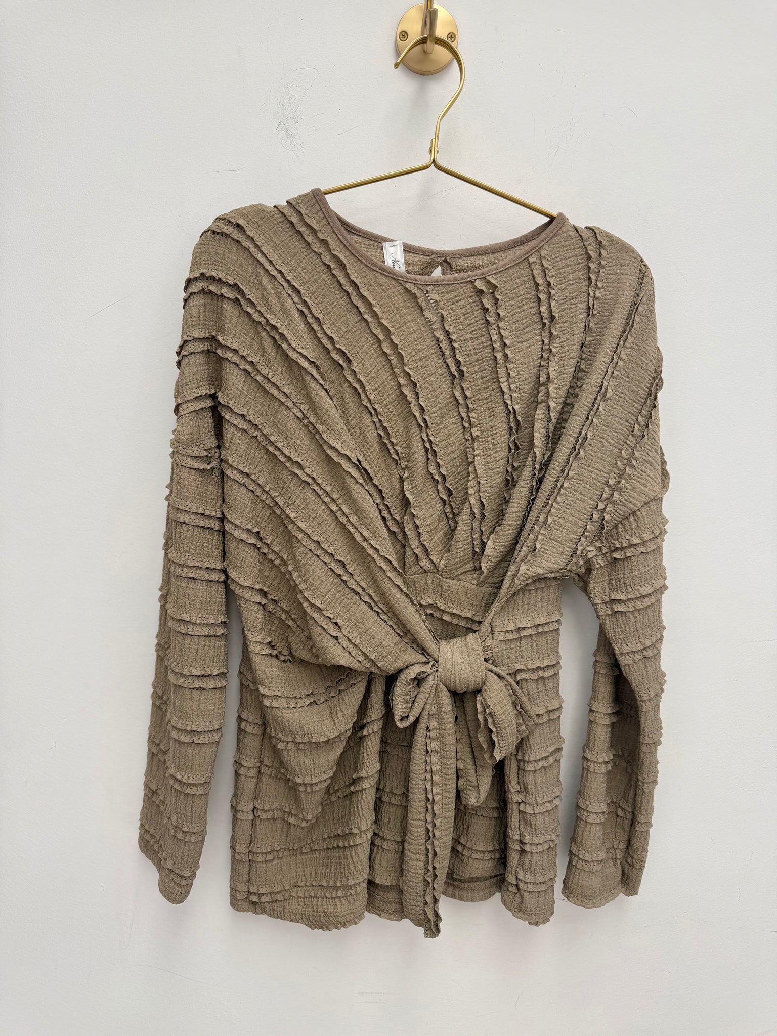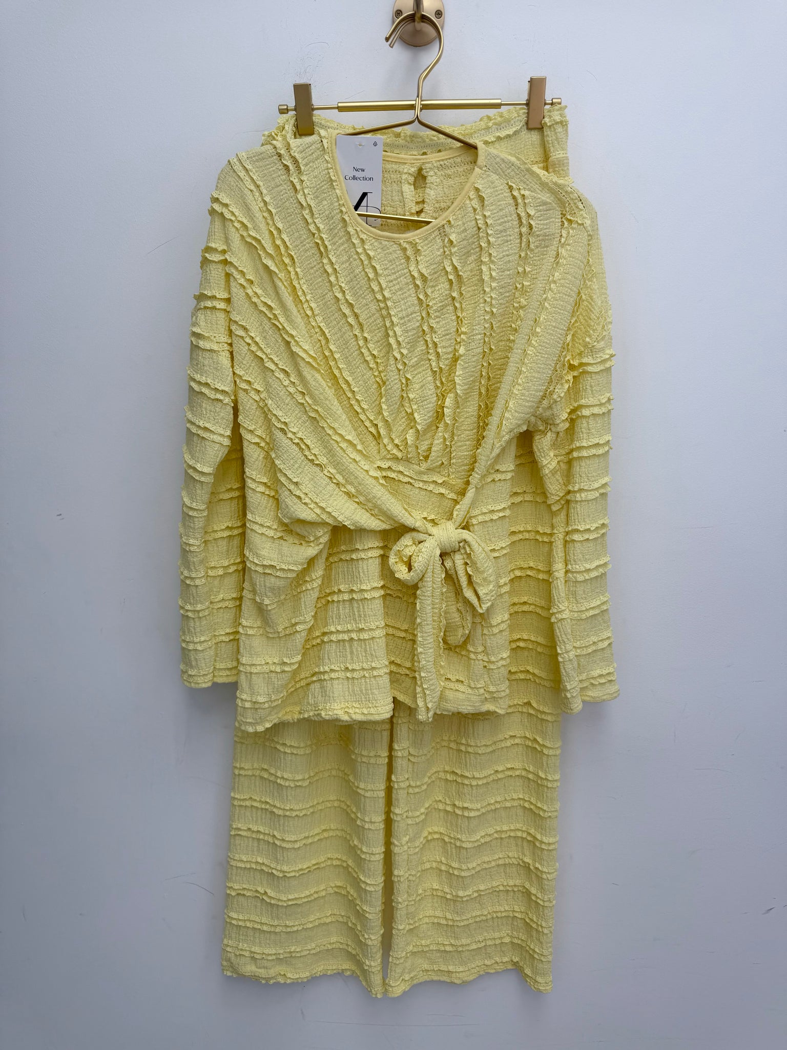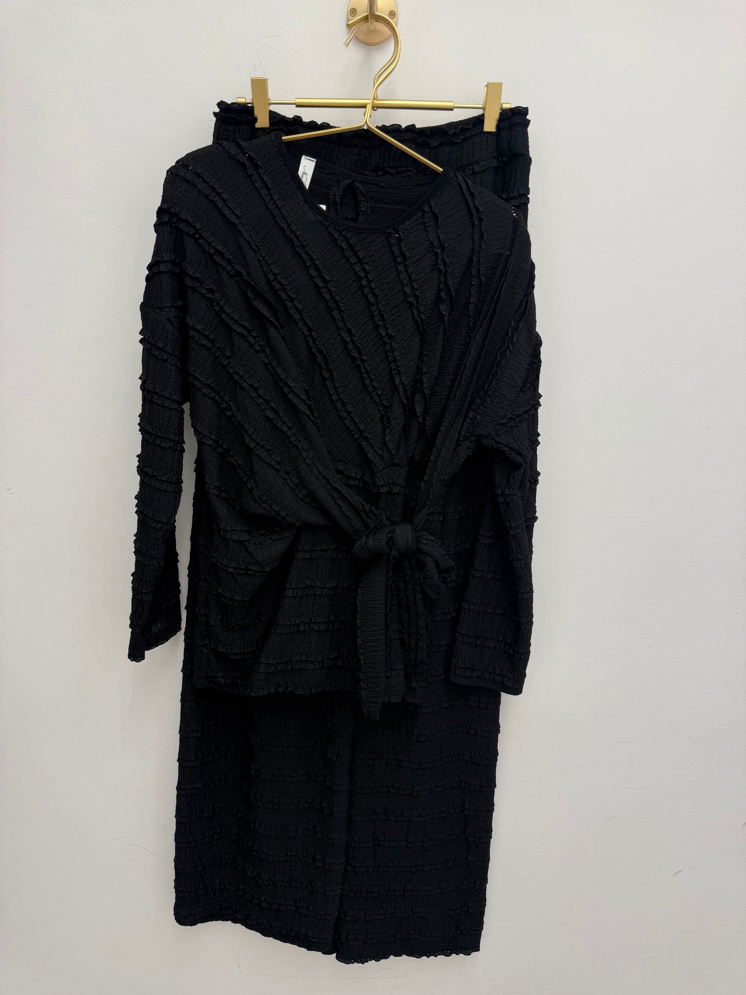 Stunning stretch ruffle frill flattering adjustable tie top with matching high waisted stretch waistband trousers.