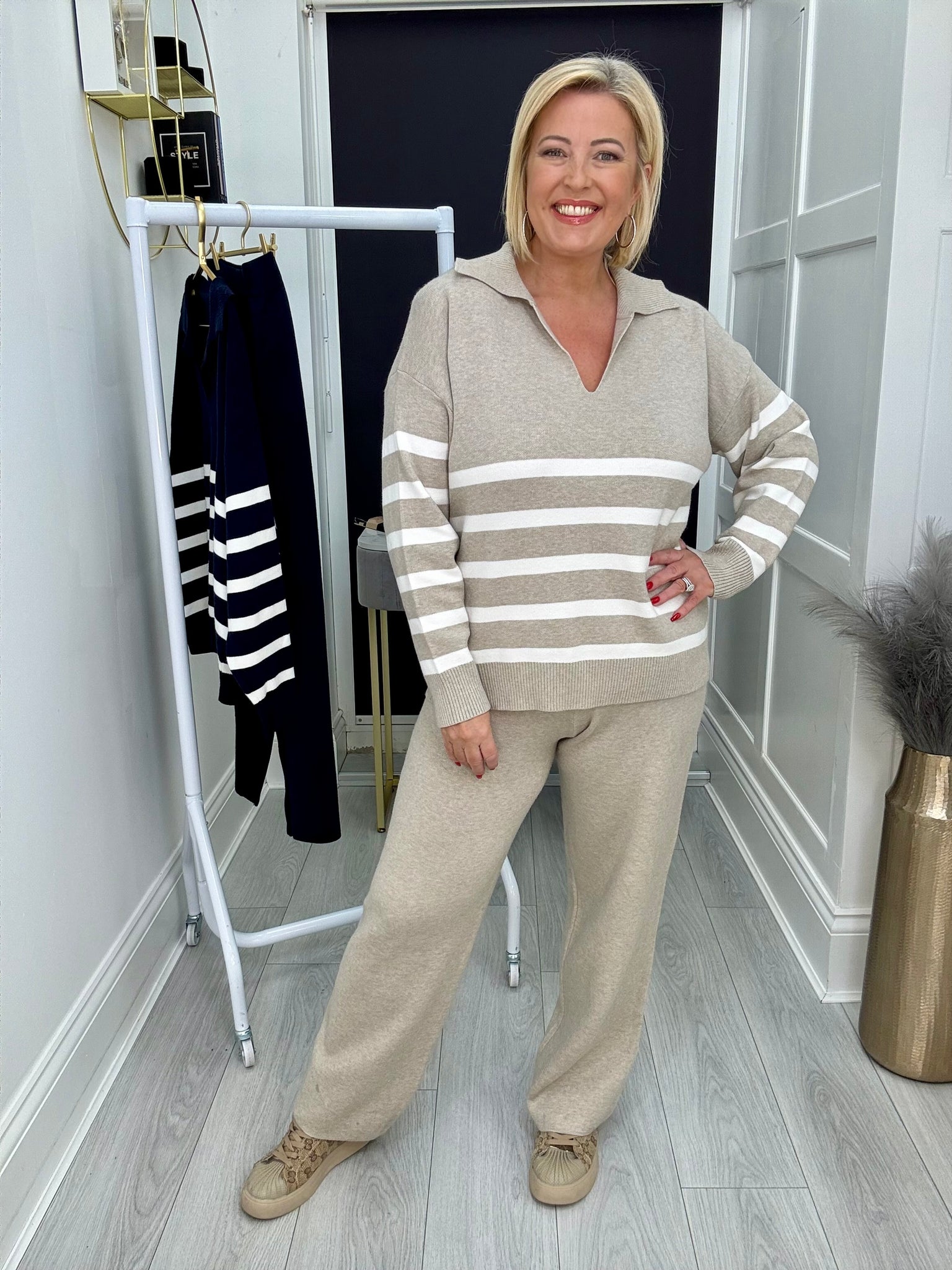 Gorgeous super soft stretch open collar jumper with matching high waisted trousers with pockets.