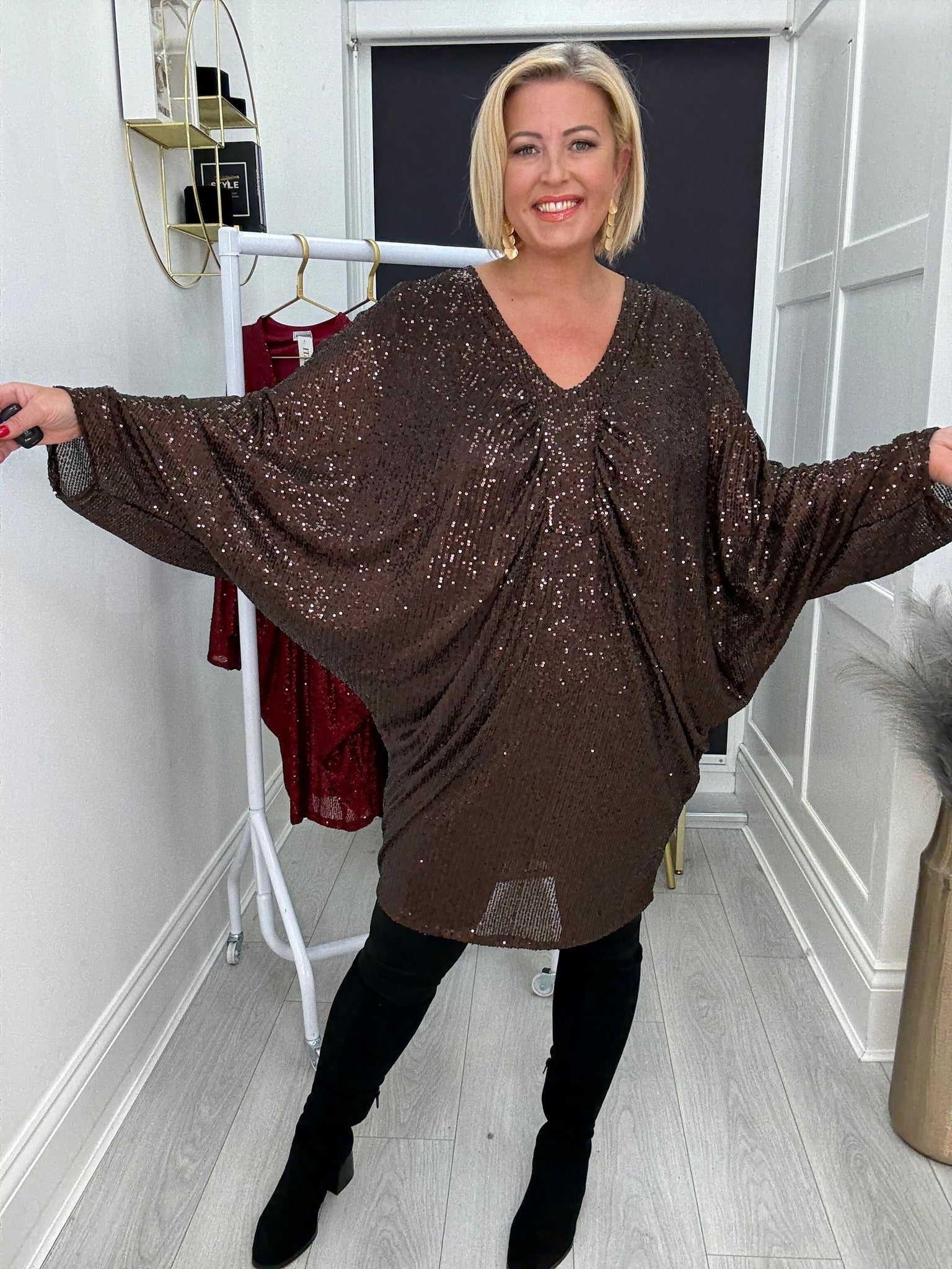 Stunning stretch batwing drape sequin dress with attached stretch lining.