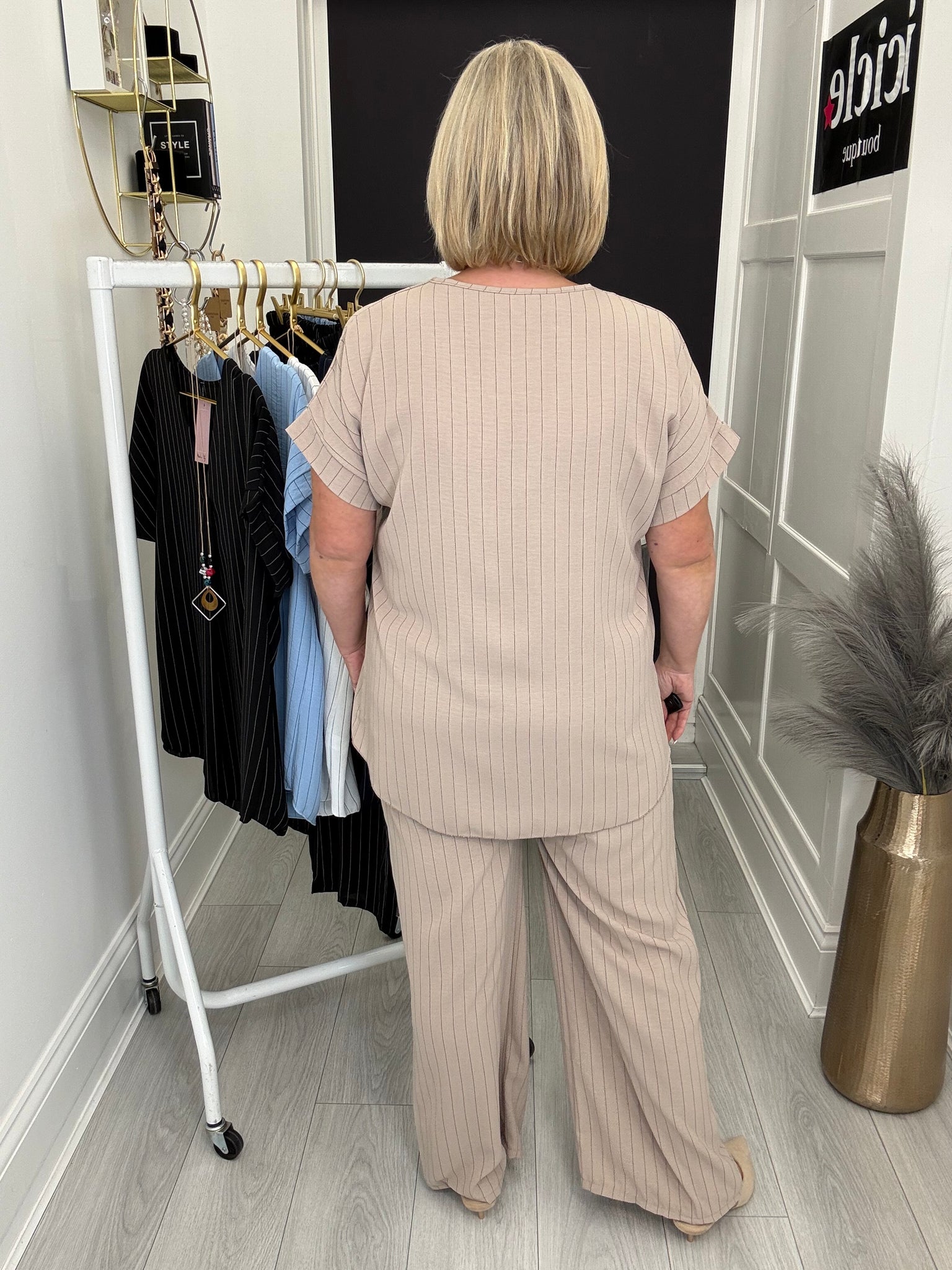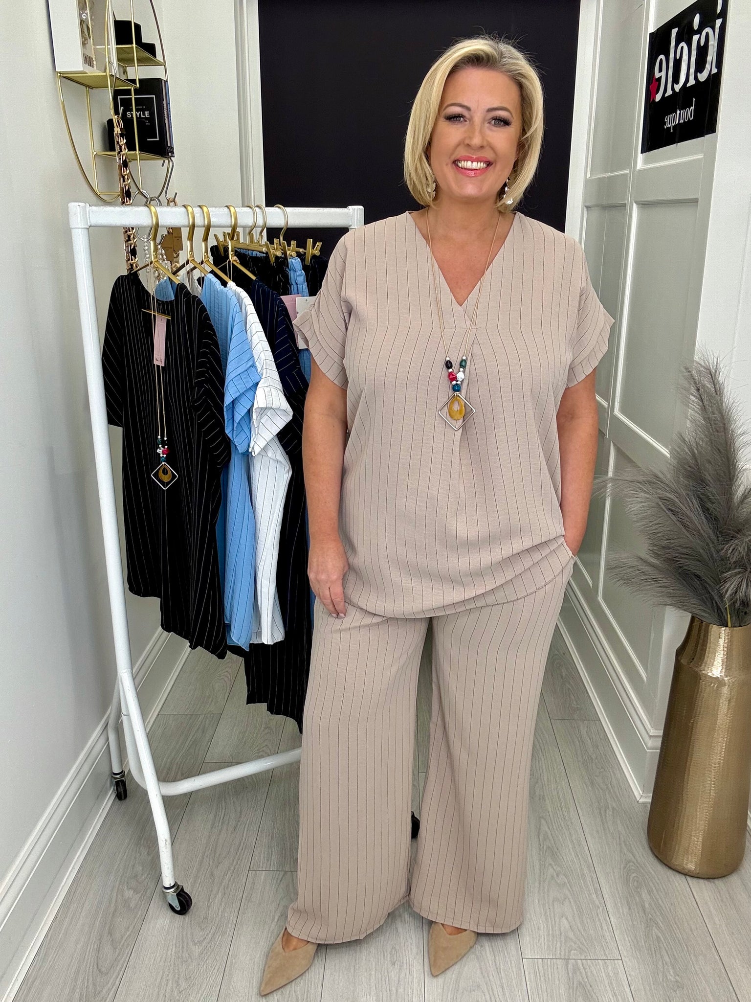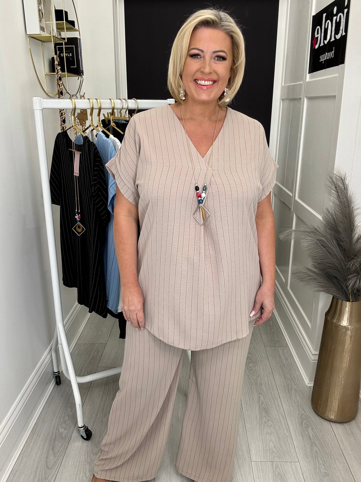 Gorgeous flattering pleat front non crease top with necklace.