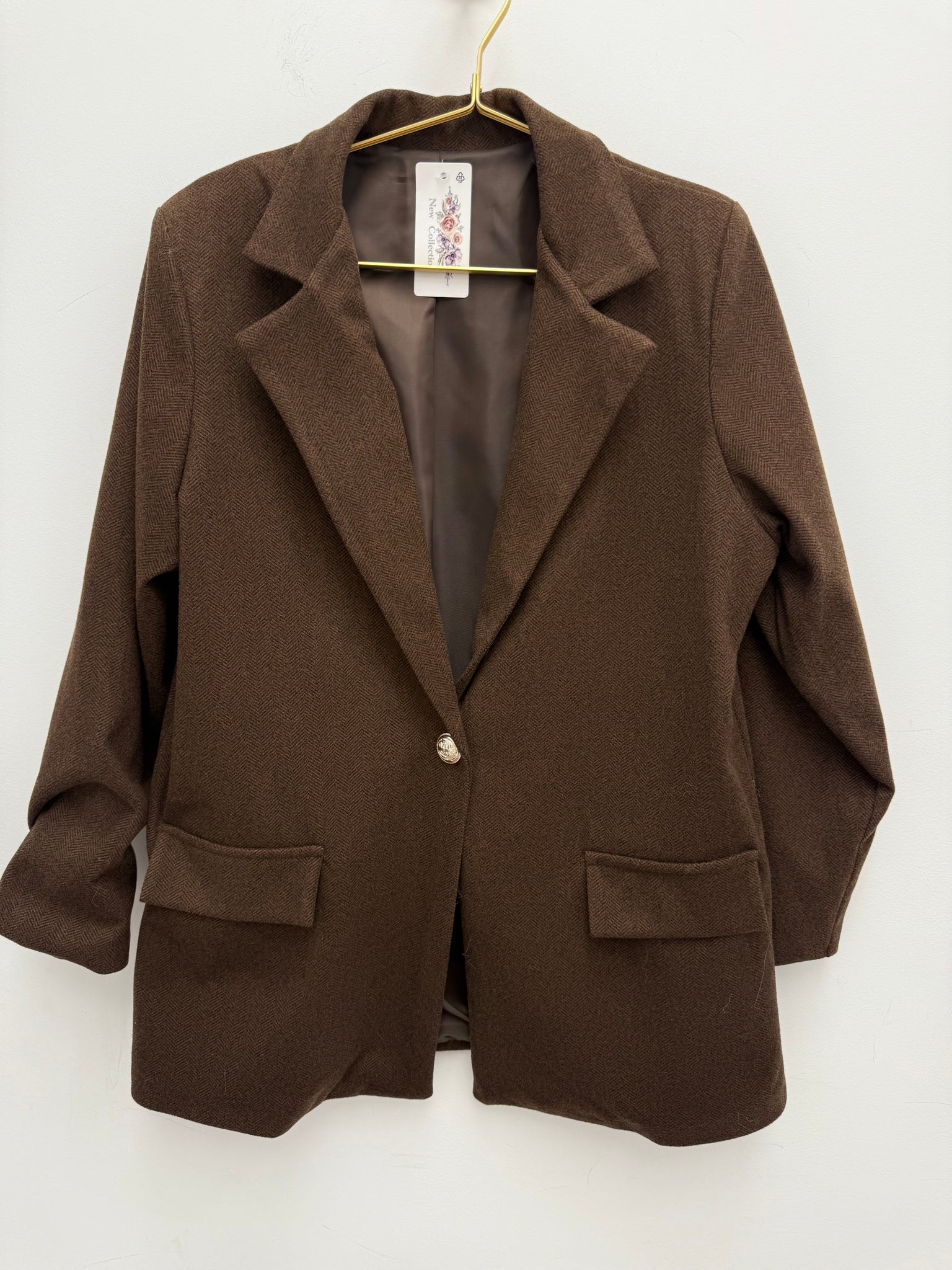 Stunning longline wool feel fully lined herringbone blazer with military button, shoulder pads and mock pockets.