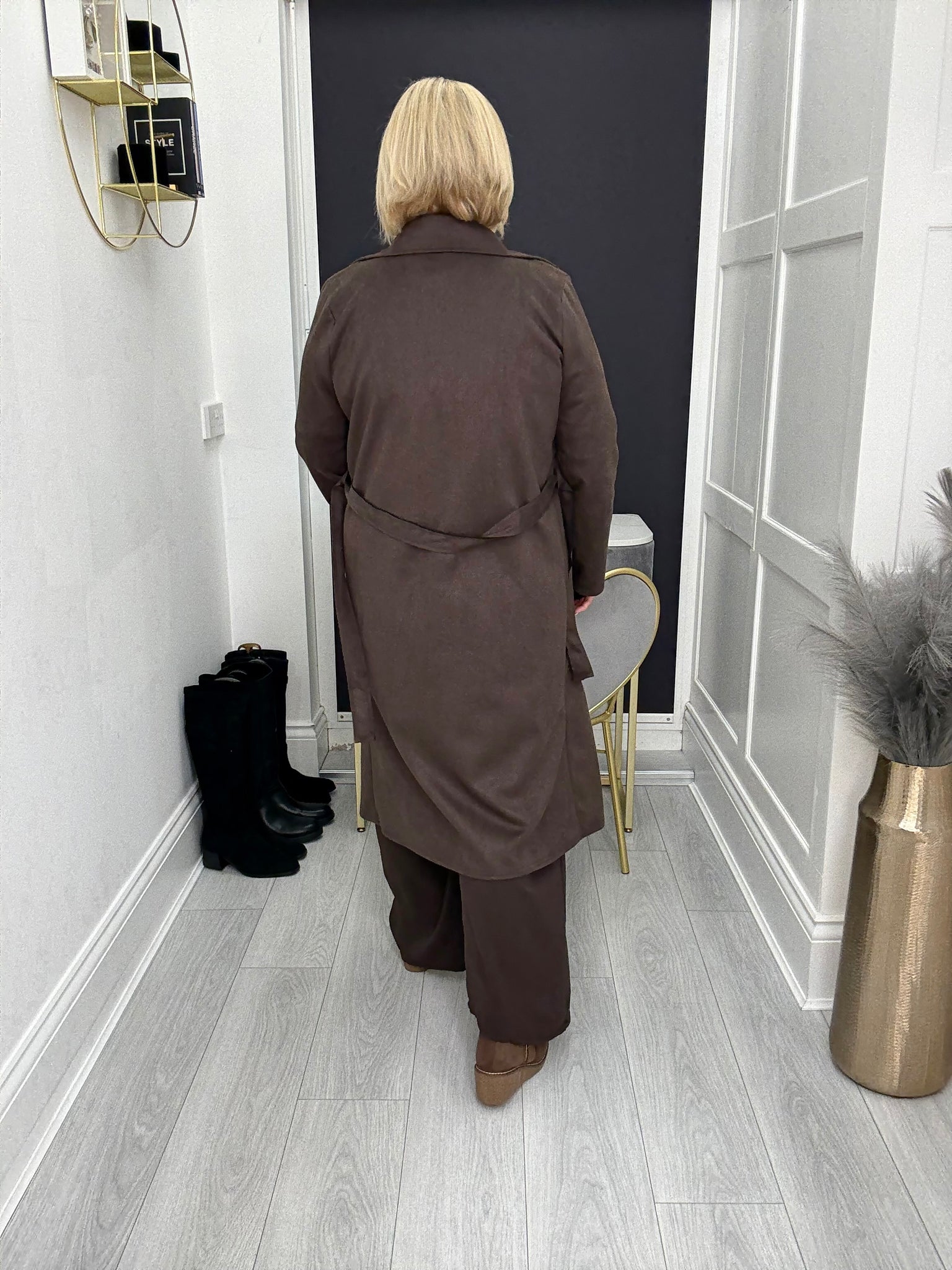 Gorgeous soft stretch suedette trench coat with pockets.
