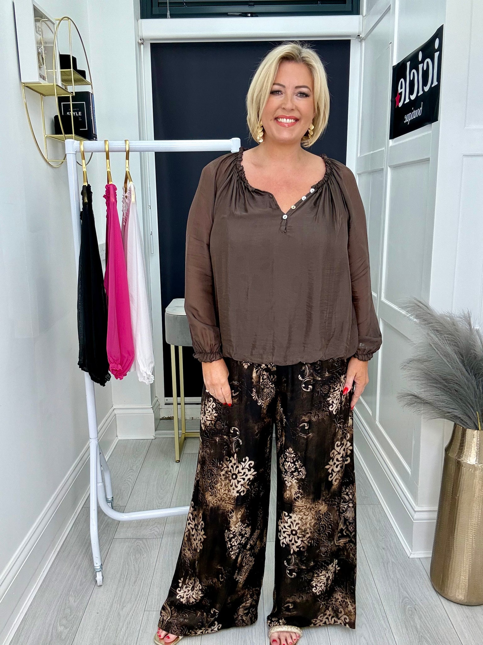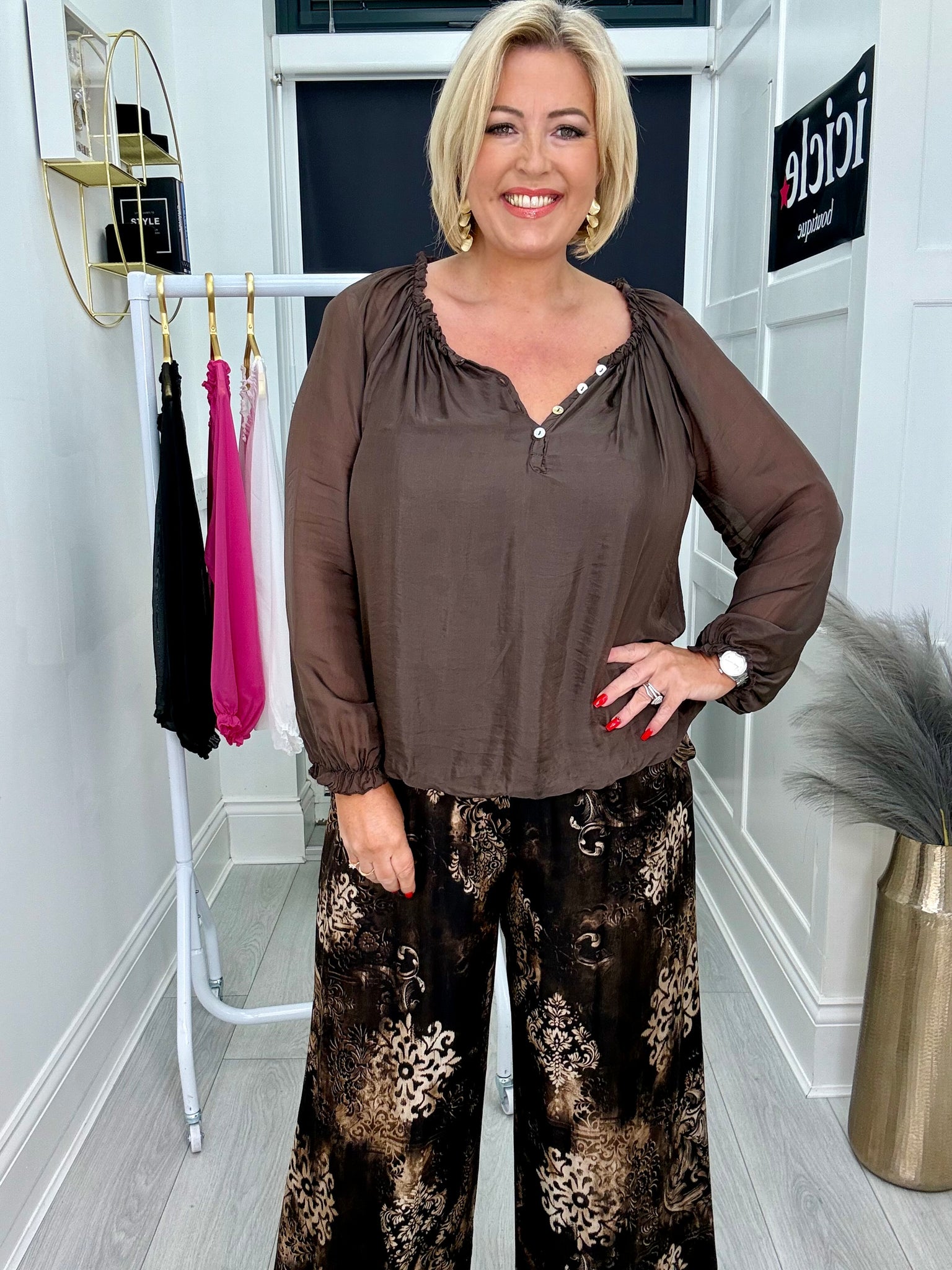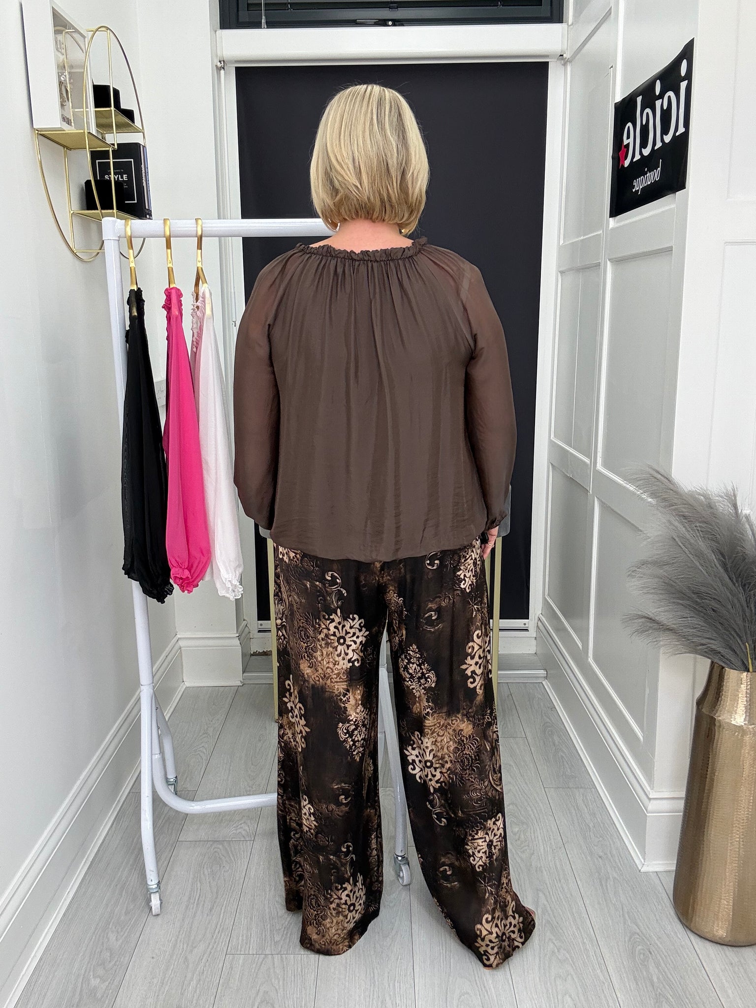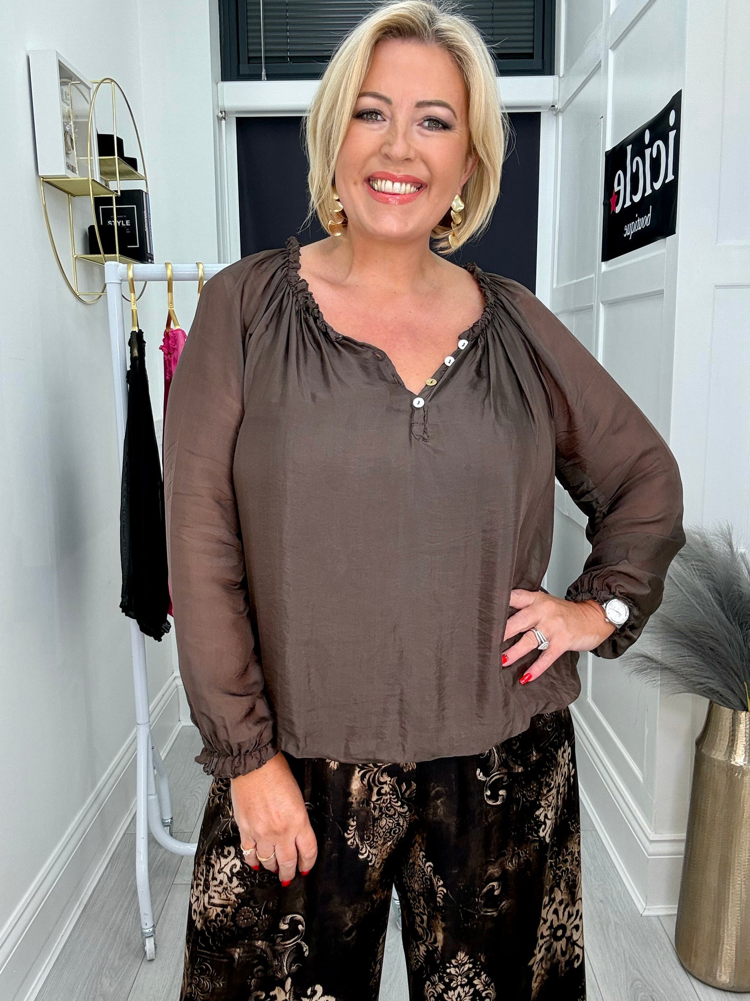 Stunning silk top with attached stretch lining and stretch bubble hem.