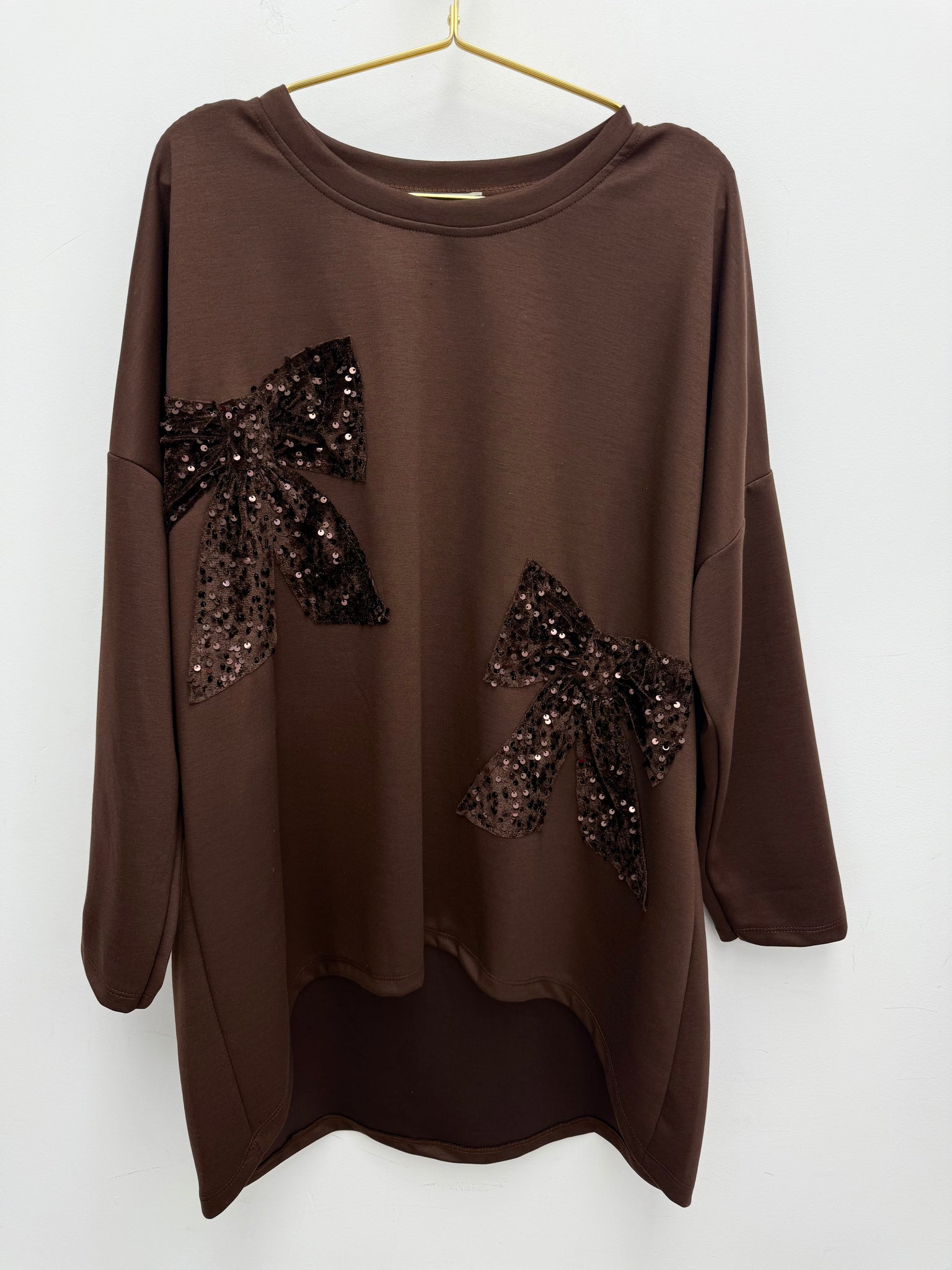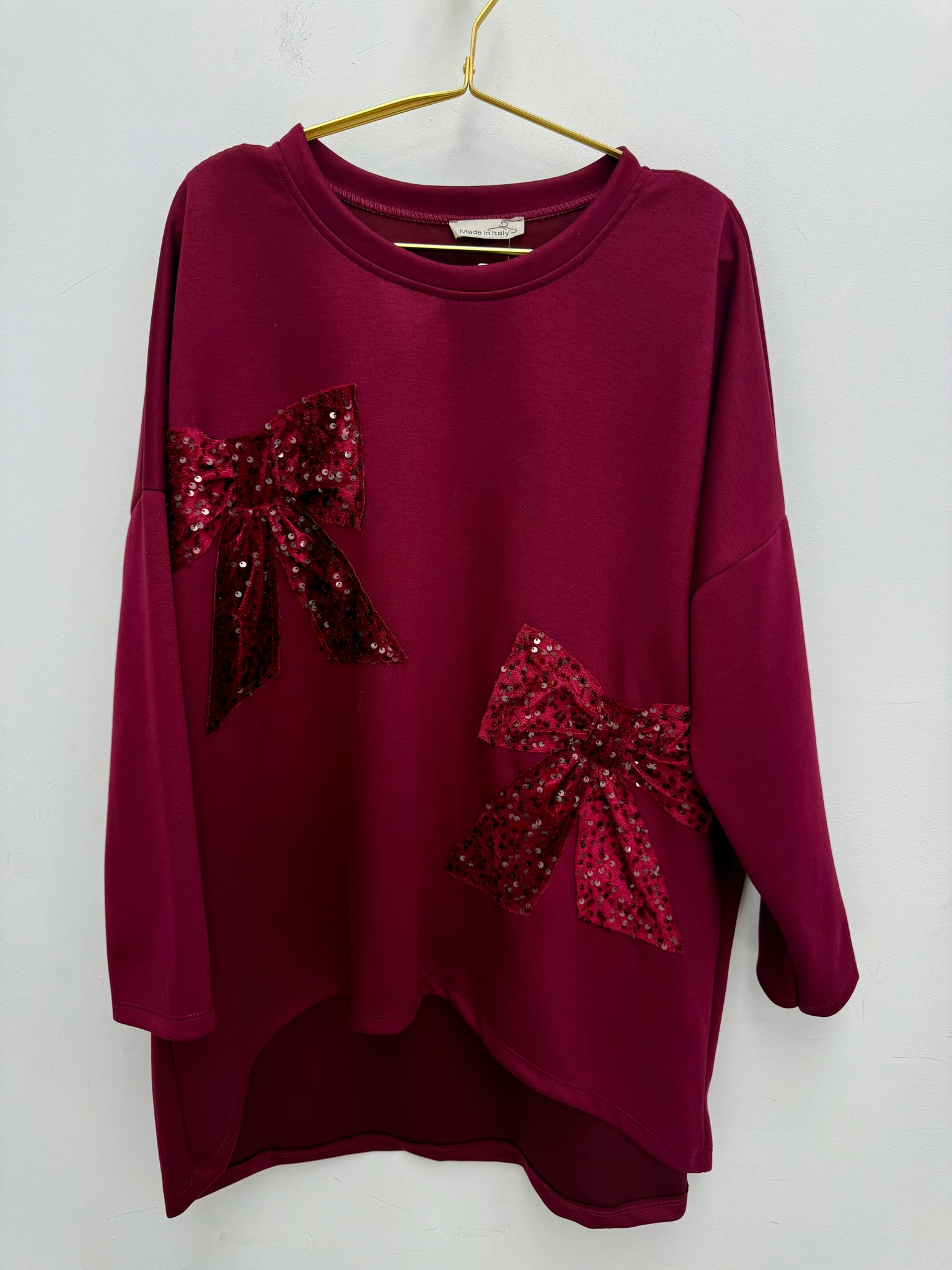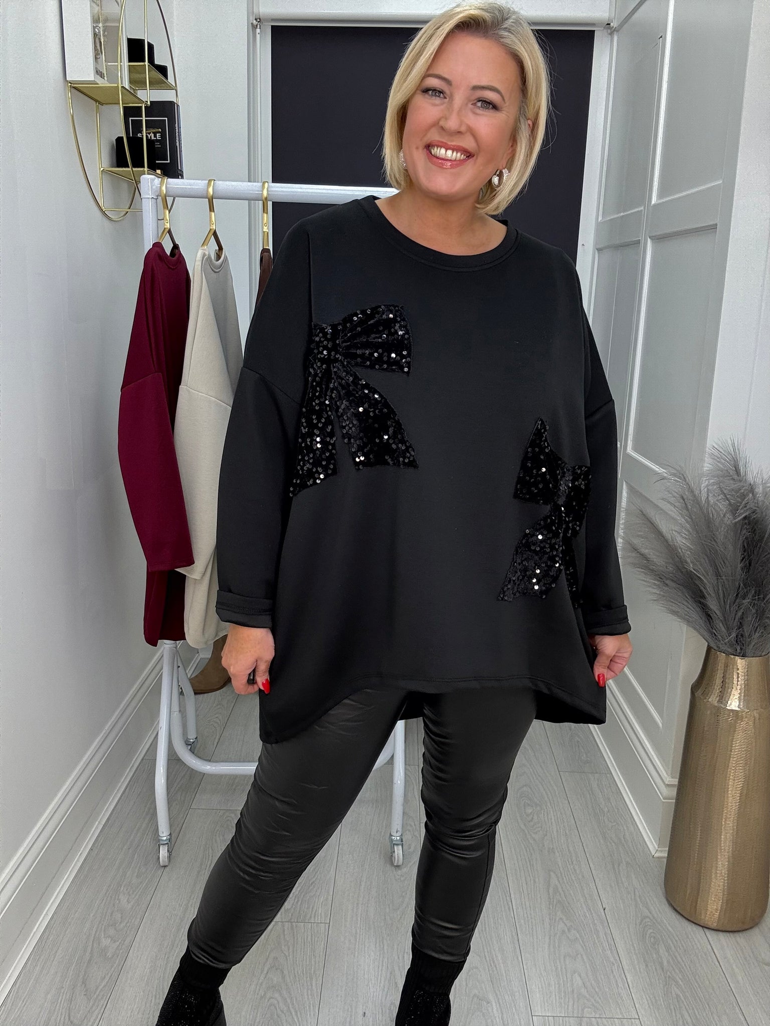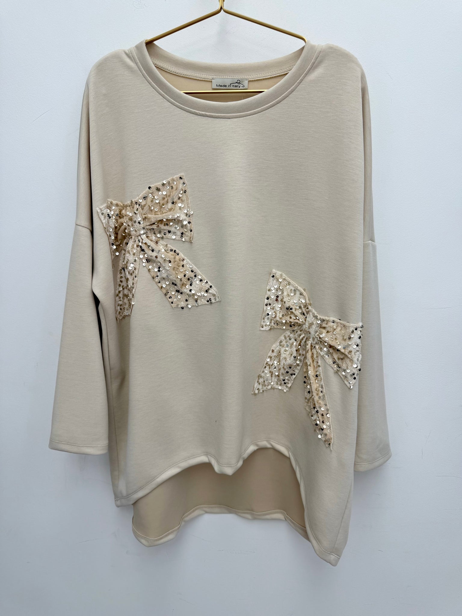 Stunning silky stretch dip back top (light scuba fabric) with sequin bows.