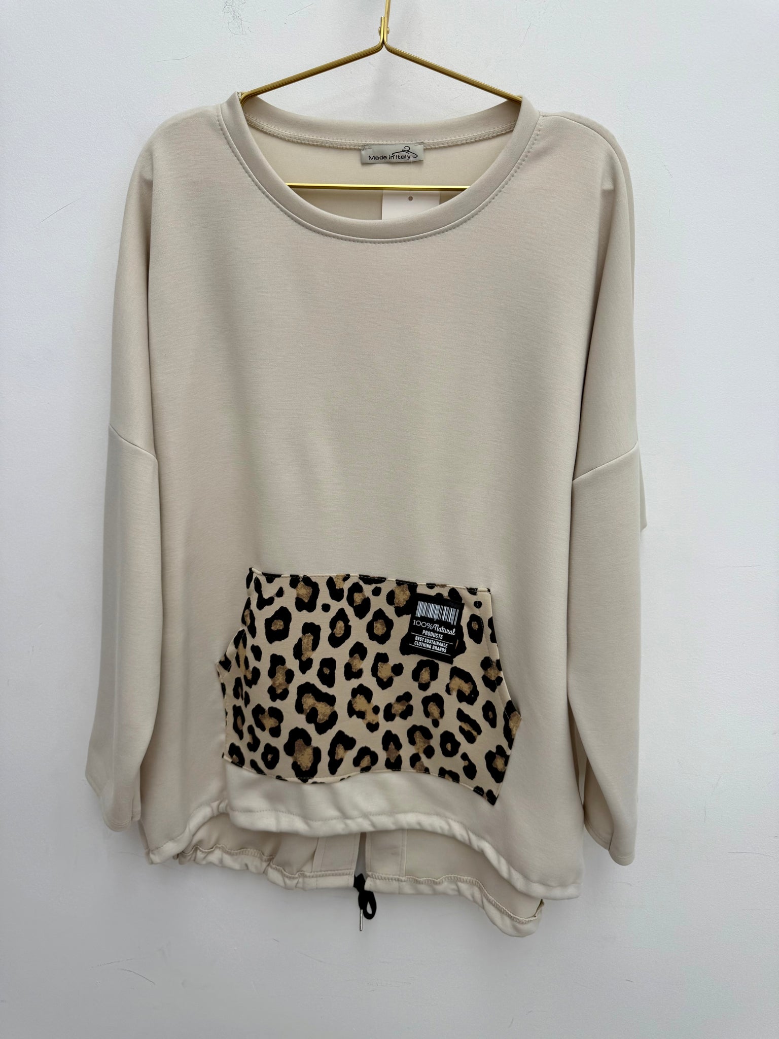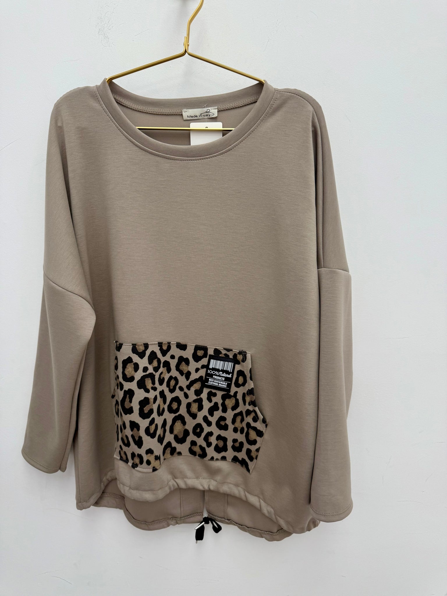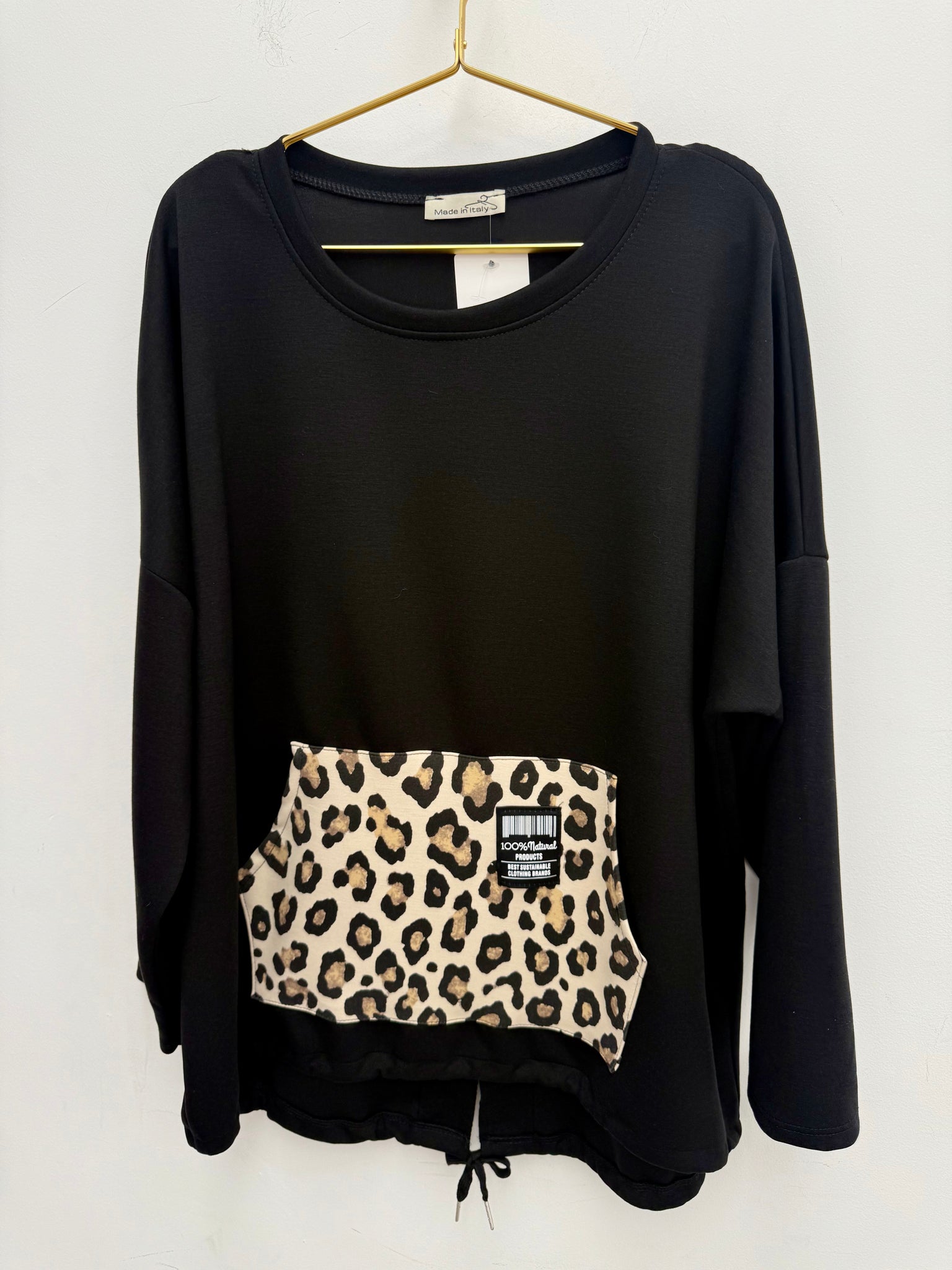Gorgeous soft silky smooth stretch (light scuba fabric) dip back top with leopard kangaroo pocket and adjustable drawcord.