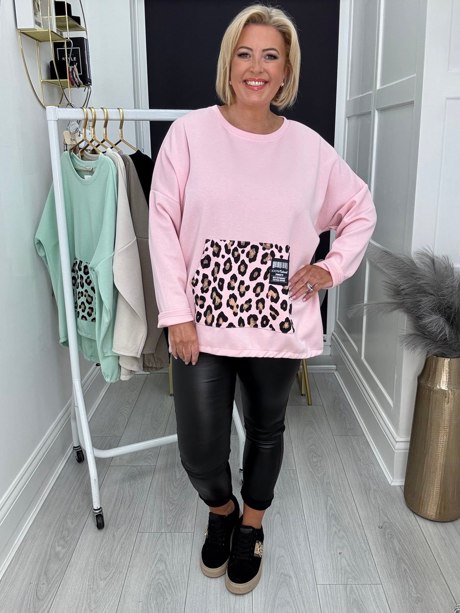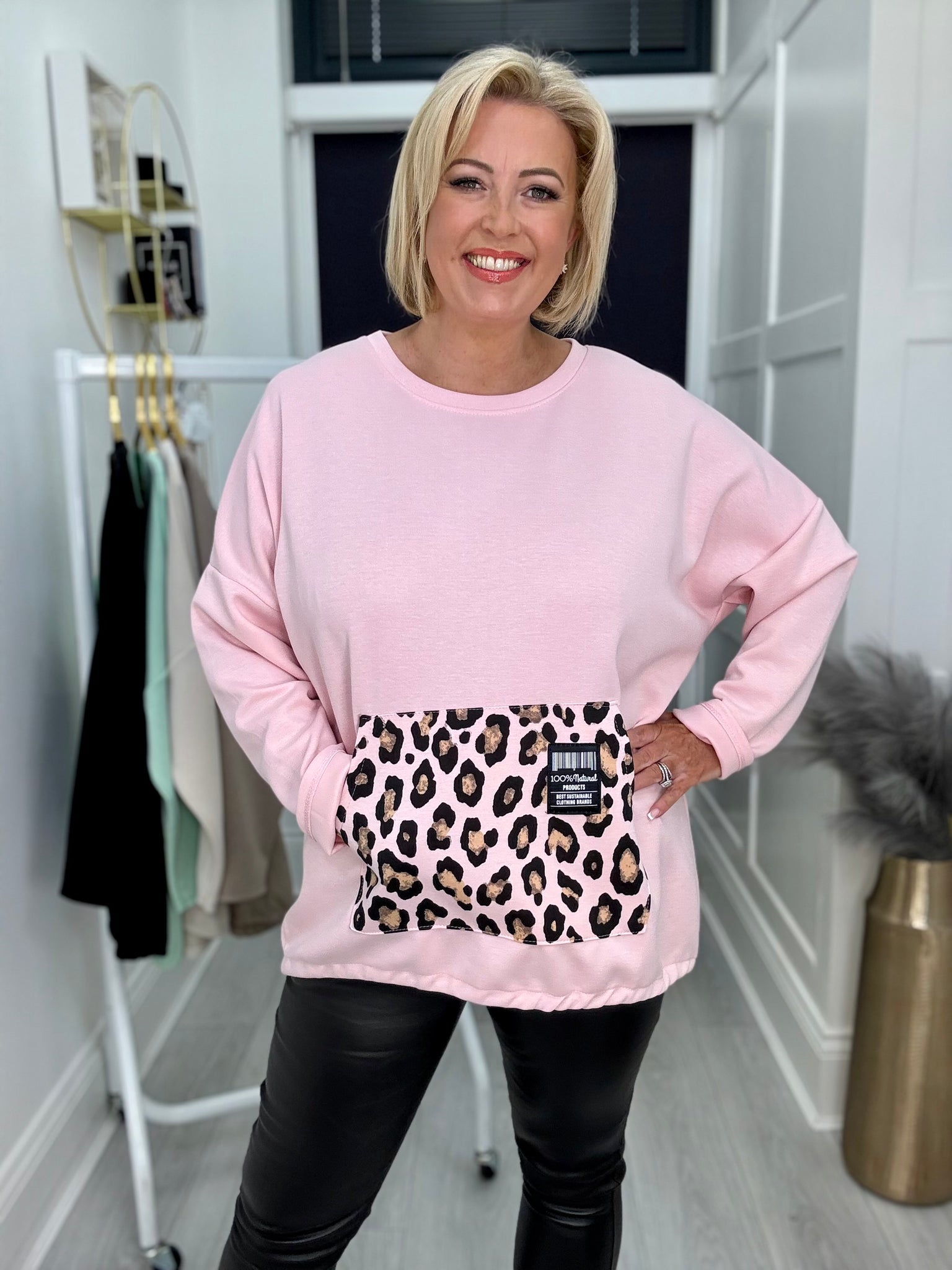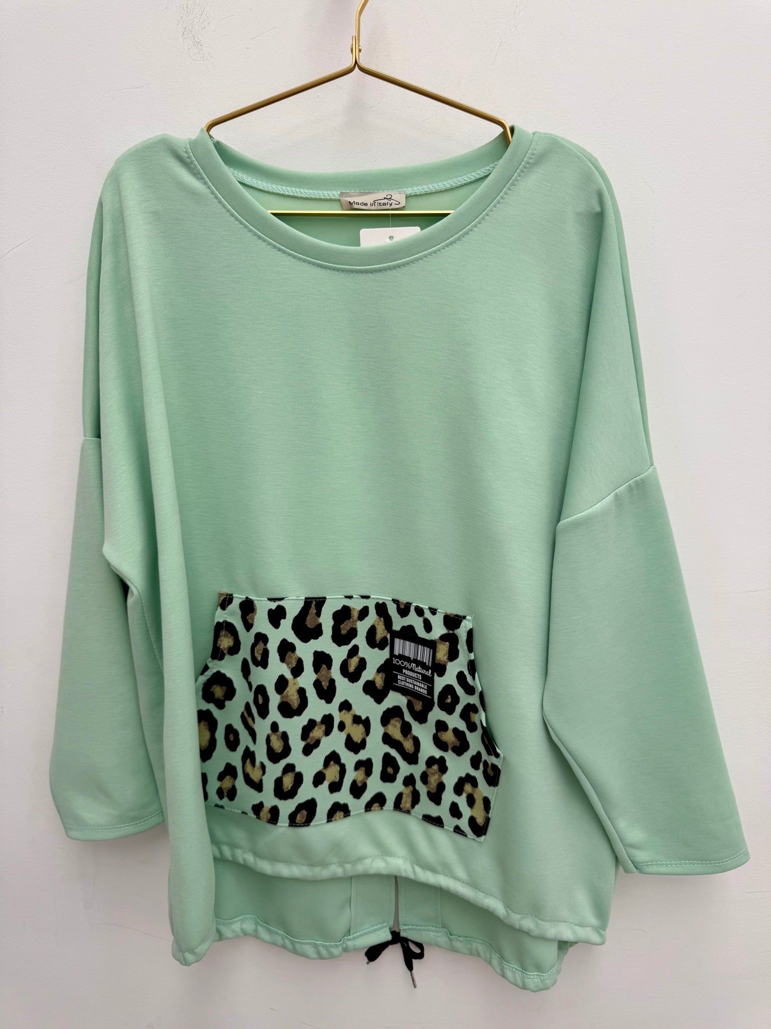 Gorgeous soft silky smooth stretch (light scuba fabric) dip back top with leopard kangaroo pocket and adjustable drawcord.