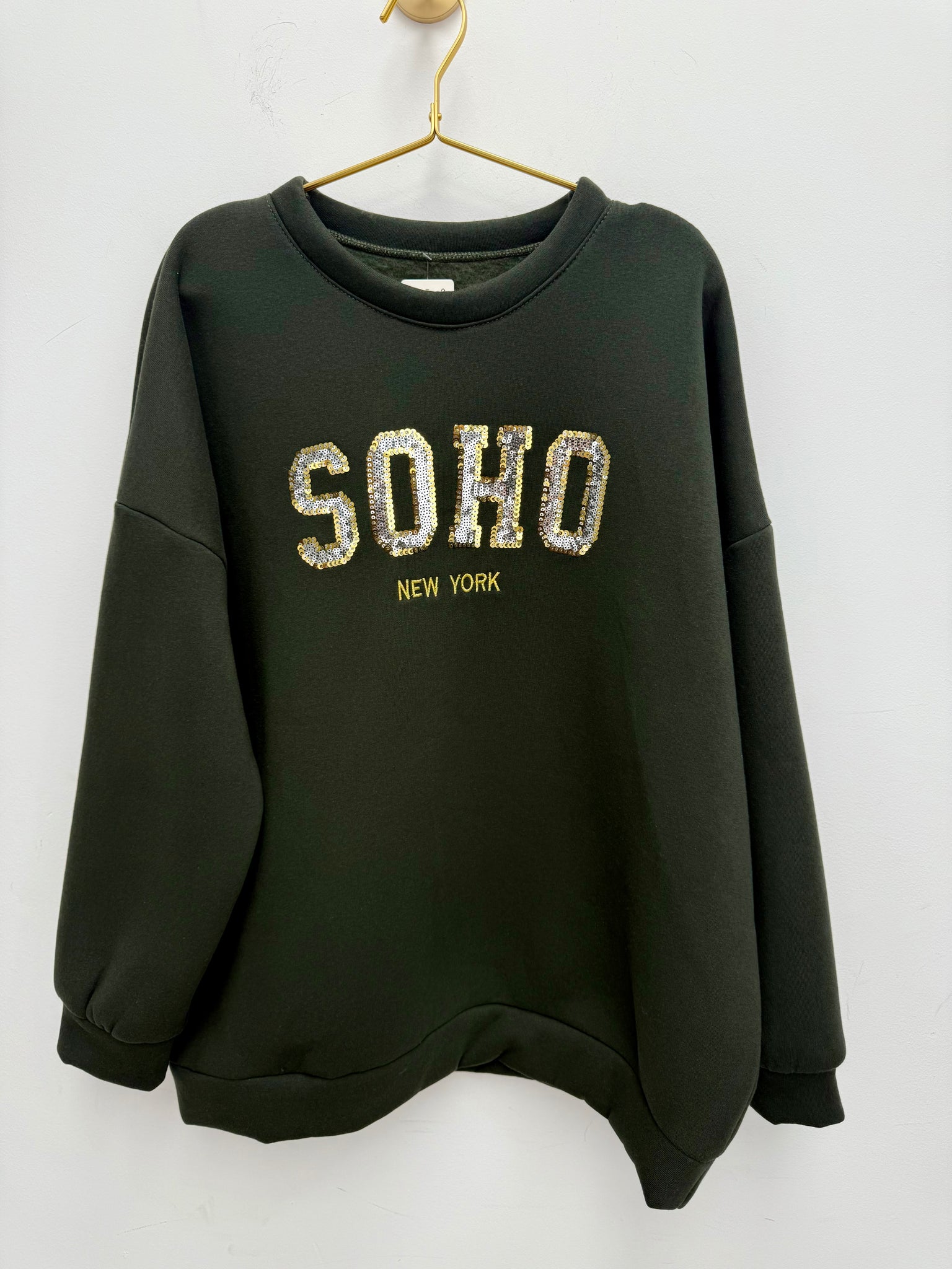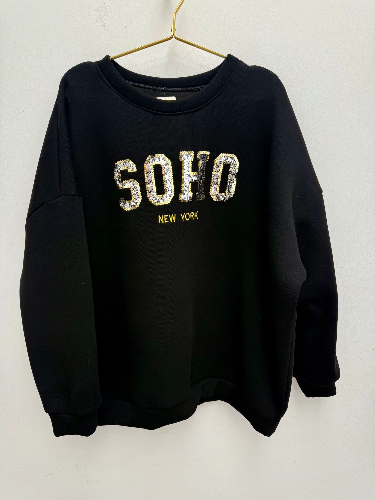 Gorgeous soft cotton oversized fleece back sweatshirt with gold/silver sequin logo.