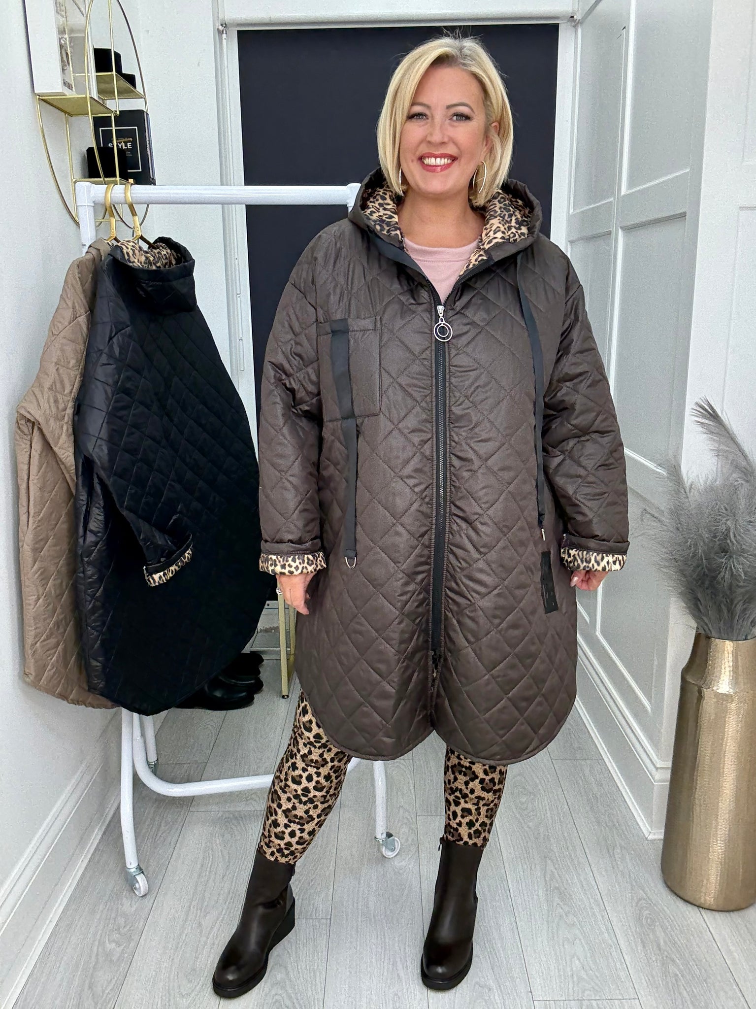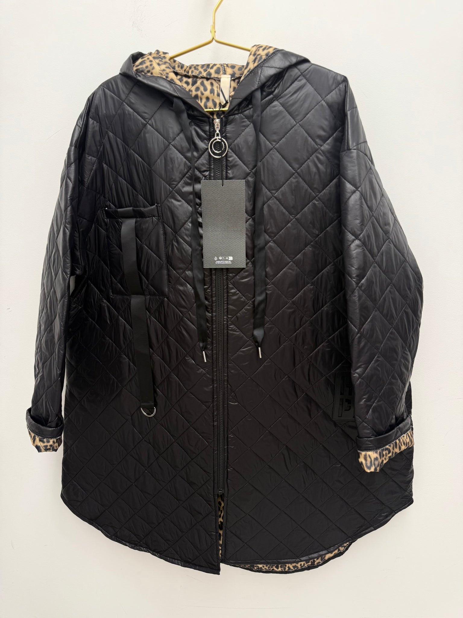 Gorgeous oversized padded leopard contrast coat with pockets, and zip fastening.
