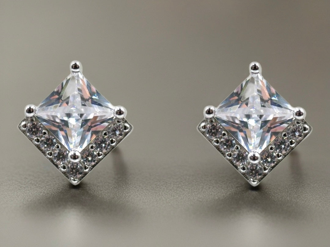 Pretty rhodium plated real sterling silver stud earrings with clear cubic zirconia stones.