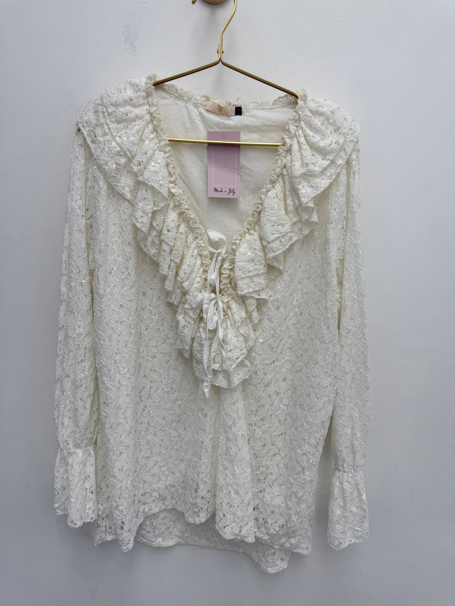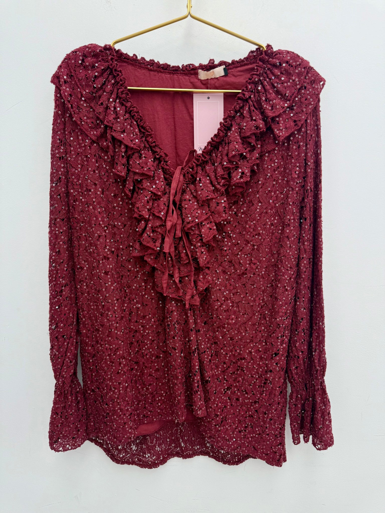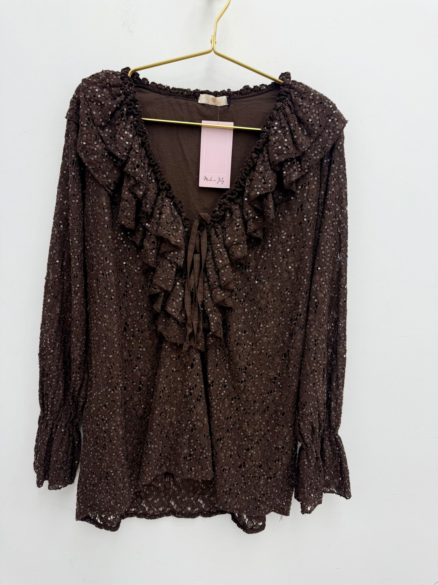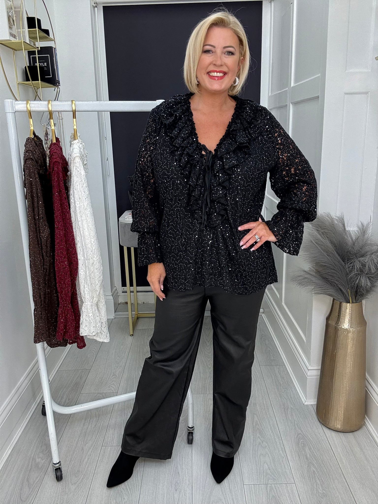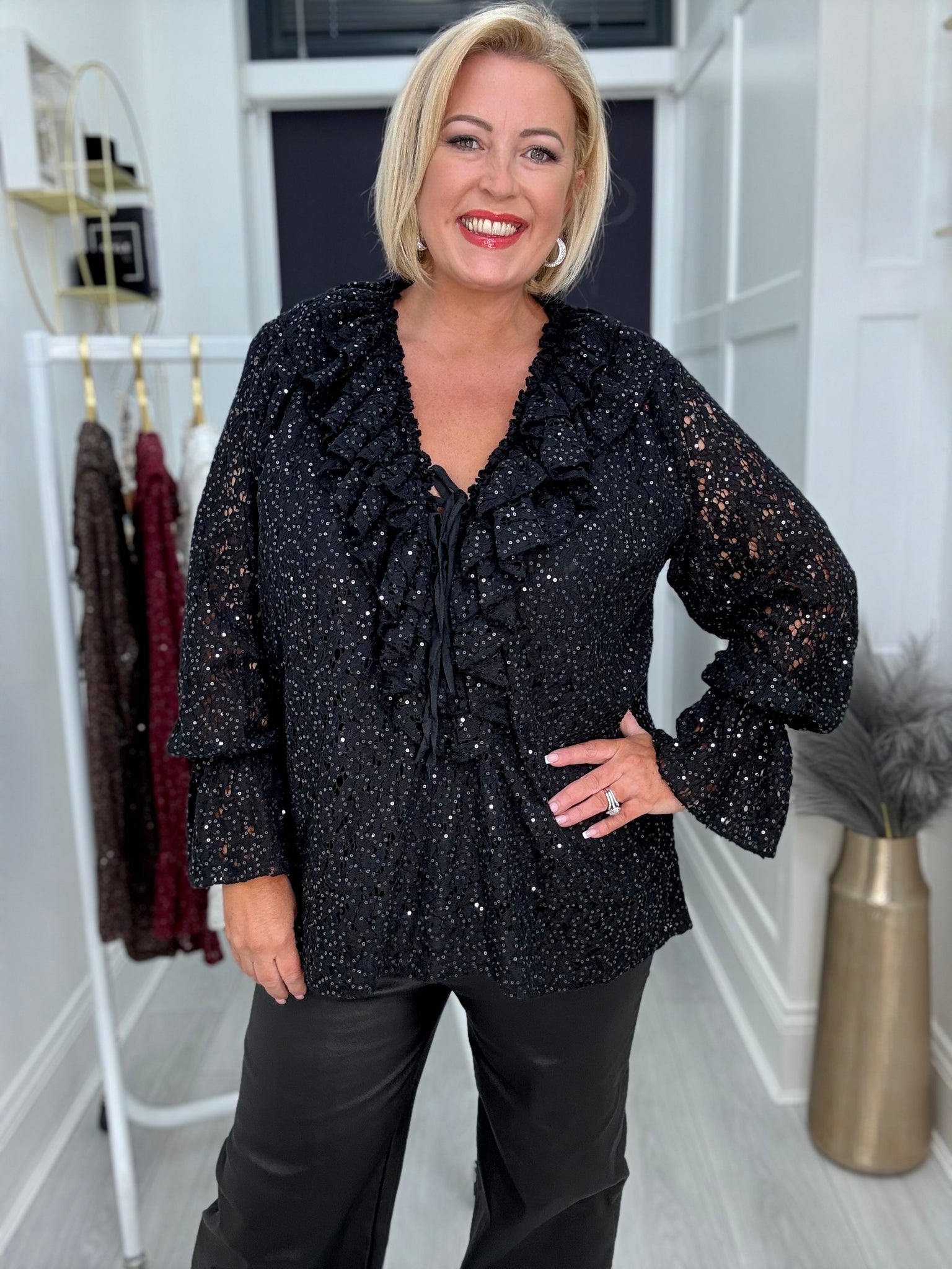 Stunning stretch lace ruffle dip back top with tiny clear sequins, adjustable ties and attached stretch lining.