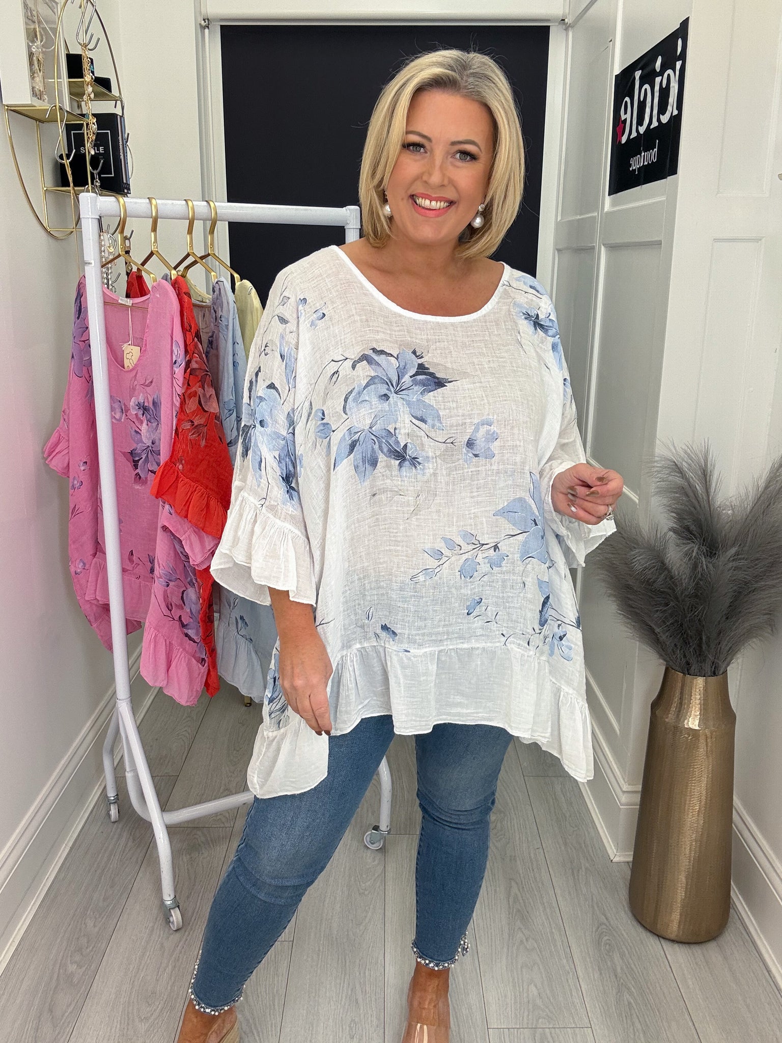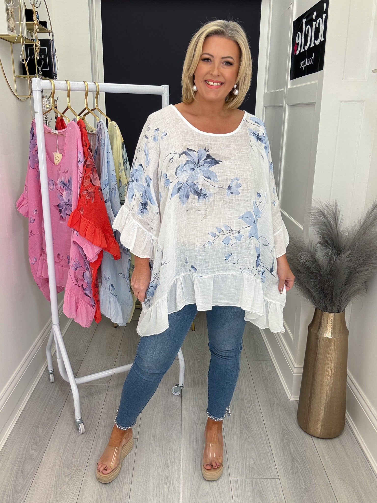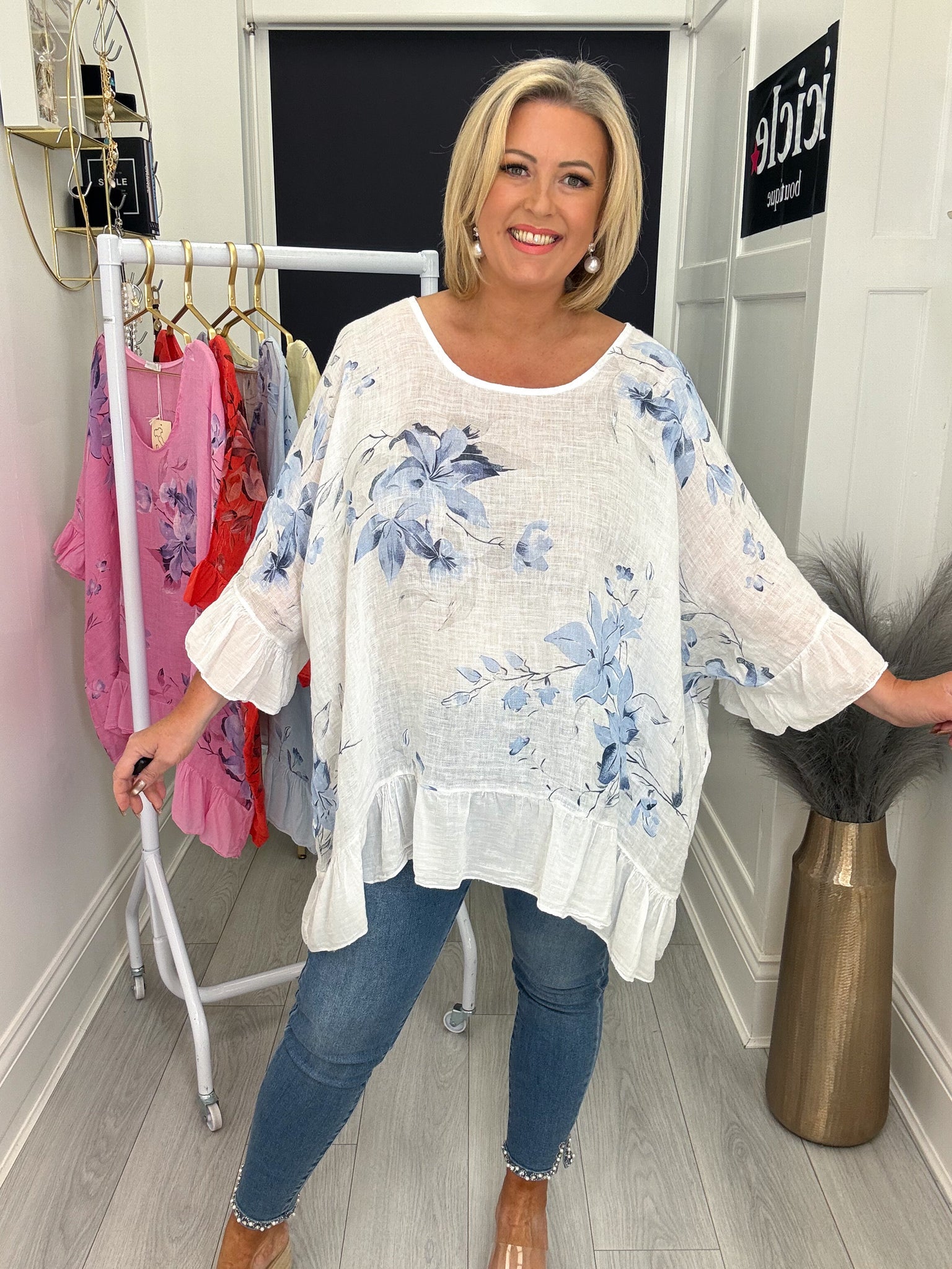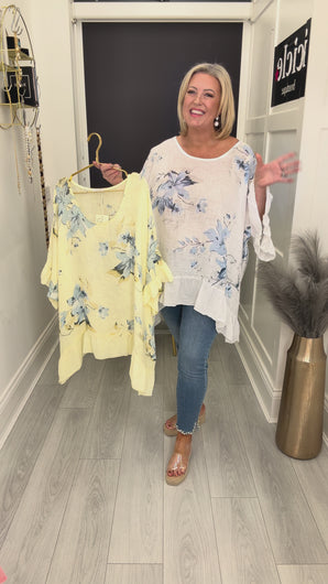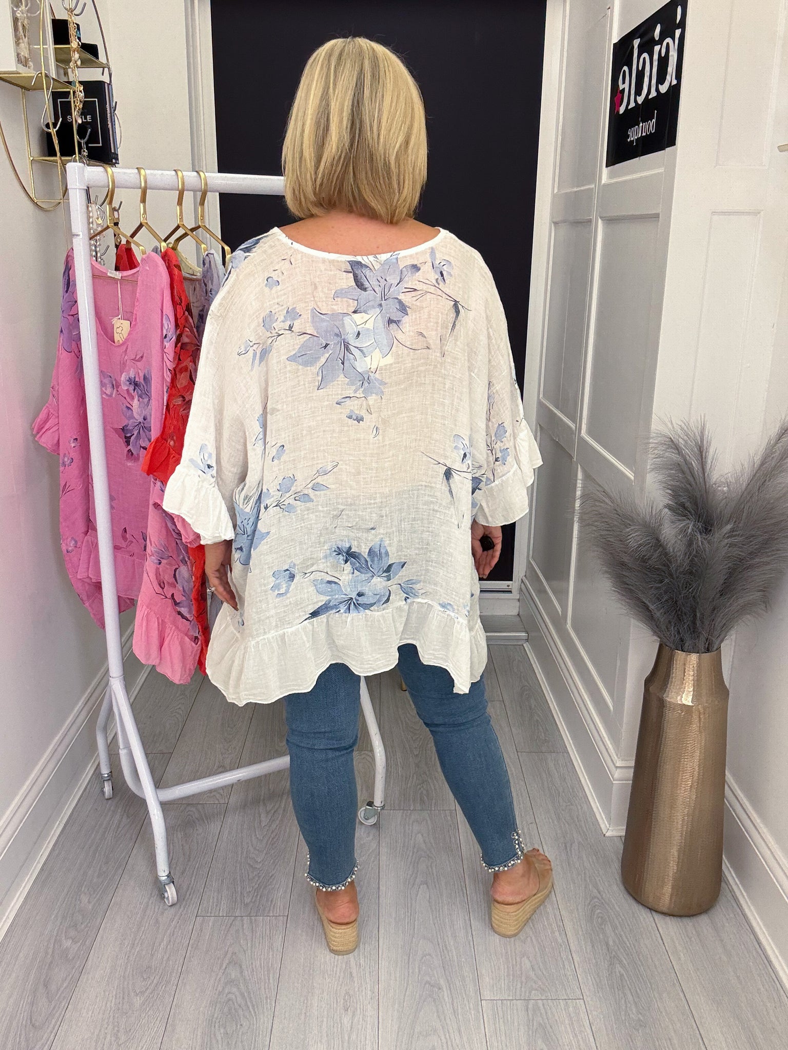 Beautiful oversized linen top with frill edging.