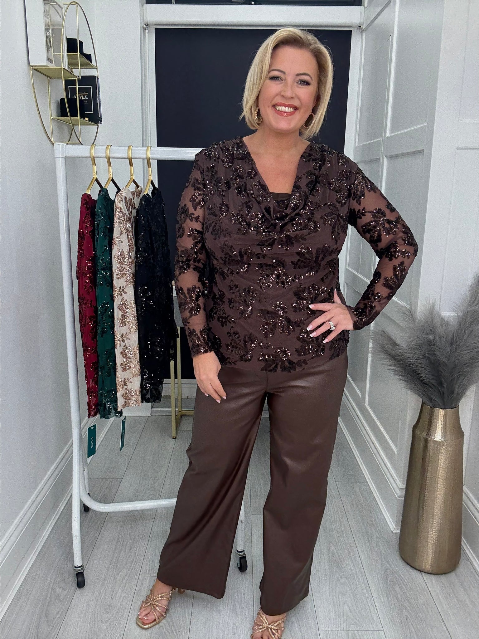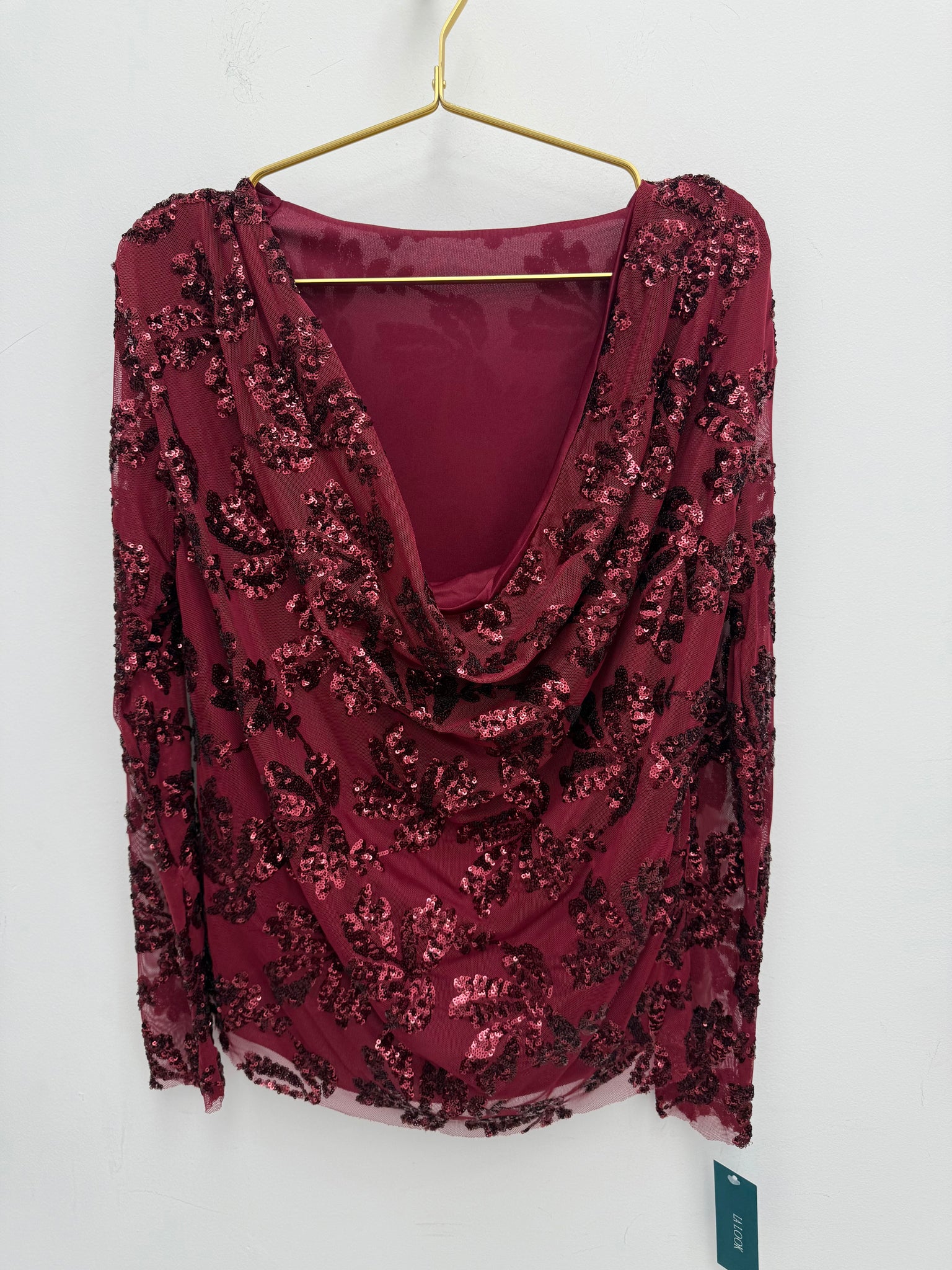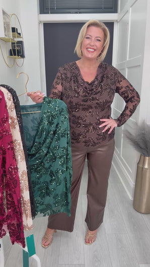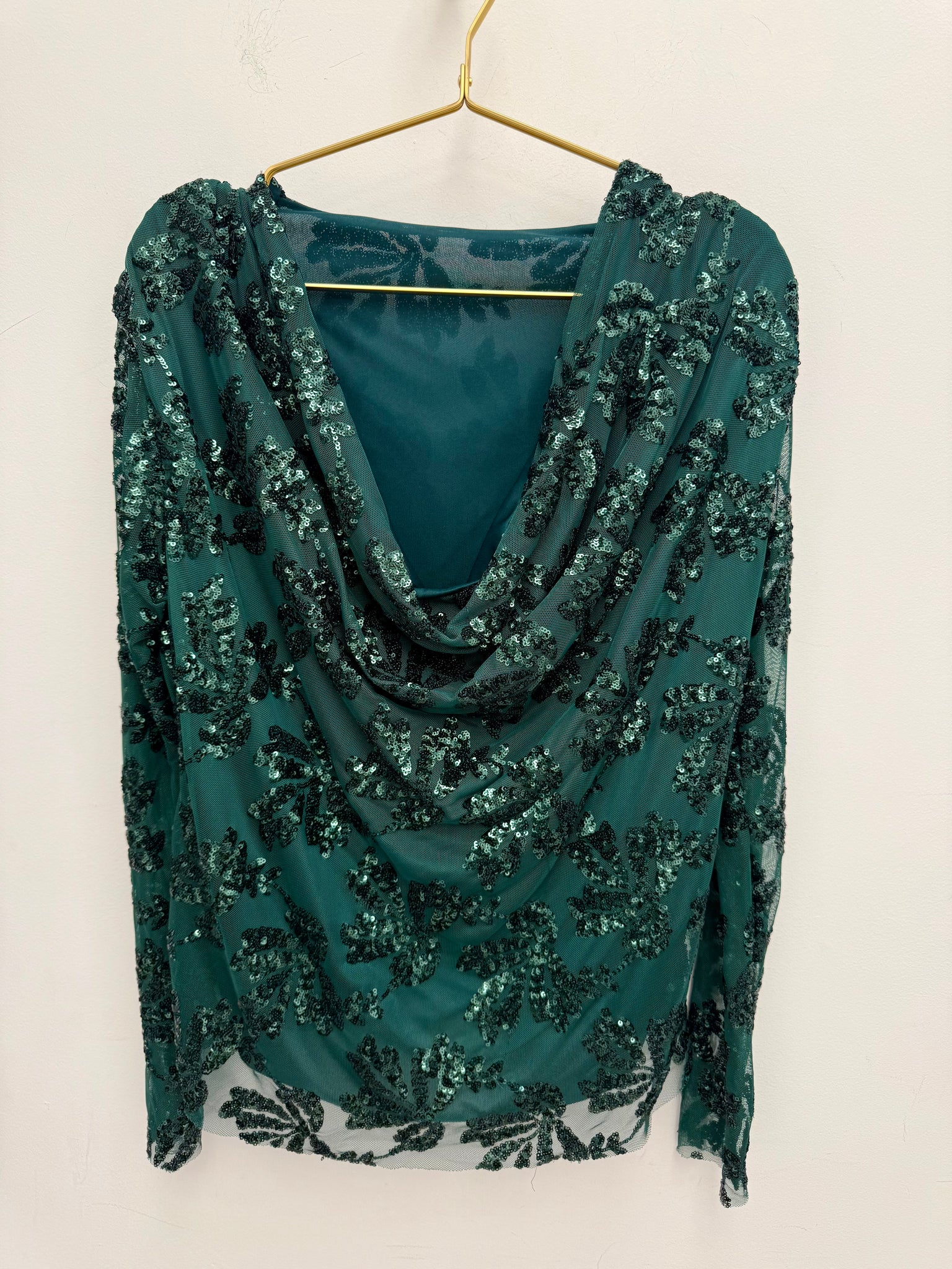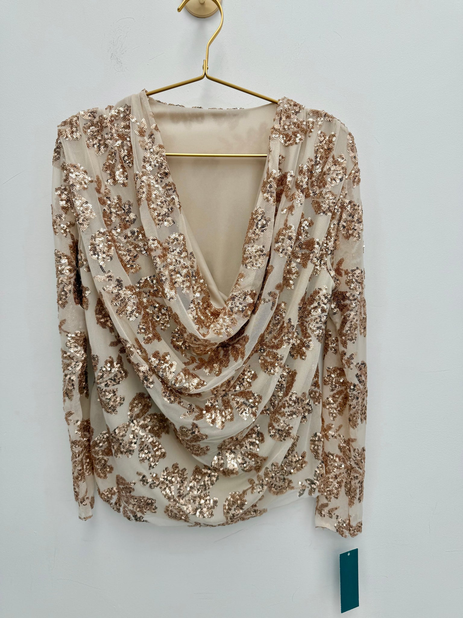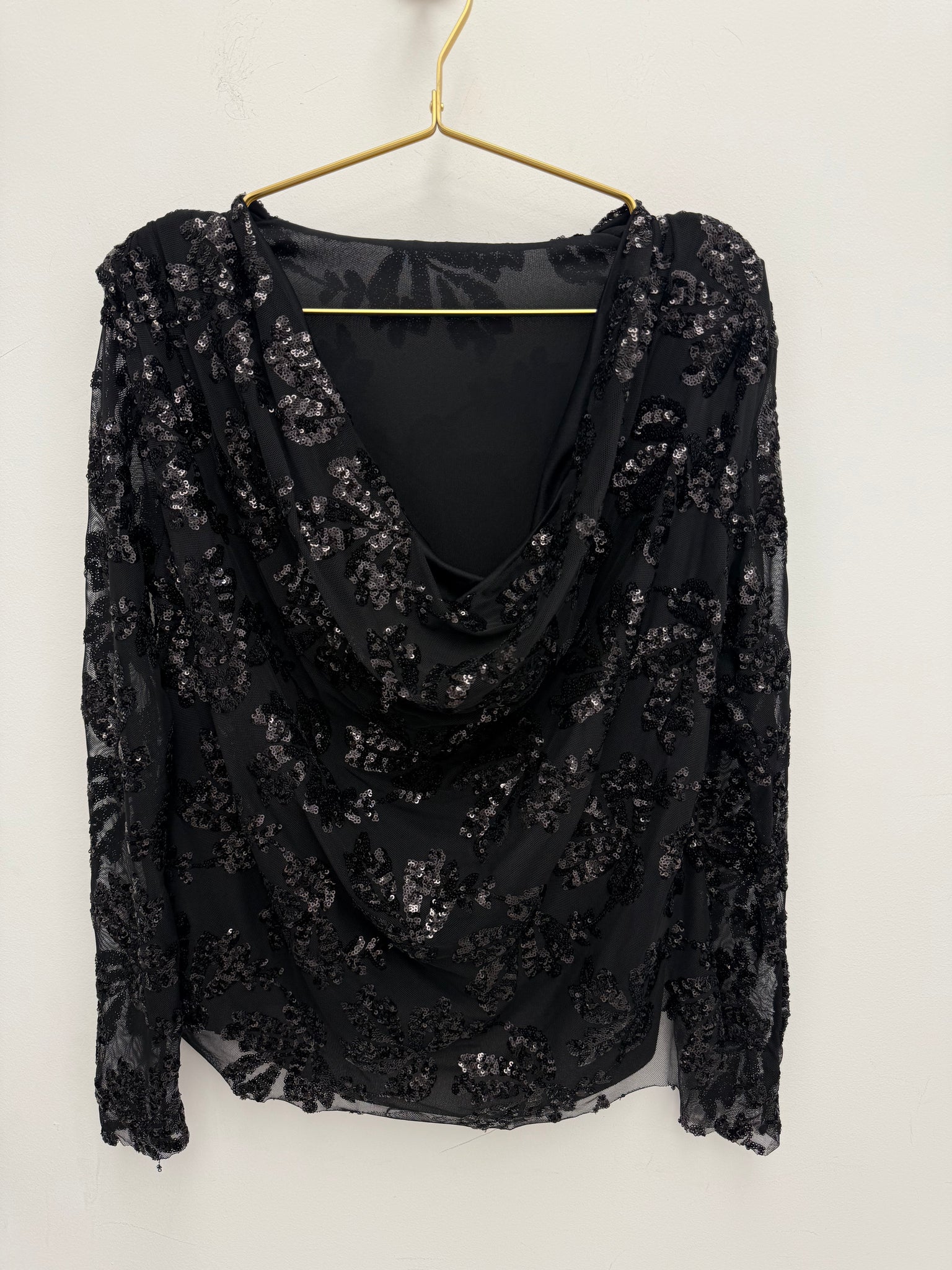 Stunning mesh sequin cowl neck top.