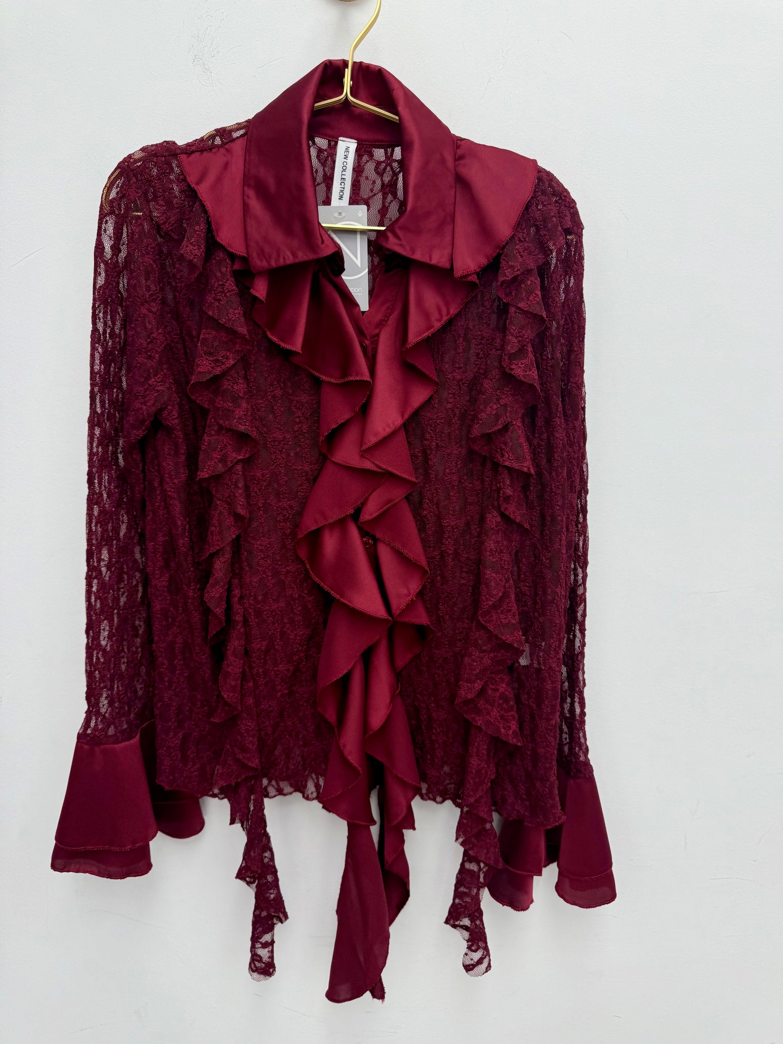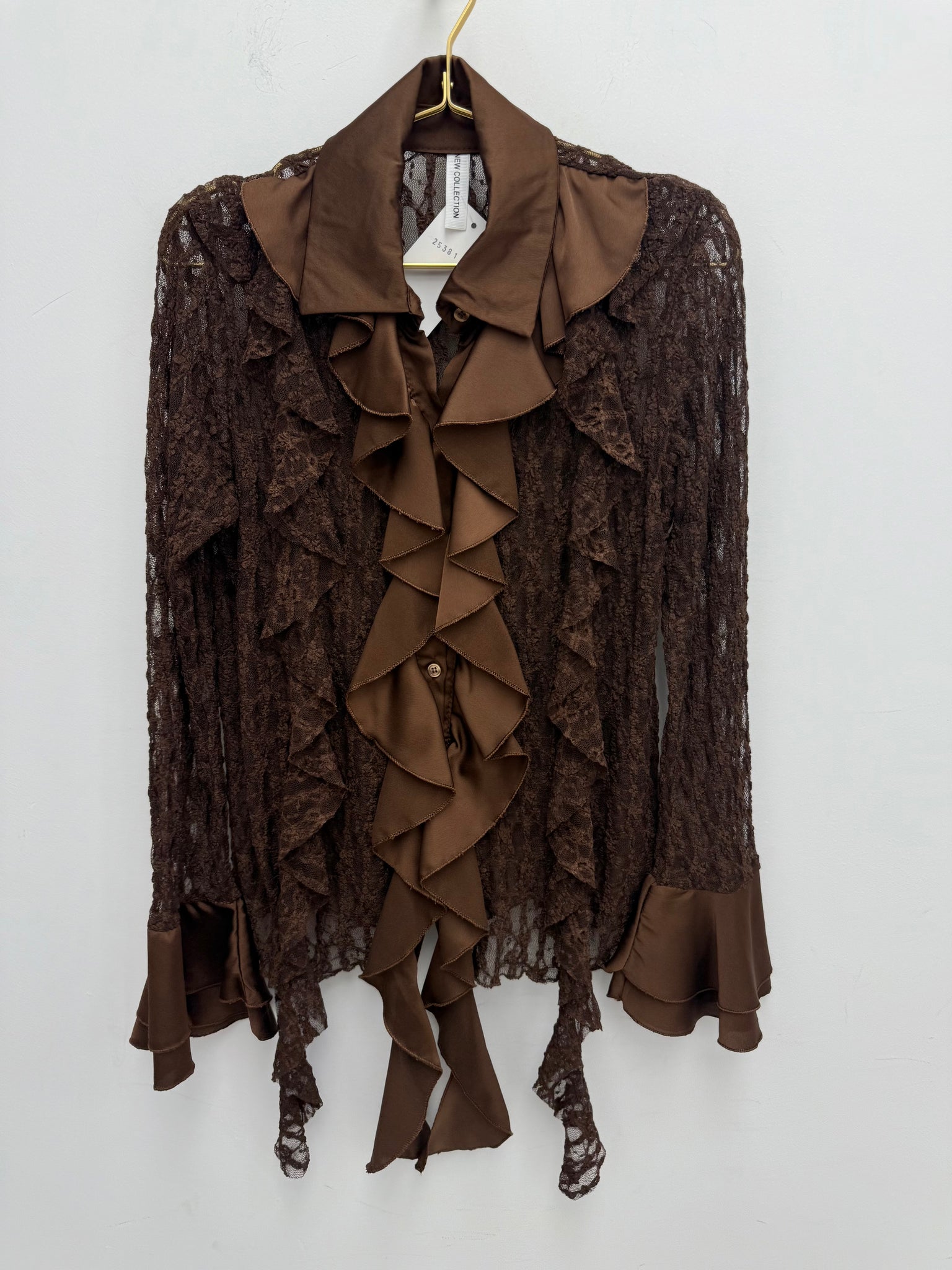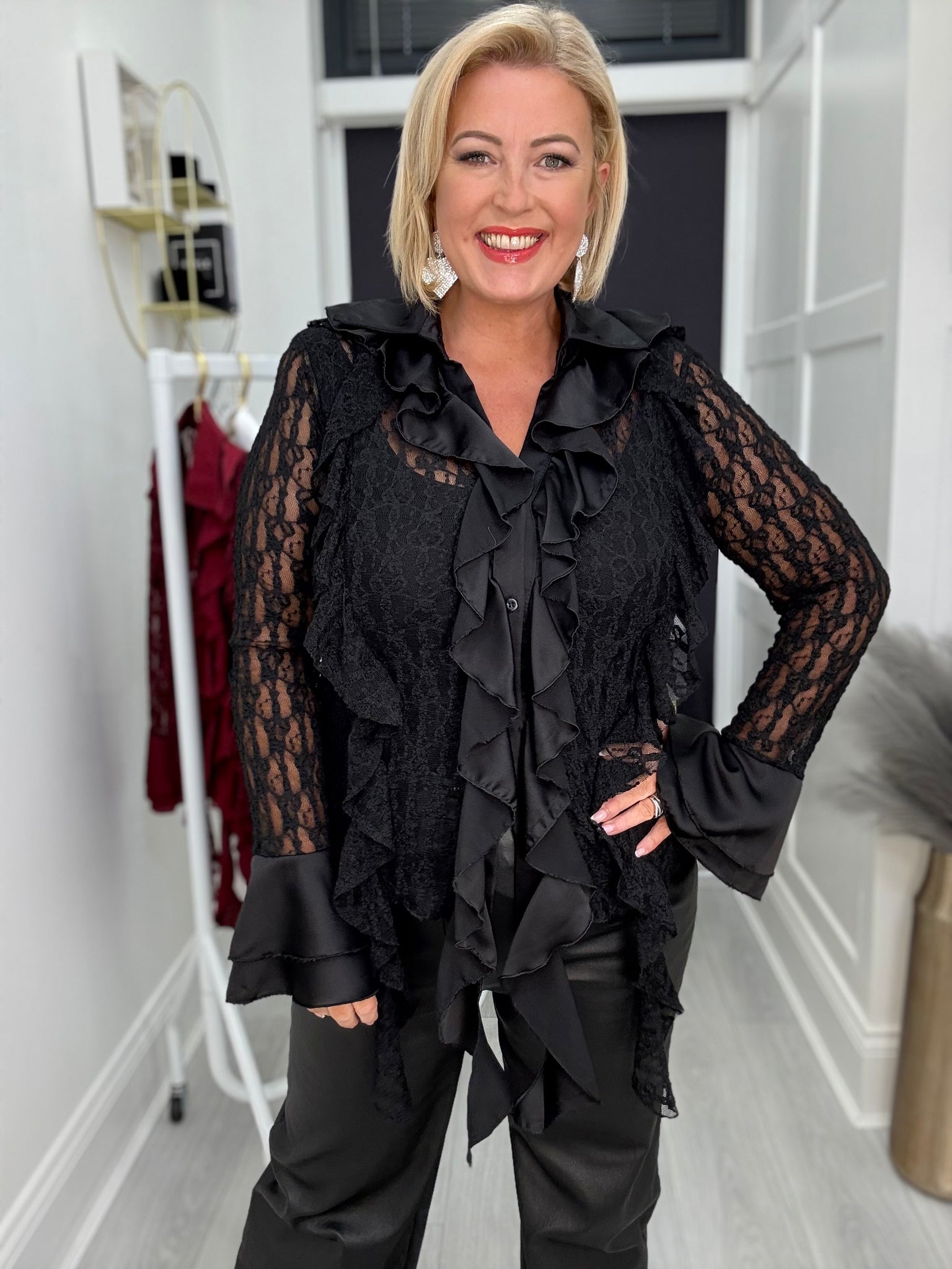 Stunning buttoned through soft super stretch lace top with satin contrast ruffles and frill cuffs.