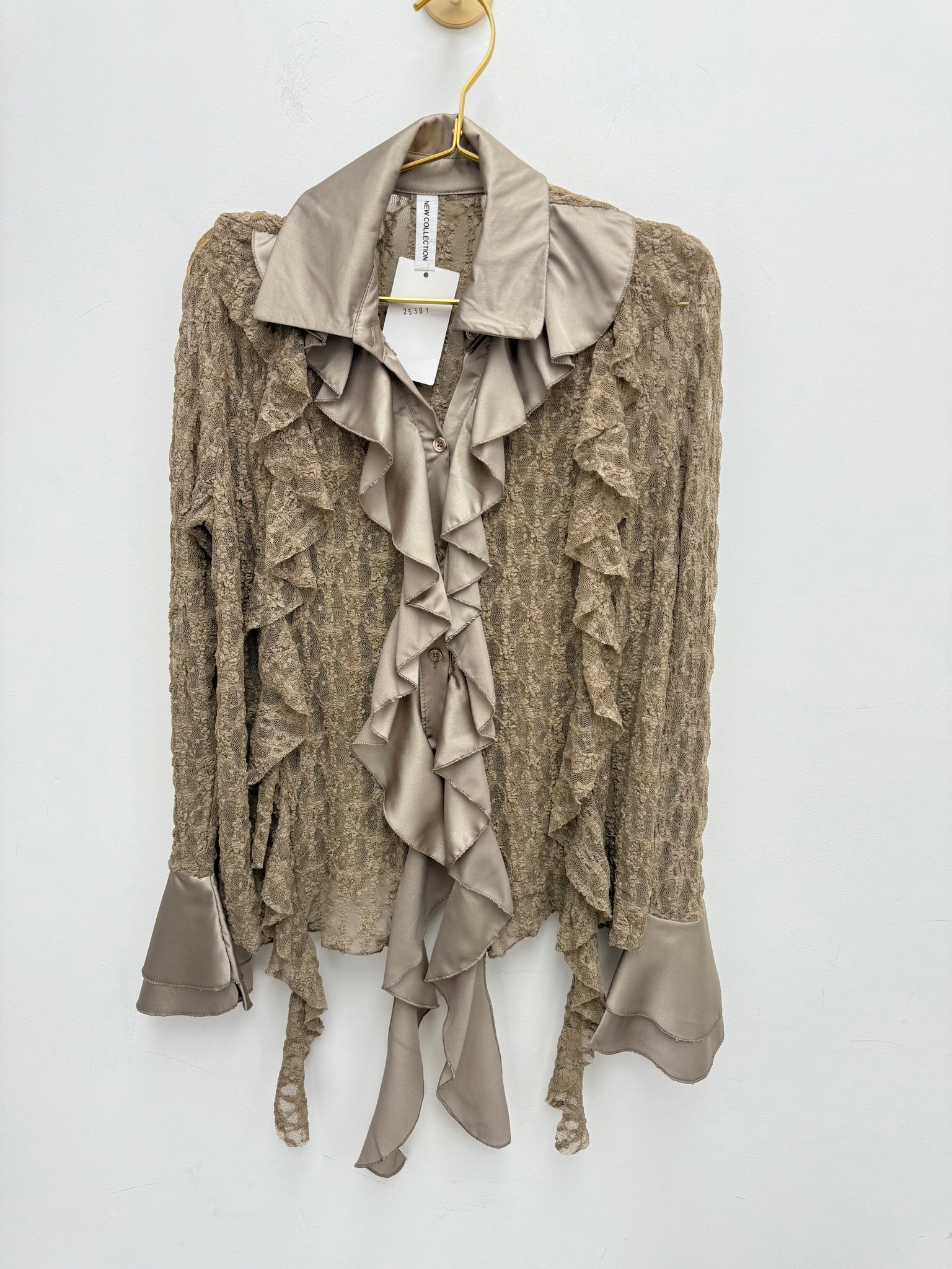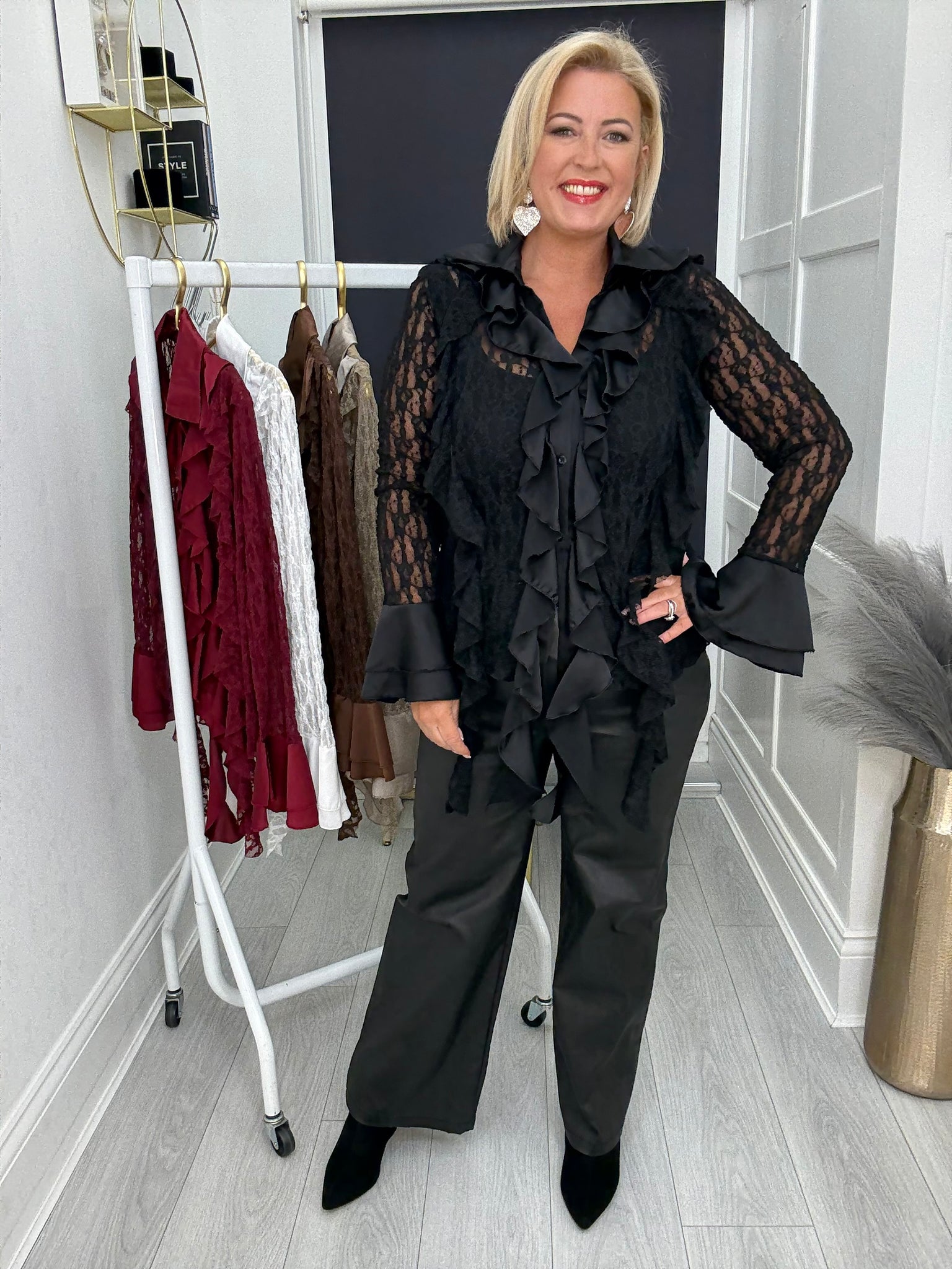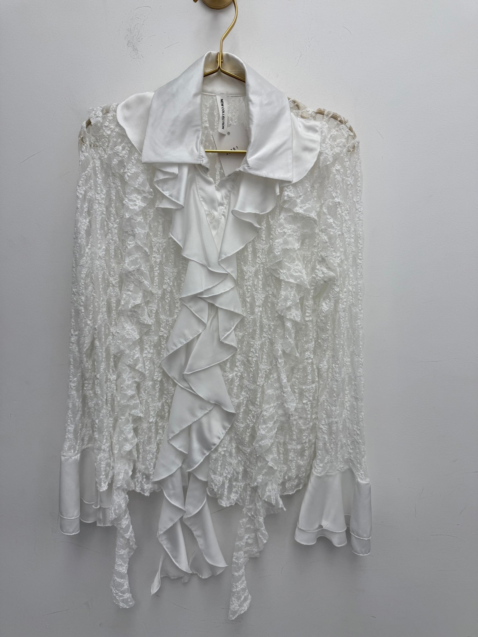 Stunning buttoned through soft super stretch lace top with satin contrast ruffles and frill cuffs.