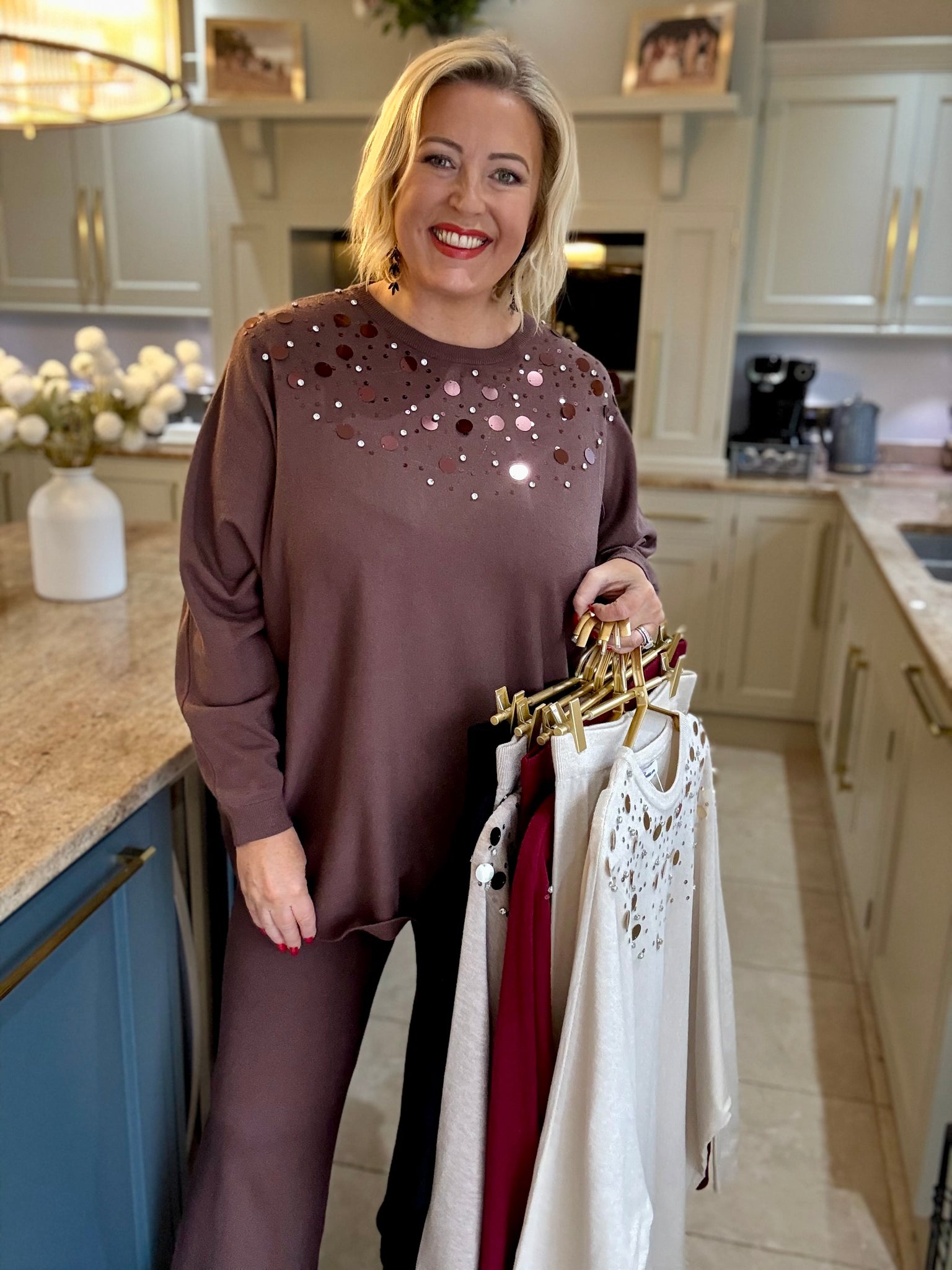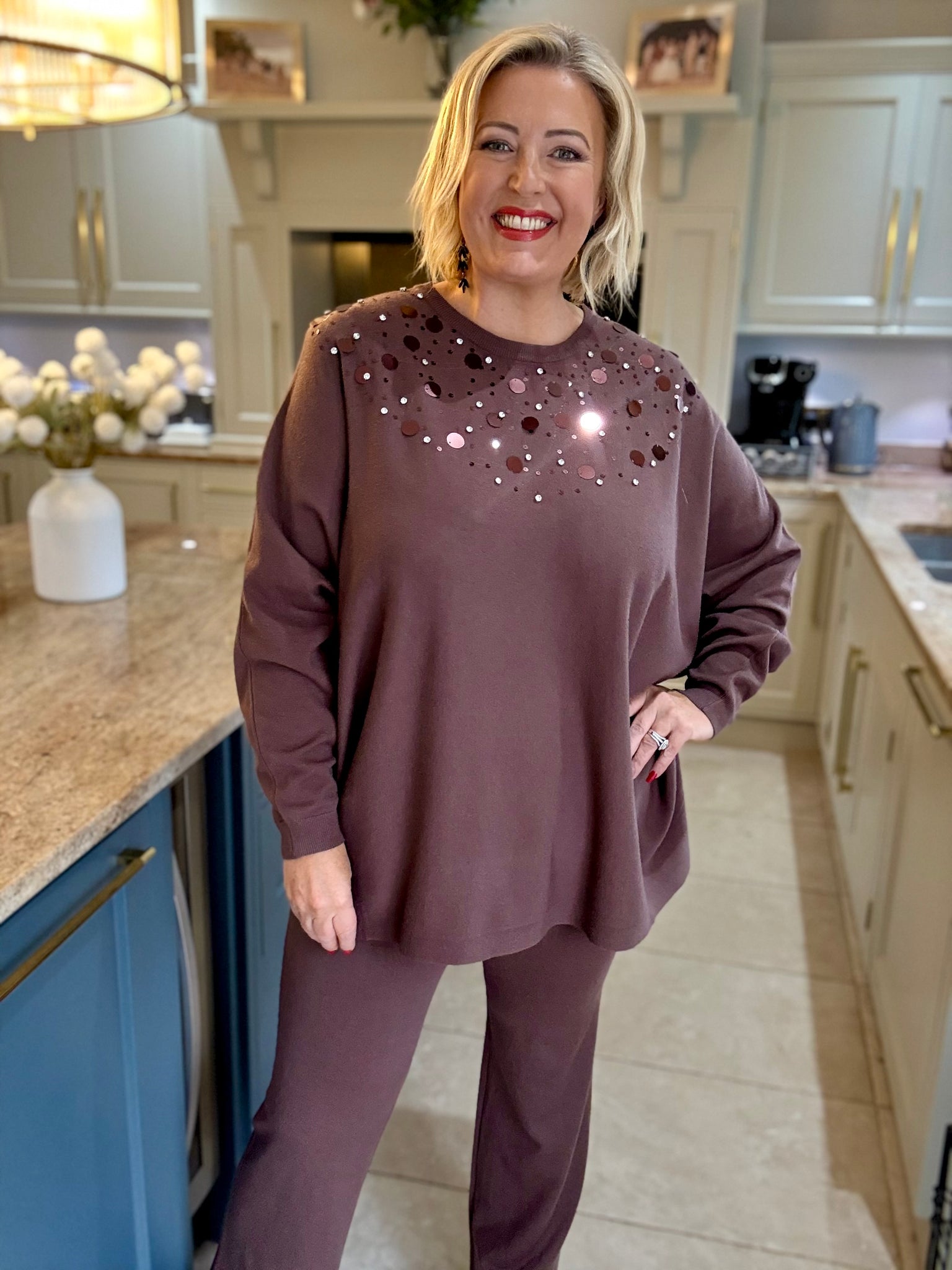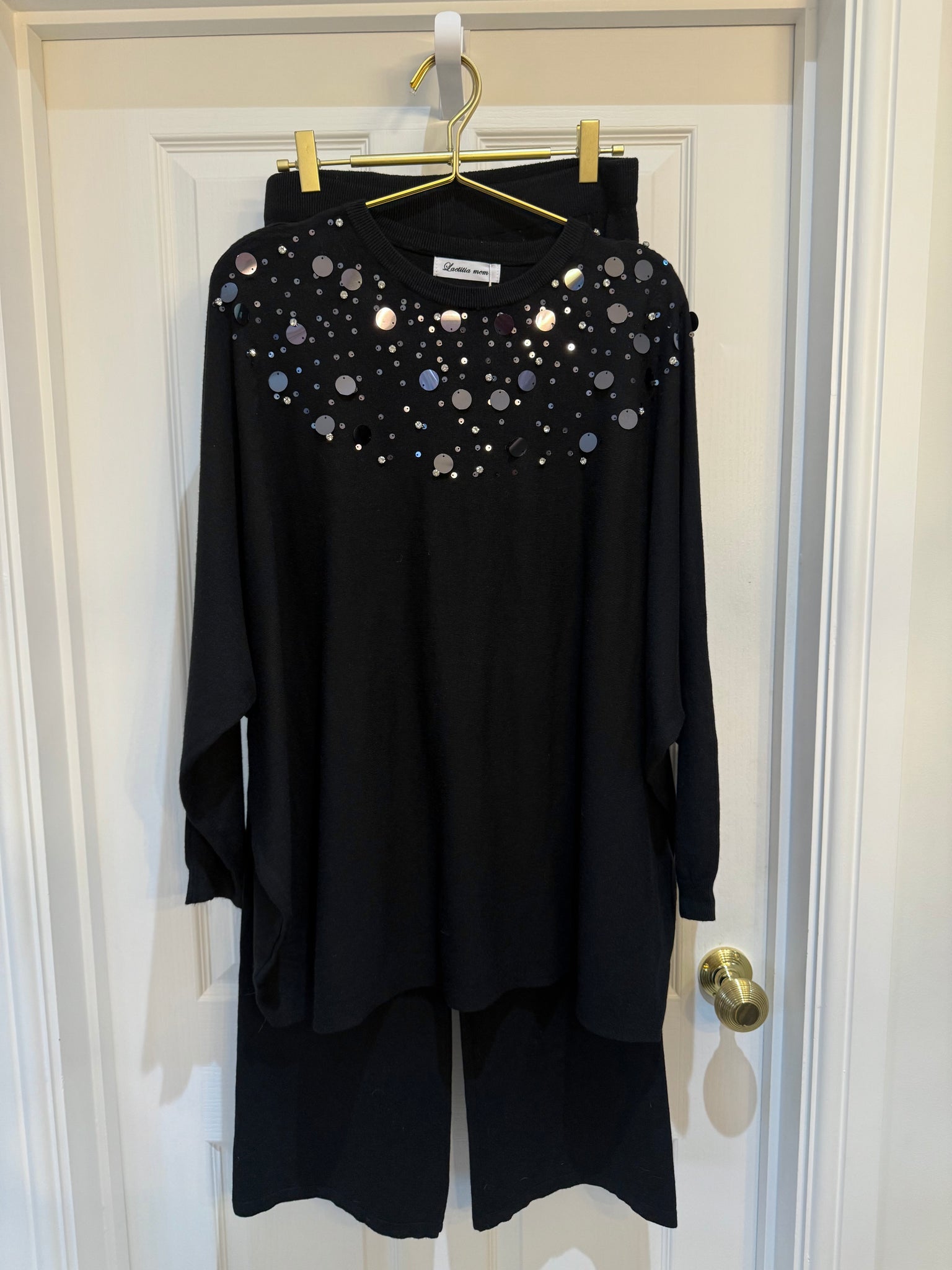 Gorgeous soft loose fit jumper with disc sequins, crystals and matching high waisted trousers.