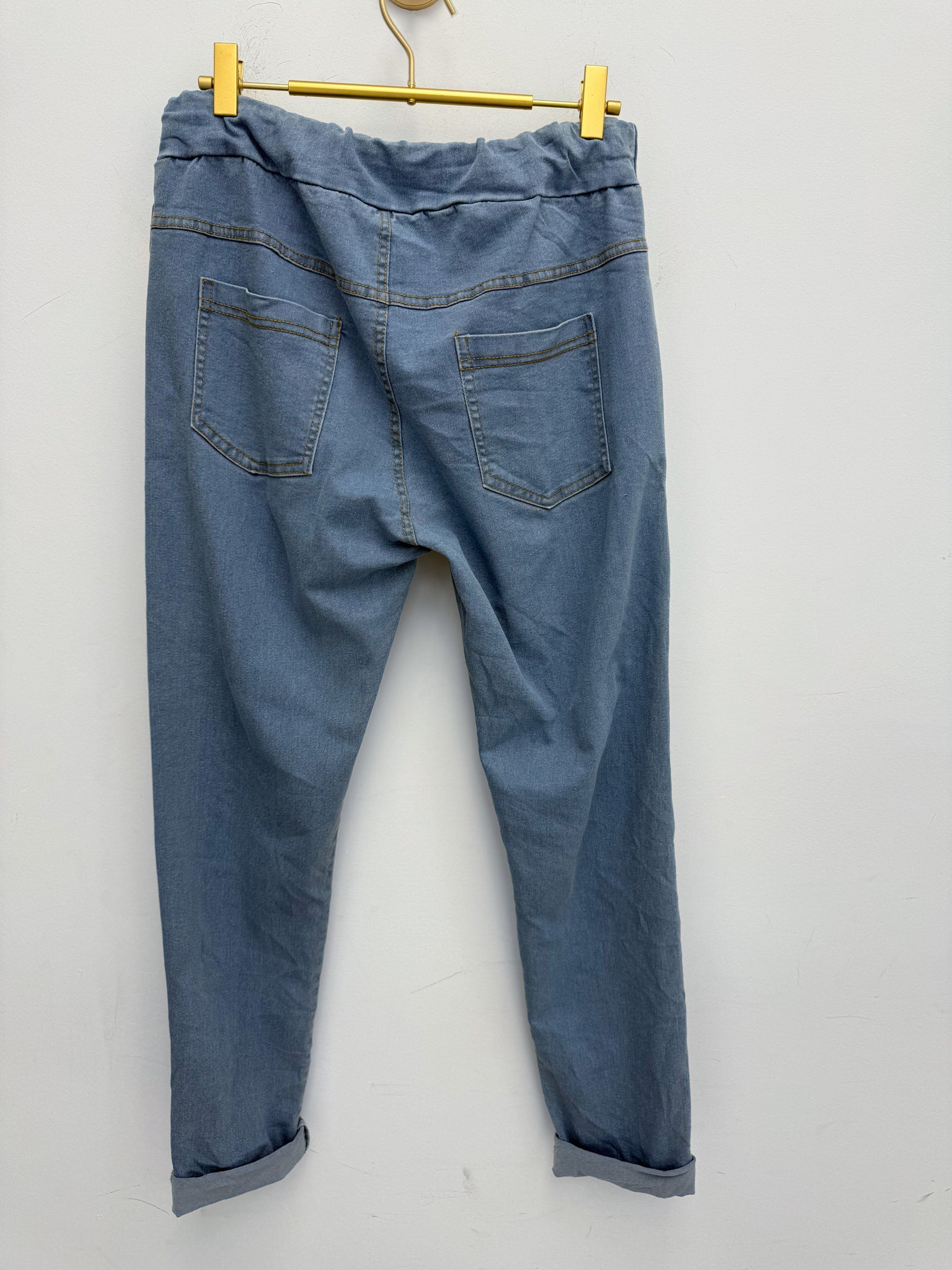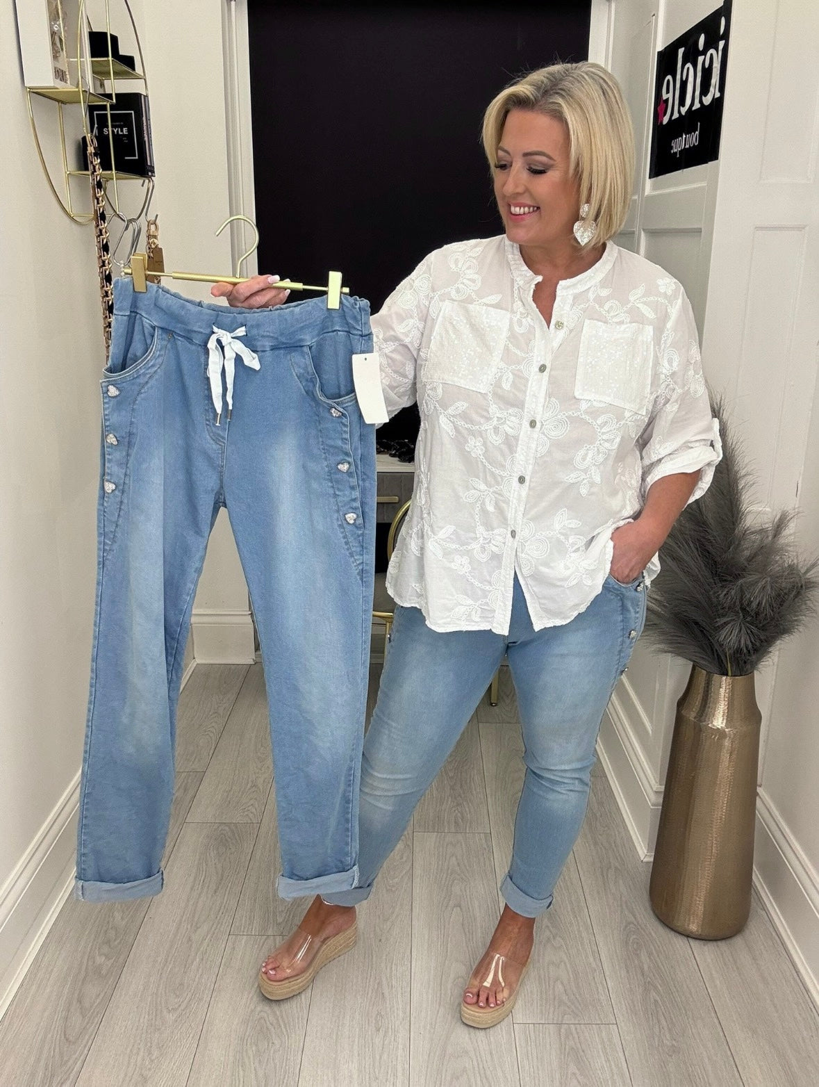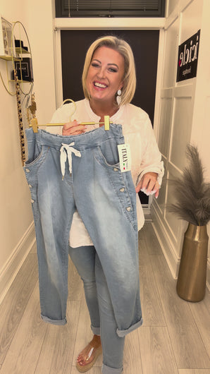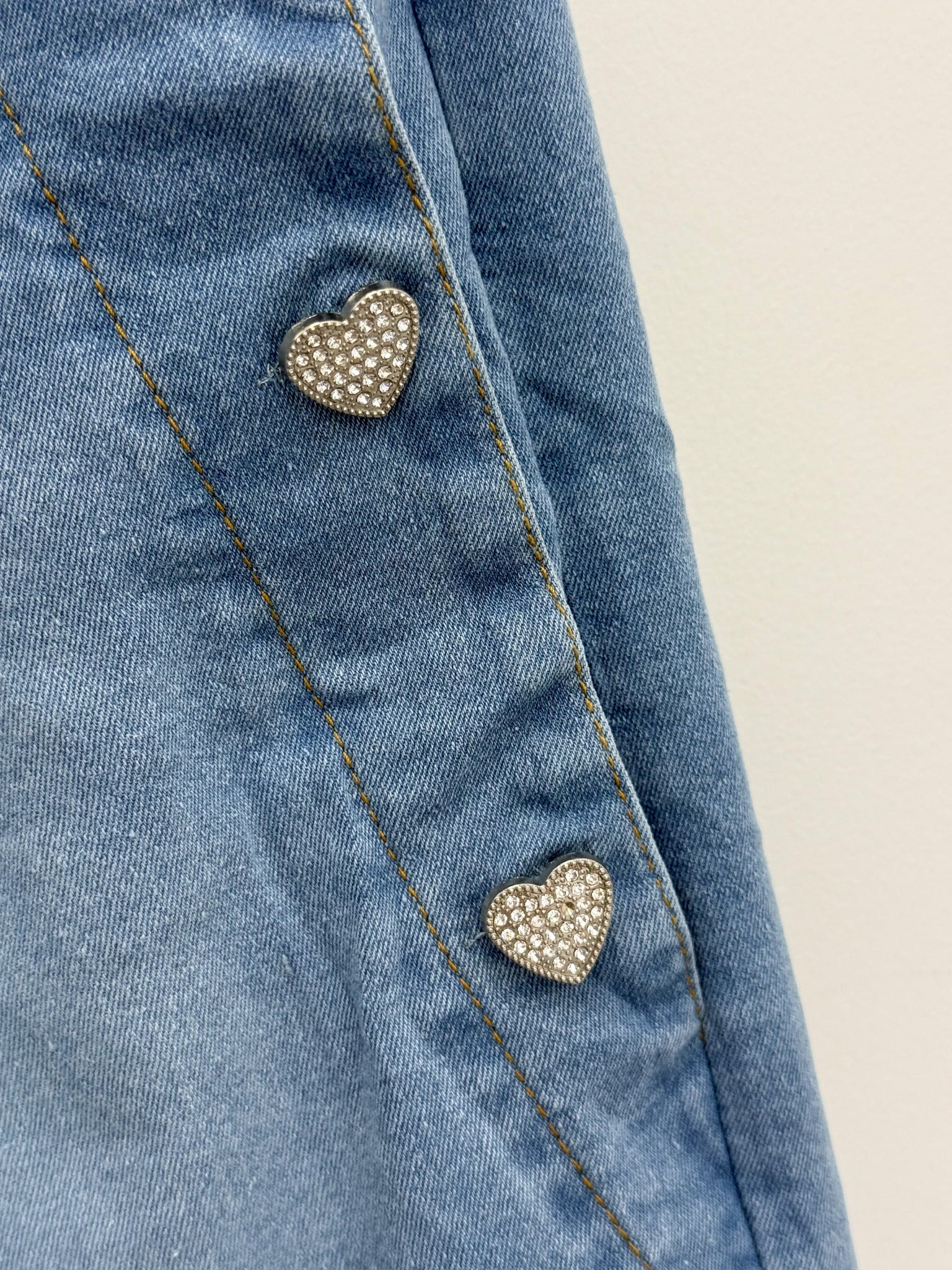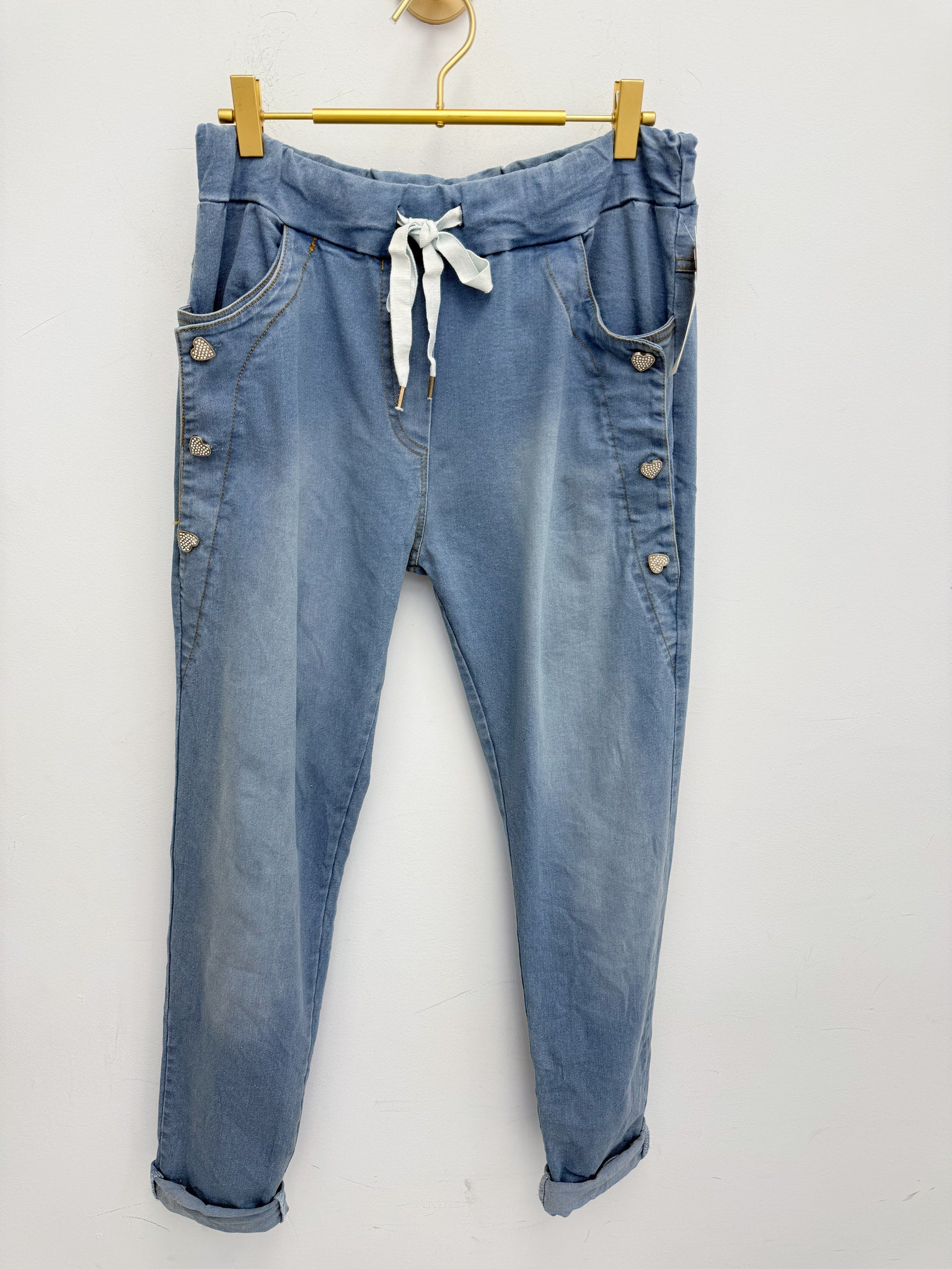 Stunning super stretch high waist jeans with pockets, crystal heart buttons and roll up or down hems.