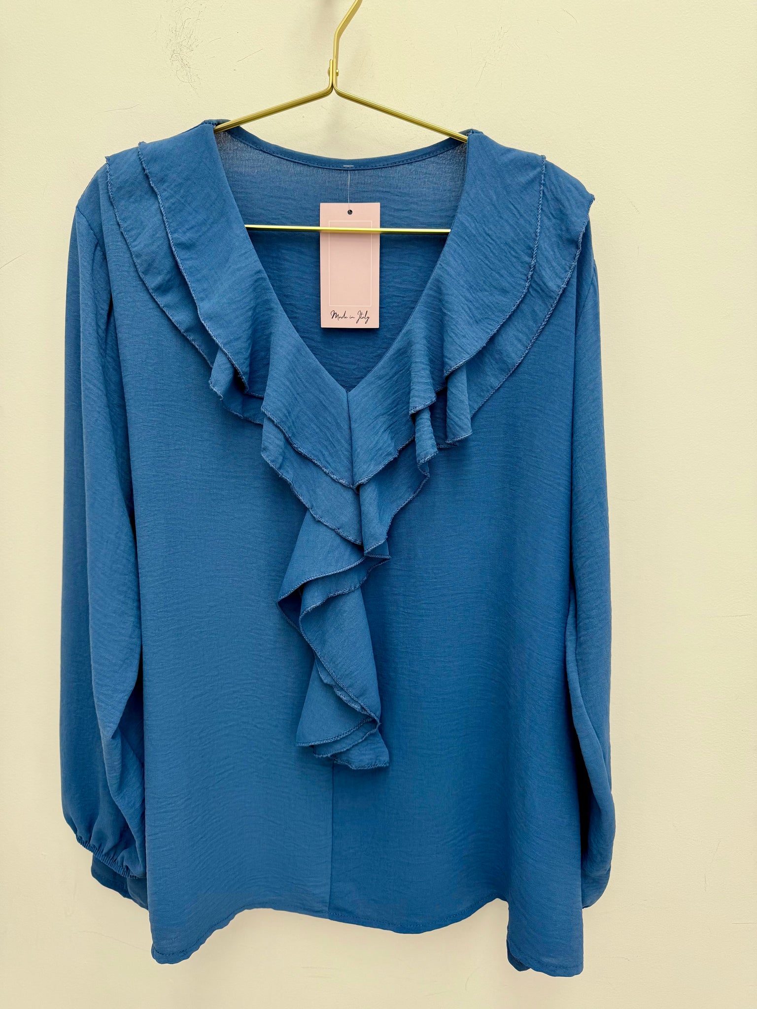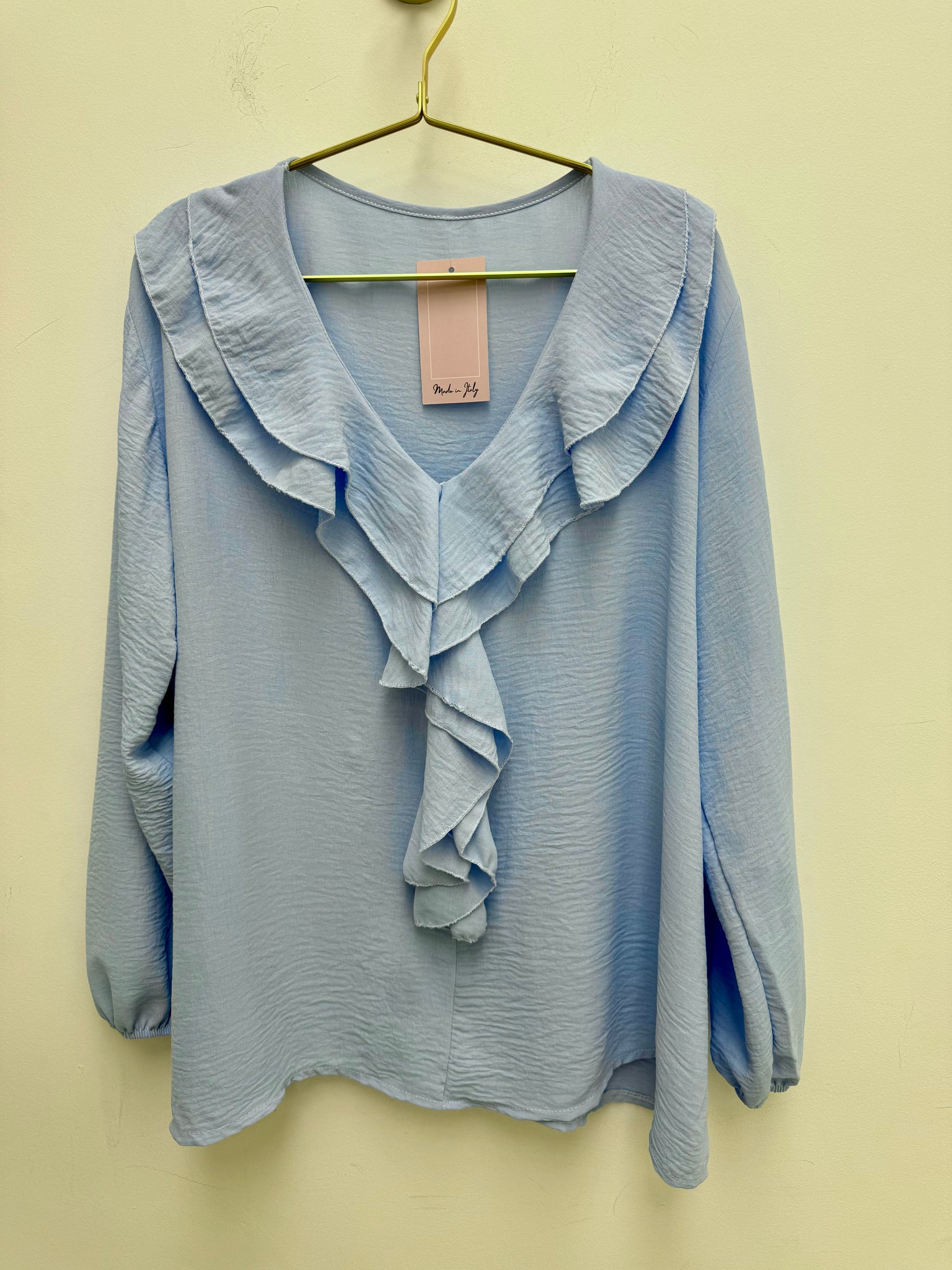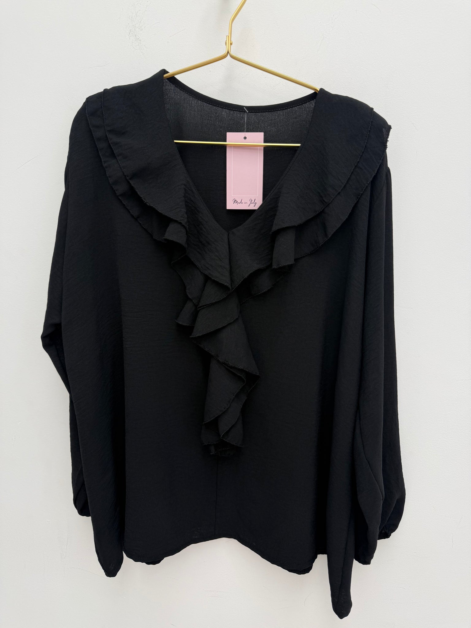 Stunning non crease ruffle neckline top with elasticated cuffs.