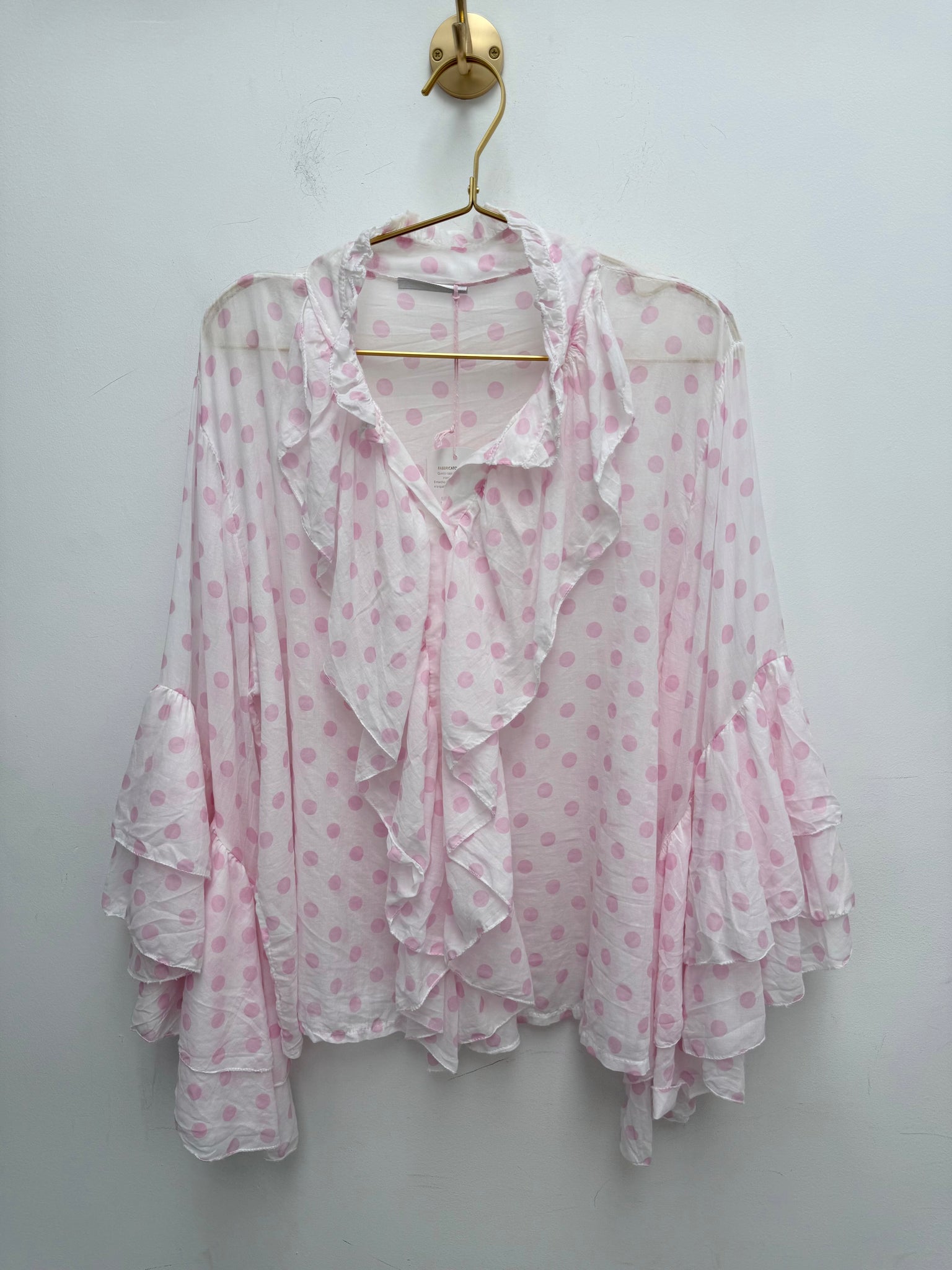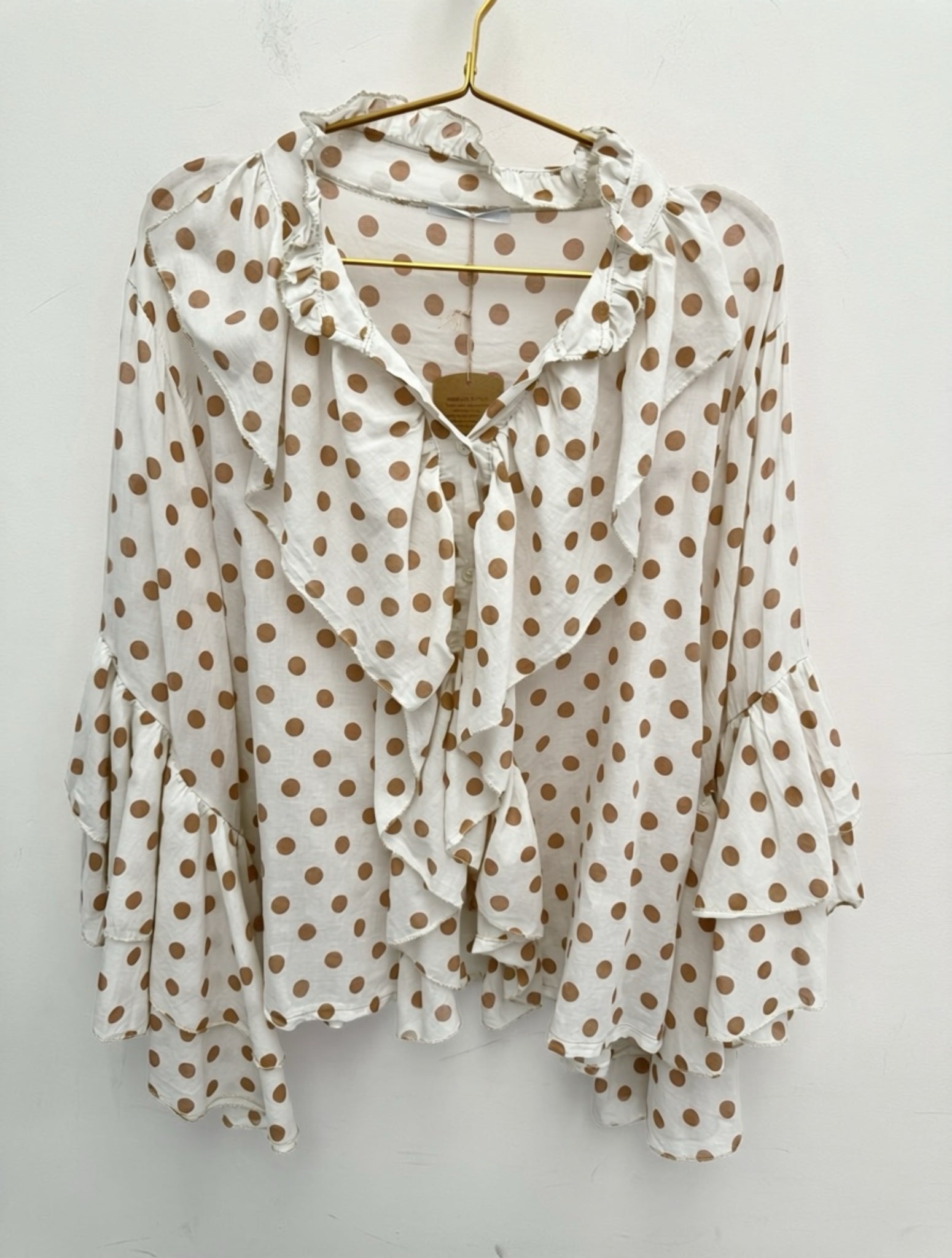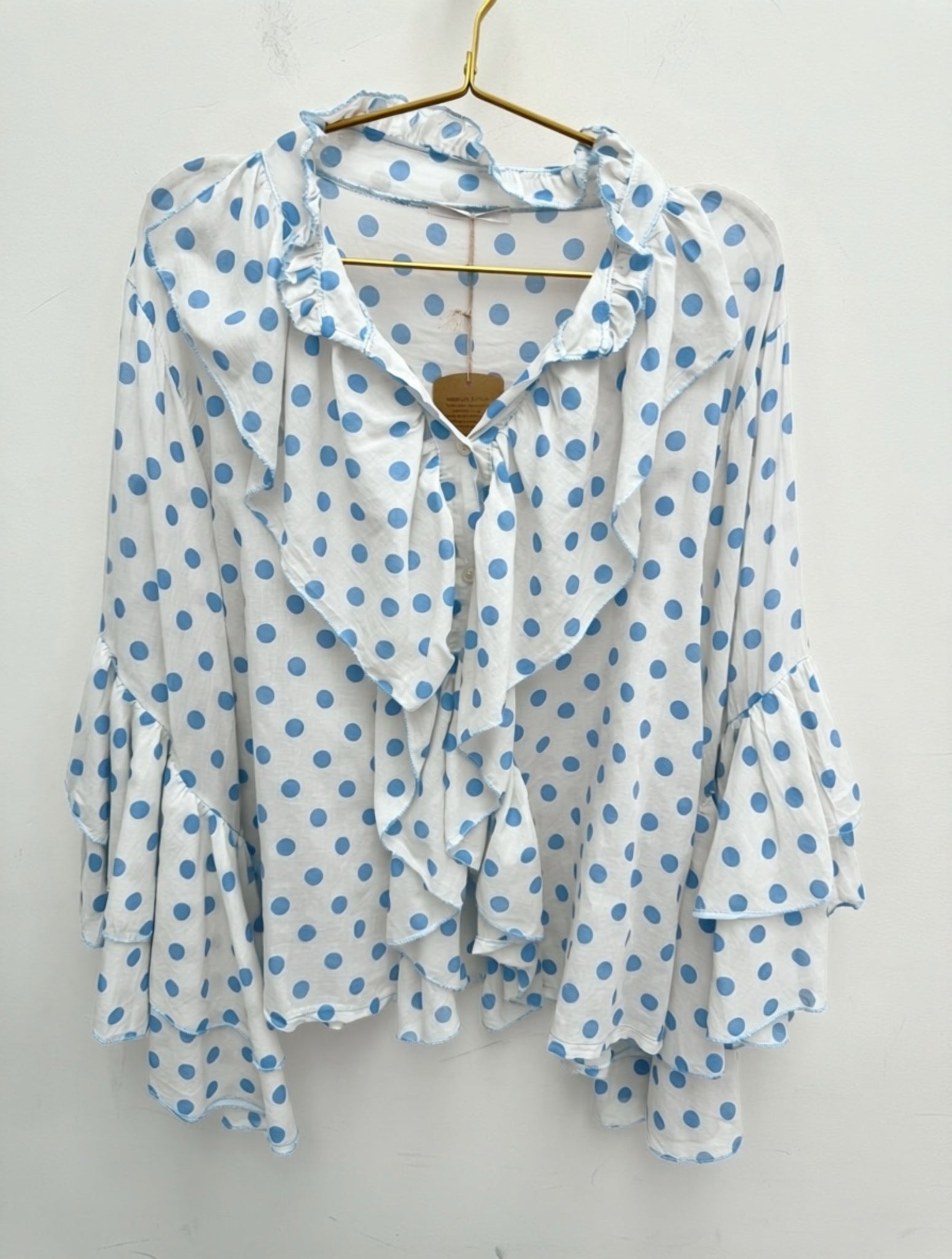 Stunning light cotton ruffle neckline button through top with fluted frill sleeves.
