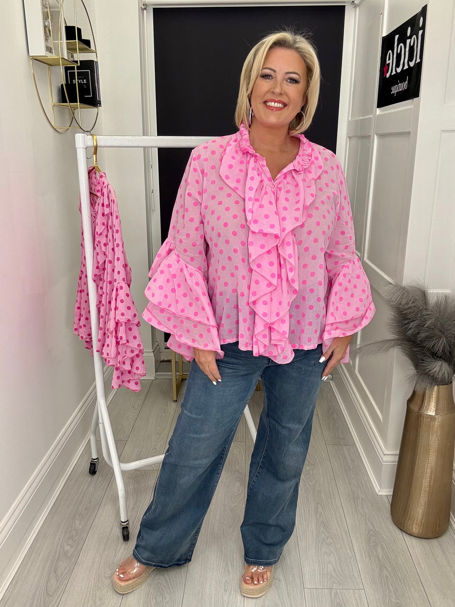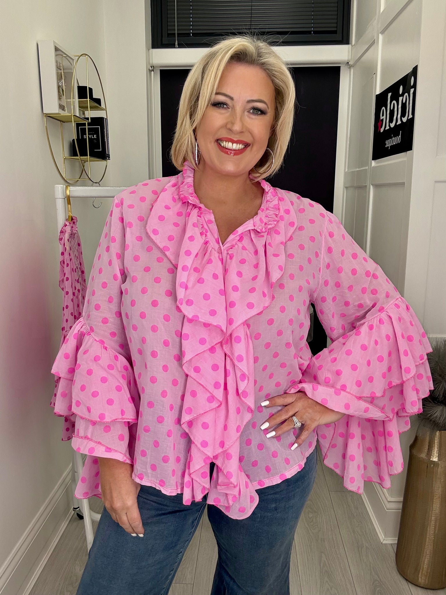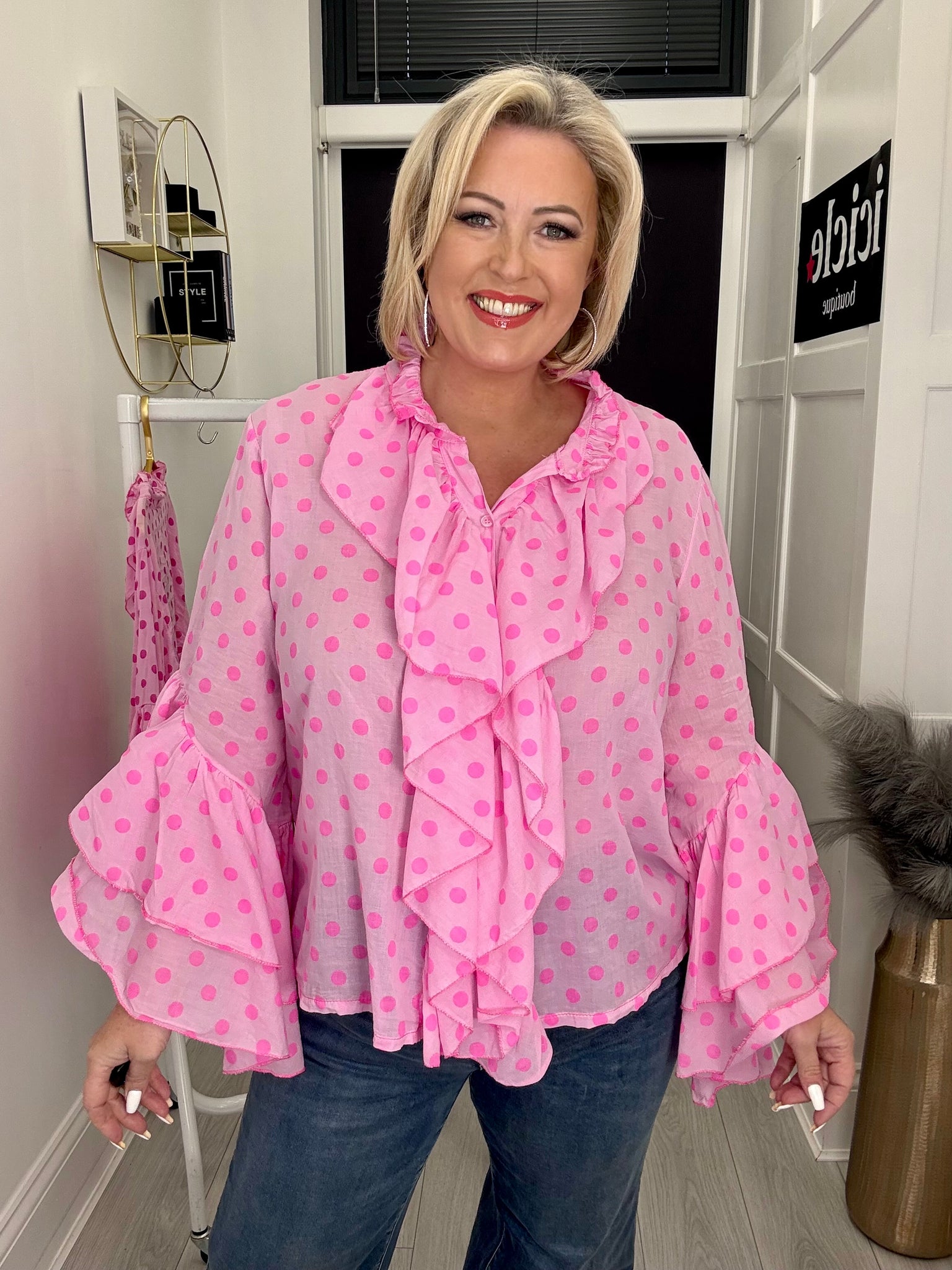Stunning light cotton ruffle neckline button through top with fluted frill sleeves.