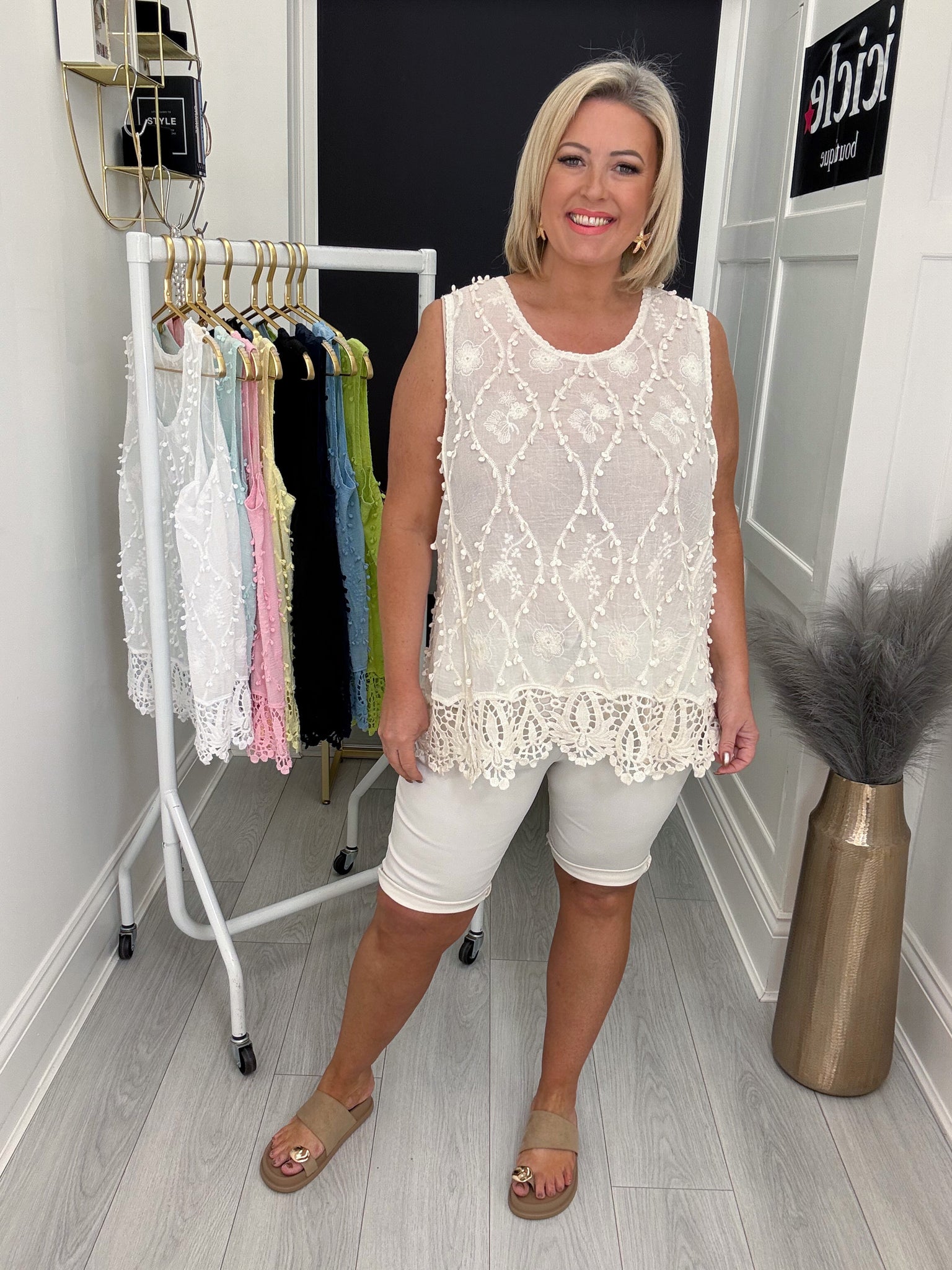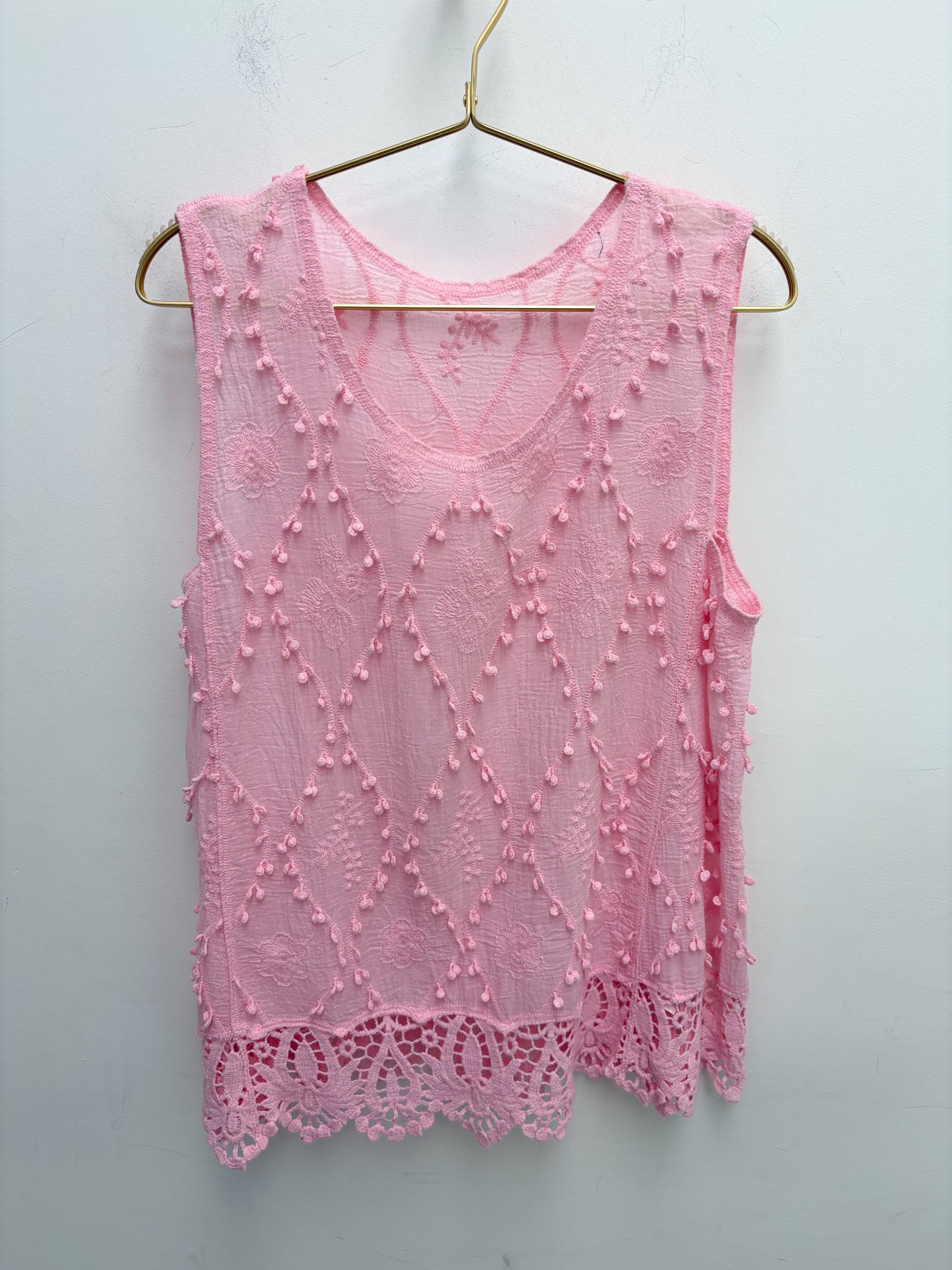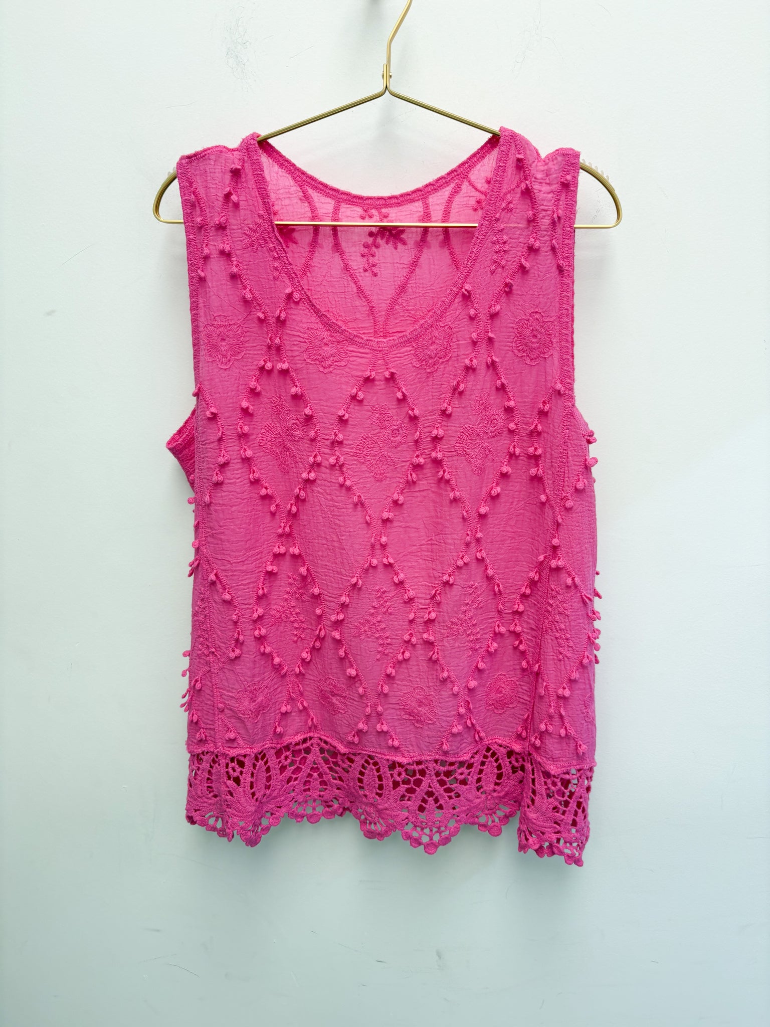 Pretty embroidered appliqué pom pom top with crochet hem.