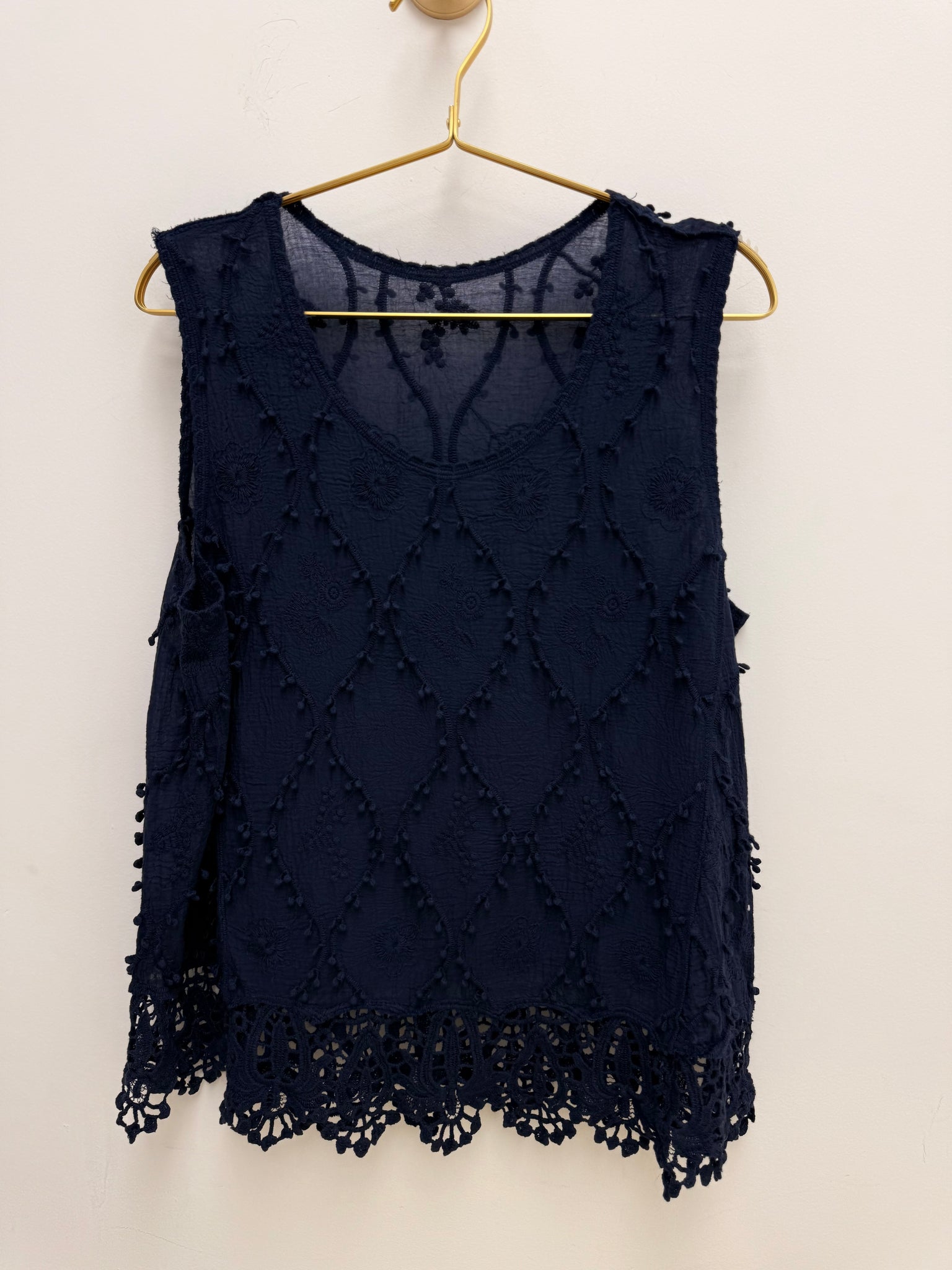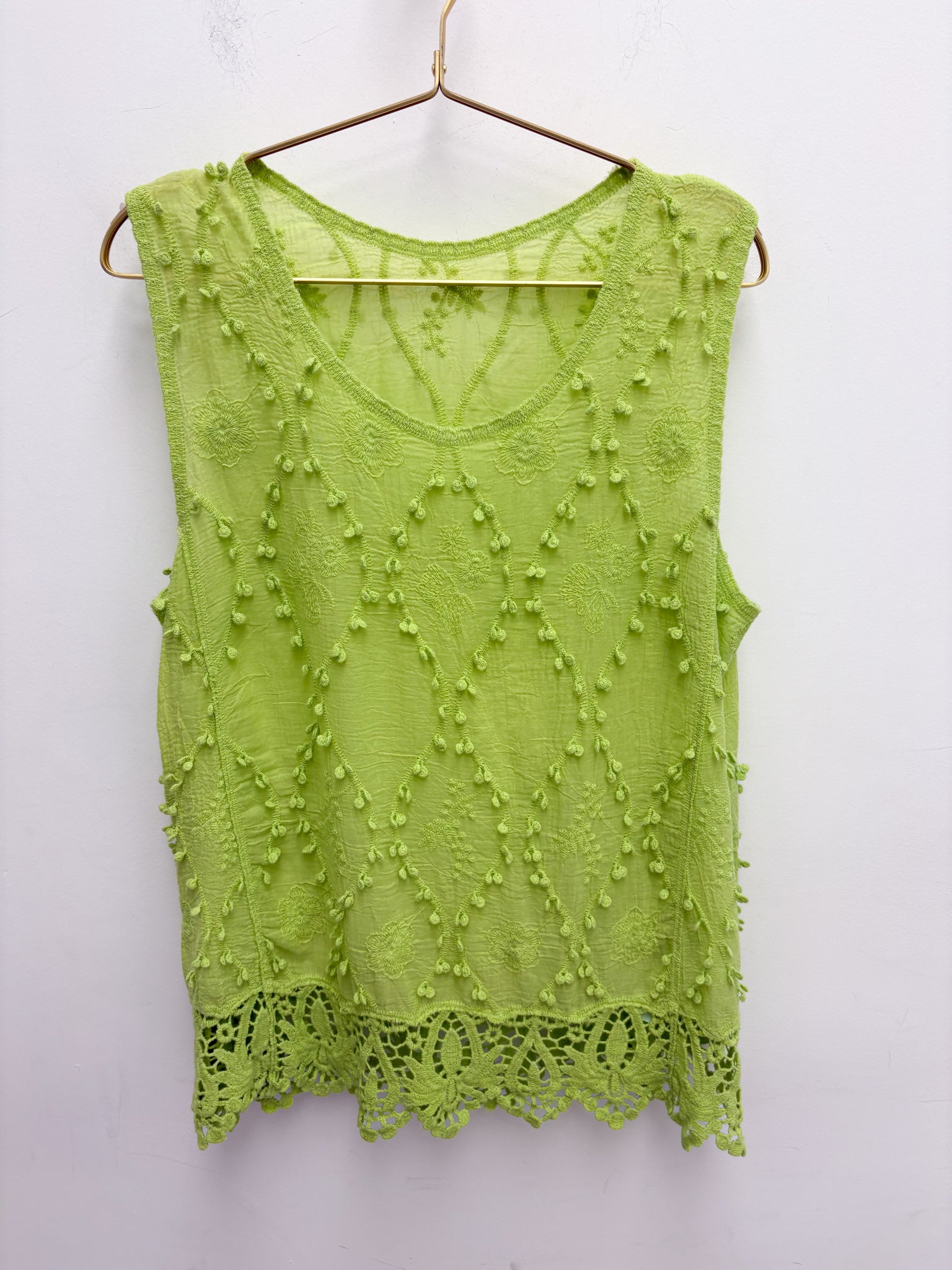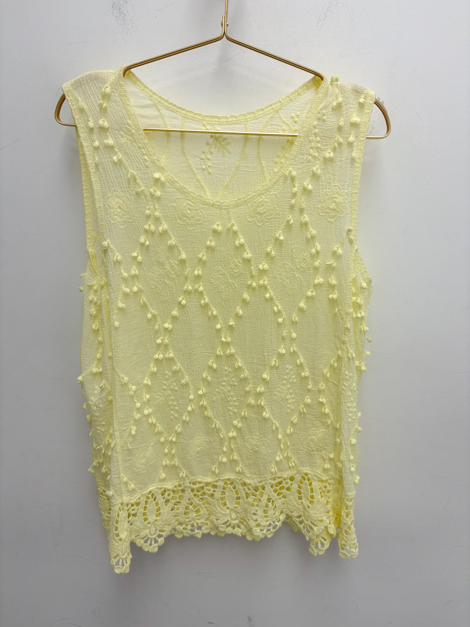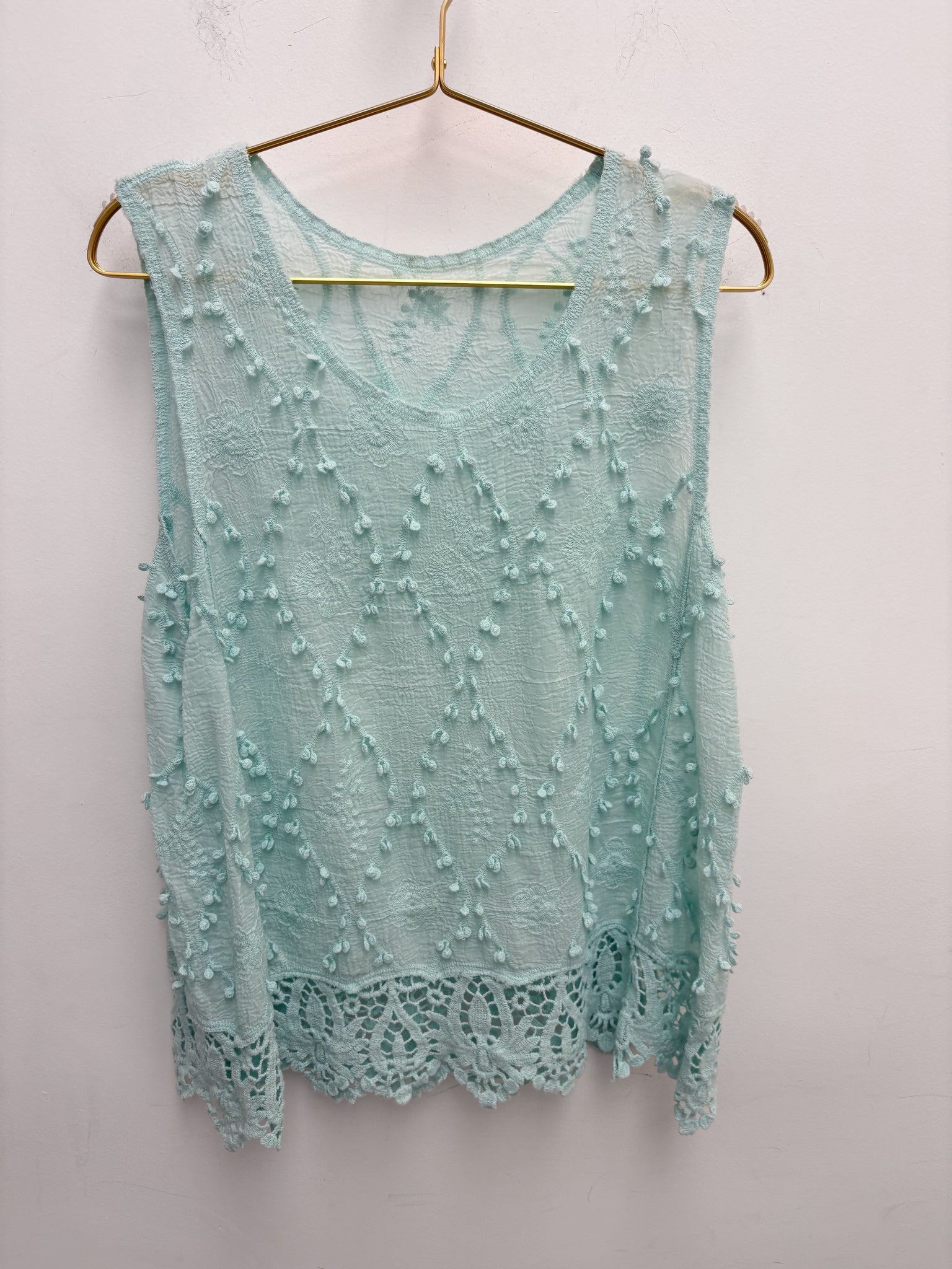 Pretty embroidered appliqué pom pom top with crochet hem.