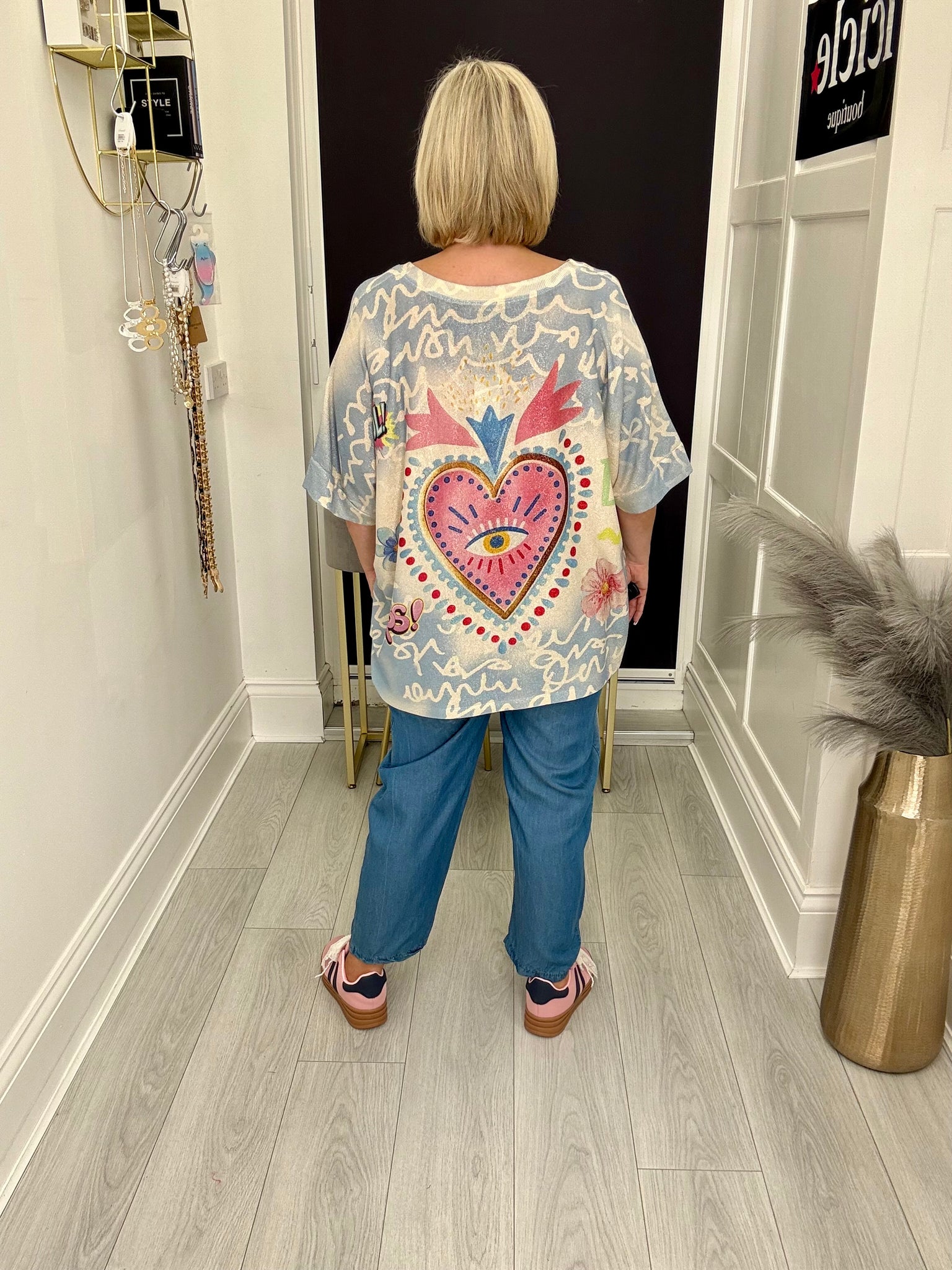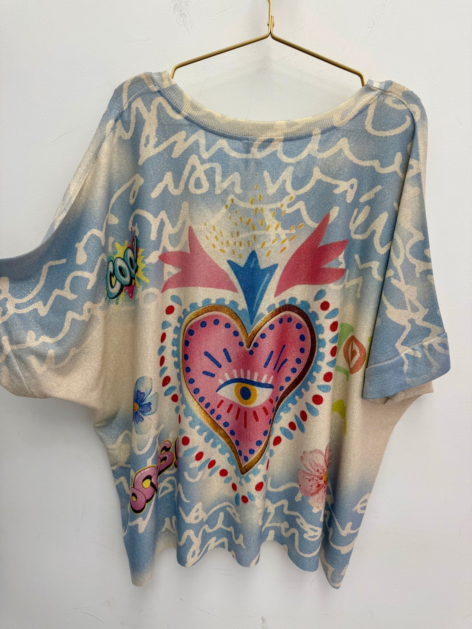 Gorgeous soft stretch dip back subtle shimmer lurex oversized top.