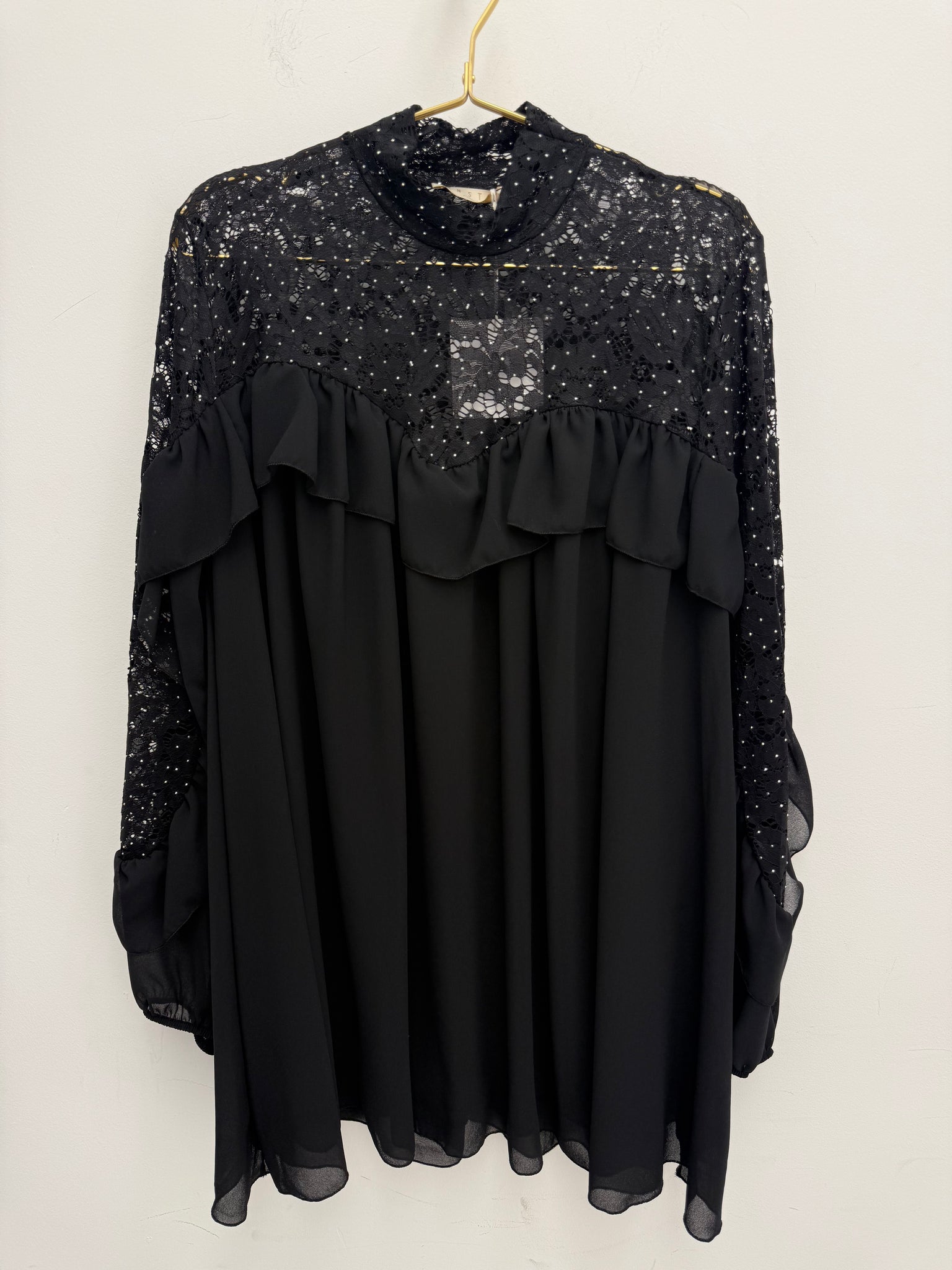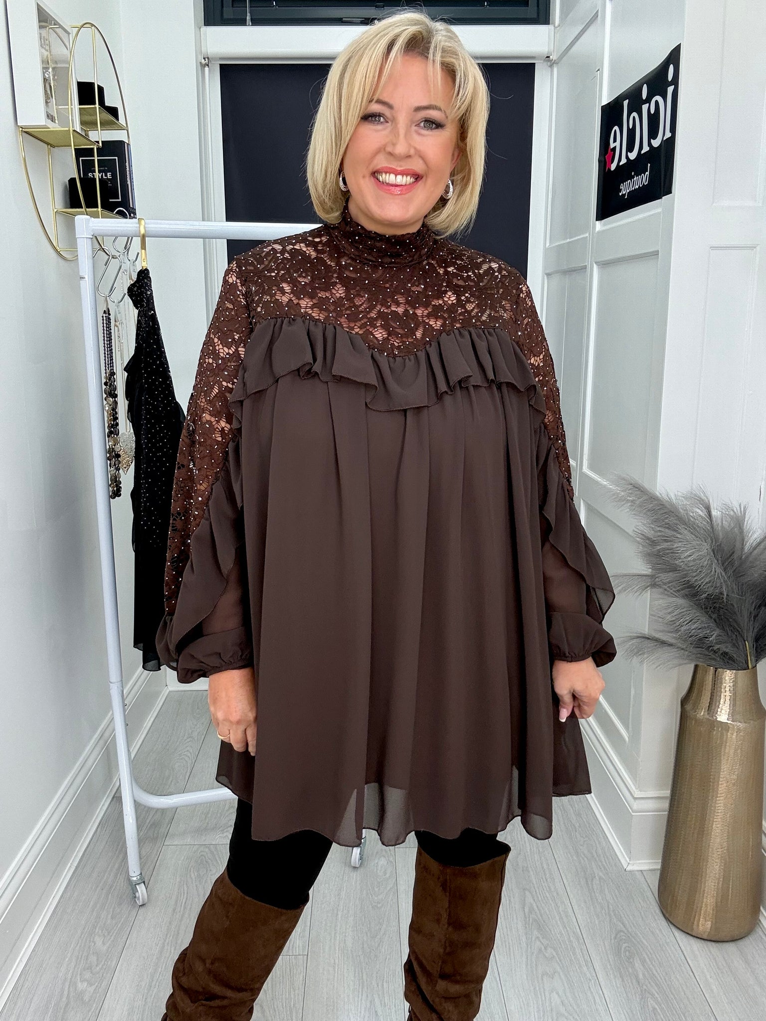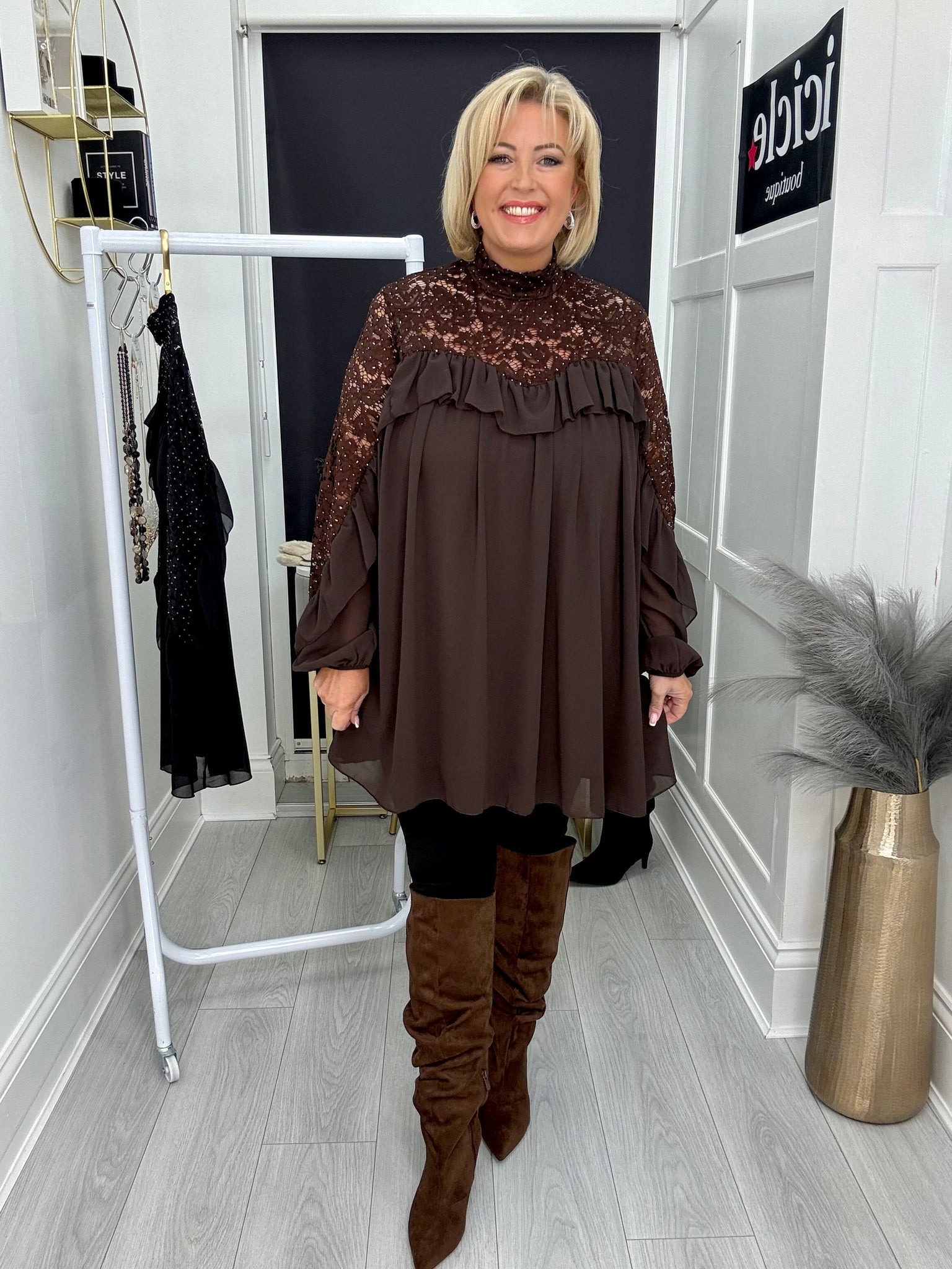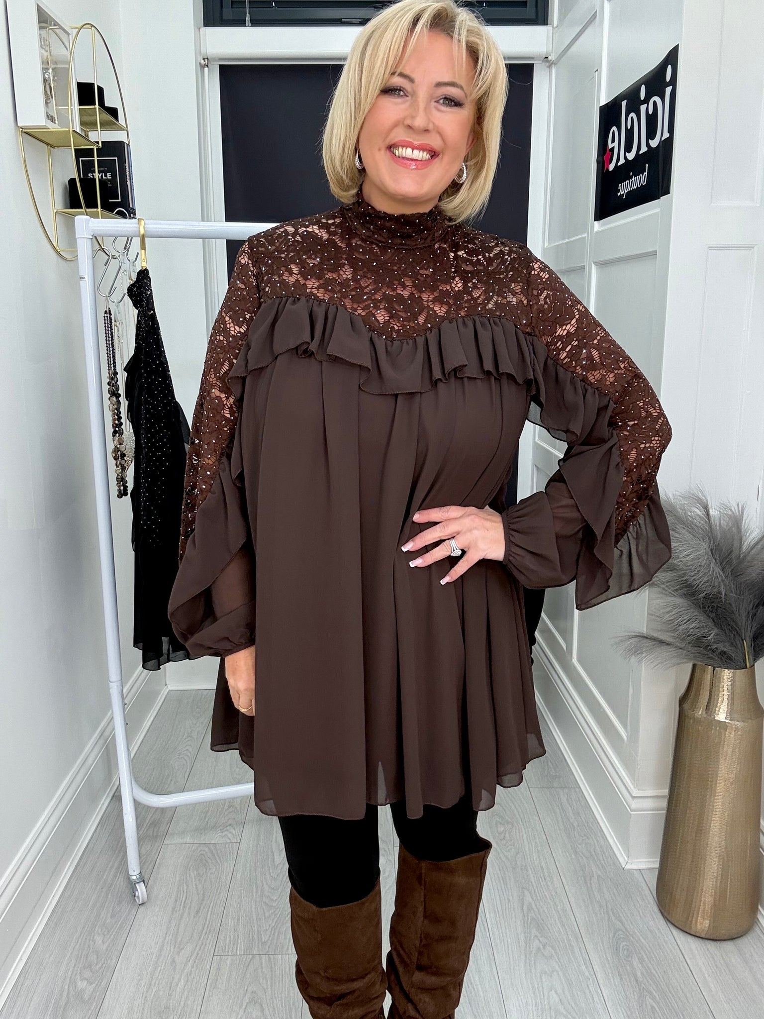 Stunning long chiffon frill top with lace/crystal detail and attached stretch lining.