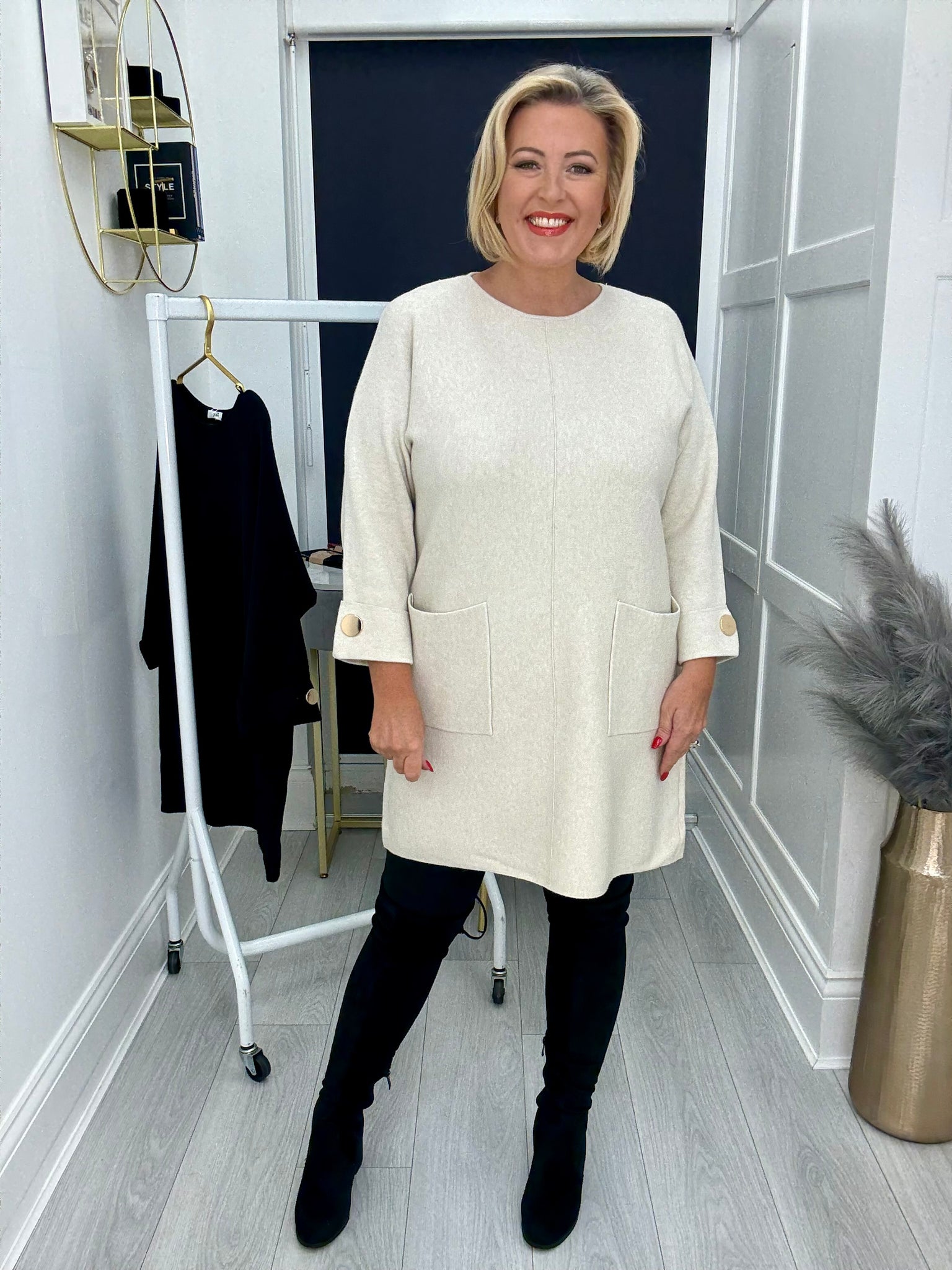 Stunning luxe quality shift jumper dress with pockets and oversized gold buttons.