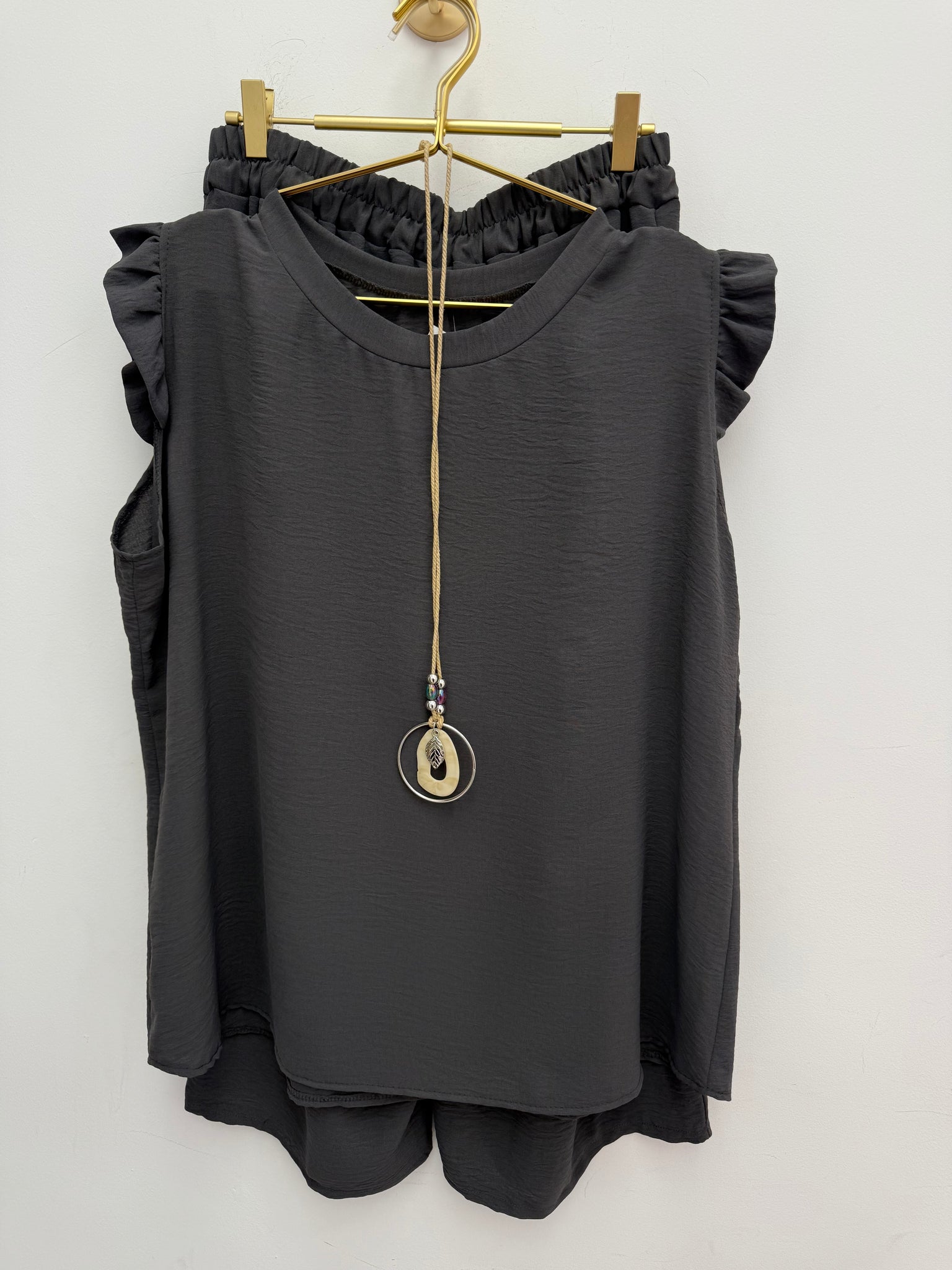Gorgeous frill sleeve dip back top with matching high waisted stretch waistband crop trousers with pockets.